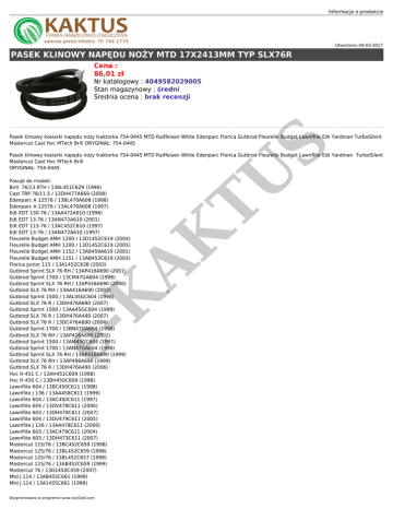 Informacje o produkcie Utworzono 04-03-2017 PASEK KLINOWY NAPĘDU NOŻY MTD 17X2413MM TYP SLX76R Cena : 86,01 zł Nr katalogowy : 4049582029005 Stan magazynowy : średni Średnia ocena : brak recenzji S Pasek klinowy kosiarki napędu noży traktorka 754-0445 MTD Raiffeisen White Edenparc Florica Gutbrod Fleurelle Budget Lawnflite Edt Yardman TurboSilent Mastercut Cast Hvc MTech Brill ORYGINAŁ: 754-0445 AK TU Pasek klinowy kosiarki napędu noży traktorka 754-0445 MTD Raiffeisen White Edenparc Florica Gutbrod Fleurelle Budget Lawnflite Edt Yardman TurboSilent Mastercut Cast Hvc MTech Brill ORYGINAŁ: 754-0445 eK Pasuje do modeli: Brill 76/13 RTH / 136L451C629 (1996) Cast TRP 76/11.5 / 13DH477A669 (2008) Edenparc A 12576 / 13BL470A608 (1998) Edenparc A 12576 / 13AL470A608 (1997) Edt EDT 130-76 / 13AA472A610 (1998) Edt EDT 13-76 / 13AN472A610 (2001) Edt EDT 115-76 / 13AC452C610 (1997) Edt EDT 13-76 / 13AN472A610 (1997) Fleurelle Budget AMH 1200 / 13D1452C619 (2004) Fleurelle Budget AMH 1200 / 13D1452C619 (2005) Fleurelle Budget AMH 1152 / 13AB459A619 (2001) Fleurelle Budget AMH 1151 / 13AB453C619 (2003) Florica Junior 115 / 13A1452C638 (2003) Gutbrod Sprint SLX 76 RH / 13AP416A690 (2001) Gutbrod Sprint 1700 / 13CM47GA604 (1998) Gutbrod Sprint SLX 76 RH / 13AP416A690 (2000) Gutbrod SLX 76 RH / 13AA416A690 (2002) Gutbrod Sprint 1500 / 13AL45GC604 (1998) Gutbrod SLX 76 R / 13DH476A690 (2007) Gutbrod Sprint 1500 / 13AA45GC604 (1999) Gutbrod SLX 76 R / 13DH476A490 (2007) Gutbrod SLX 76 R / 13DC476A690 (2004) Gutbrod Sprint 1700 / 13BN47GA604 (1998) Gutbrod SLX 76 RH / 13AP416A690 (2002) Gutbrod Sprint 1500 / 13AM45GC604 (1997) Gutbrod Sprint 1700 / 13AN47GA604 (1998) Gutbrod Sprint SLX 76 RH / 13AP416A690 (1999) Gutbrod SLX 76 RH / 13AP496A690 (1999) Gutbrod SLX 76 R / 13DH476A490 (2006) Hvc H 451 C / 13AH451C609 (1998) Hvc H 450 C / 13BH450C609 (1998) Lawnflite 604 / 13BC450C611 (1998) Lawnflite J 136 / 13AA458C611 (1999) Lawnflite 604 / 13AC450C611 (1997) Lawnflite 604 / 13DV479C611 (2006) Lawnflite 603 / 13DH479C611 (2007) Lawnflite 604 / 13DV479C611 (2005) Lawnflite J 126 / 13AA478C611 (2000) Lawnflite 603 / 13AC479C611 (2004) Lawnflite 603 / 13DH473C611 (2007) Mastercut 115/76 / 13BC452C659 (1998) Mastercut 125/76 / 13BL452C659 (1998) Mastercut 125/76 / 13BL451C657 (1998) Mastercut 115/76 / 13AB452C659 (1999) Mastercut 76 / 13D1450C459 (2007) Mtd J 114 / 13AB455C661 (1999) Mtd J 114 / 13A1455C661 (1999) Wygenerowano w programie www.oscGold.com eK S AK TU Mtd RH 115 / 13A1450C600 (2000) Mtd JA 115 / 13DC478A678 (2004) Mtd RH 115/76 / 13D1458C622 (2007) Mtd J/115 / 13AC458C678 (2000) Mtd J 124 / 13AH455A661 (2000) Mtd JA 115 / 13DC478A670 (2004) Mtd J/115 / 13AA458C670 (2000) Mtd Junior 115 / 13DH452C600 (2007) Mtd JA 115 / 13AC478A678 (2001) Mtd RH 115/76 / 13D1452C600 (2004) Mtd RH 115/76 / 13D1452C670 (2007) Mtd J 126 / 13BL475A678 (1998) Mtd JA 125 T / 13DH473A670 (2006) Mtd J 124 / 13AH455A661 (1999) Mtd Junior 115 / 13DH452C600 (2006) Mtd J/130 / 13AN475A678 (2001) Mtd Spider 76 R / 13A1452C600 (2003) Mtd JA 125 T / 13DH473A678 (2006) Mtd J 125 / 13BL470A678 (1998) Mtd RH 115 / 13BC451C600 (1998) Mtd RH 115/76 / 13D1452C600 (2005) Mtd IB 125 / 13BL475A606 (1998) Mtd RH 115 / 13AC451C600 (1998) Mtd Junior 115 / 13DH452C600 (2005) Mtd JA 135 T / 13DH473A676 (2007) Mtd J/130 / 13AP478A670 (2000) Mtd J/115 / 13AC458C678 (1999) Mtd JA 125 T / 13DH473A478 (2006) Mtd RH 115 B / 13AC458C600 (2003) Mtd J 120 / 13AL455C678 (1998) Mtd J 125 / 13AN450C678 (1997) MTech E 45 GC / 13AE45GC605 (1997) MTech 245 GC / 13A245GC605 (1998) Raiffeisen RMH 412-76 T / 13AC477A628 (2003) Raiffeisen RMH 412-76 T / 13DH477A628 (2006) Raiffeisen RMH 412-76 T / 13AC477A628 (2002) Raiffeisen RMH 12.5-76 / 13AL452C628 (1999) Raiffeisen RMH 12.5-76 / 13AL452C628 (1998) Raiffeisen RMH 13-76 H / 13AN473A628 (1998) TurboSilent TSRH 115 / 13A1450C667 (2002) TurboSilent TSRH 115/76 R / 13A1452C667 (2003) TurboSilent TSRH 115/76 R / 13D1452C667 (2005) White LRH 145 H / 13AP493A679 (1999) White LRH 145 H / 13AP416A680 (1999) White LRH 130 / 13AA473A679 (1999) Yardman TA 4120 / 13BC474A643 (2003) Yardman TA 4135 / 13DH474A443 (2007) Yardman TC 4125 / 13AL473C643 (1998) Yardman TA 4120 / 13AC474A643 (2002) Yardman 12.5/76 / 136L452C643 (1996) Yardman TC 4125 / 136L452C643 (1996) Yardman AT 511/07 / 13D1450C439 (2007) Yardman TA 4135 / 13DH474A643 (2006)