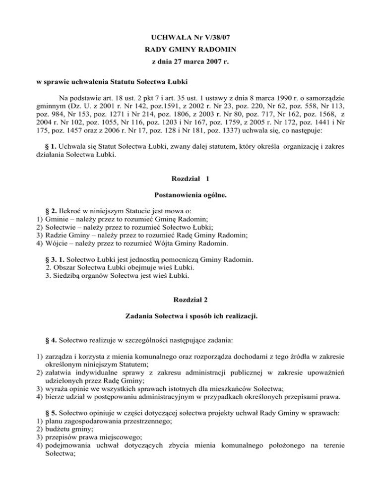UCHWAŁA Nr V/38/07 RADY GMINY RADOMIN z dnia 27 marca