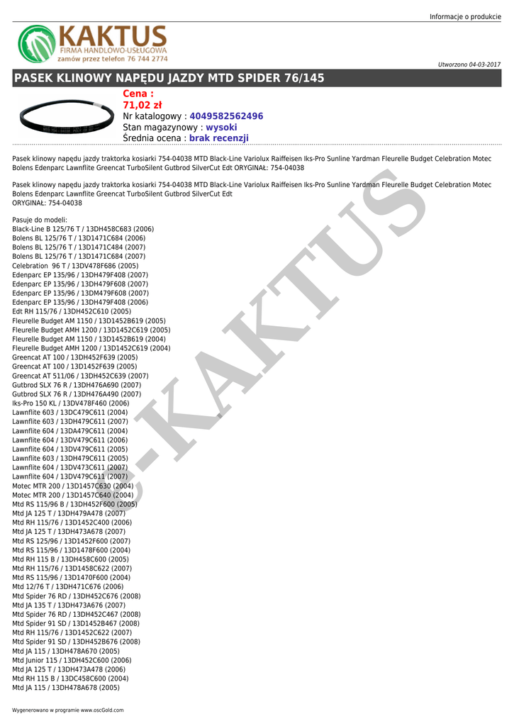 Informacje o produkcie Utworzono 04-03-2017 PASEK KLINOWY NAPĘDU JAZDY MTD SPIDER 76/145 Cena : 71,02 zł Nr katalogowy : 4049582562496 Stan magazynowy : wysoki Średnia ocena : brak recenzji Pasek klinowy napędu jazdy traktorka kosiarki 754-04038 MTD Black-Line Variolux Raiffeisen Iks-Pro Sunline Yardman Fleurelle Budget Celebration Motec Bolens Edenparc Lawnflite Greencat TurboSilent Gutbrod SilverCut Edt ORYGINAŁ: 754-04038 eK AK TU Pasuje do modeli: Black-Line B 125/76 T / 13DH458C683 (2006) Bolens BL 125/76 T / 13D1471C684 (2006) Bolens BL 125/76 T / 13D1471C484 (2007) Bolens BL 125/76 T / 13D1471C684 (2007) Celebration 96 T / 13DV478F686 (2005) Edenparc EP 135/96 / 13DH479F408 (2007) Edenparc EP 135/96 / 13DH479F608 (2007) Edenparc EP 135/96 / 13DM479F608 (2007) Edenparc EP 135/96 / 13DH479F408 (2006) Edt RH 115/76 / 13DH452C610 (2005) Fleurelle Budget AM 1150 / 13D1452B619 (2005) Fleurelle Budget AMH 1200 / 13D1452C619 (2005) Fleurelle Budget AM 1150 / 13D1452B619 (2004) Fleurelle Budget AMH 1200 / 13D1452C619 (2004) Greencat AT 100 / 13DH452F639 (2005) Greencat AT 100 / 13D1452F639 (2005) Greencat AT 511/06 / 13DH452C639 (2007) Gutbrod SLX 76 R / 13DH476A690 (2007) Gutbrod SLX 76 R / 13DH476A490 (2007) Iks-Pro 150 KL / 13DV478F460 (2006) Lawnflite 603 / 13DC479C611 (2004) Lawnflite 603 / 13DH479C611 (2007) Lawnflite 604 / 13DA479C611 (2004) Lawnflite 604 / 13DV479C611 (2006) Lawnflite 604 / 13DV479C611 (2005) Lawnflite 603 / 13DH479C611 (2005) Lawnflite 604 / 13DV473C611 (2007) Lawnflite 604 / 13DV479C611 (2007) Motec MTR 200 / 13D1457C630 (2004) Motec MTR 200 / 13D1457C640 (2004) Mtd RS 115/96 B / 13DH452F600 (2005) Mtd JA 125 T / 13DH479A478 (2007) Mtd RH 115/76 / 13D1452C400 (2006) Mtd JA 125 T / 13DH473A678 (2007) Mtd RS 125/96 / 13D1452F600 (2007) Mtd RS 115/96 / 13D1478F600 (2004) Mtd RH 115 B / 13DH458C600 (2005) Mtd RH 115/76 / 13D1458C622 (2007) Mtd RS 115/96 / 13D1470F600 (2004) Mtd 12/76 T / 13DH471C676 (2006) Mtd Spider 76 RD / 13DH452C676 (2008) Mtd JA 135 T / 13DH473A676 (2007) Mtd Spider 76 RD / 13DH452C467 (2008) Mtd Spider 91 SD / 13D1452B467 (2008) Mtd RH 115/76 / 13D1452C622 (2007) Mtd Spider 91 SD / 13DH452B676 (2008) Mtd JA 115 / 13DH478A670 (2005) Mtd Junior 115 / 13DH452C600 (2006) Mtd JA 125 T / 13DH473A478 (2006) Mtd RH 115 B / 13DC458C600 (2004) Mtd JA 115 / 13DH478A678 (2005) S Pasek klinowy napędu jazdy traktorka kosiarki 754-04038 MTD Black-Line Variolux Raiffeisen Iks-Pro Sunline Yardman Fleurelle Budget Celebration Motec Bolens Edenparc Lawnflite Greencat TurboSilent Gutbrod SilverCut Edt ORYGINAŁ: 754-04038 Wygenerowano w programie www.oscGold.com eK S AK TU Mtd RH 115 B / 13DH458C600 (2006) Mtd RH 115/76 / 13D1452C600 (2006) Mtd Junior 115 / 13DC450C600 (2004) Mtd Spider 91 S / 13D1452B600 (2007) Mtd RH 115/76 / 13D1452C600 (2005) Mtd RH 115/76 / 13D1452C670 (2007) Mtd Spider 91 SD / 13D1452B676 (2008) Mtd JA 125 T / 13DH479A678 (2007) Mtd Spider 91/125 / 13DH453B631 (2008) Mtd Junior 115 / 13AC452C600 (2004) Mtd GP 155/96 / 13DM458F631 (2008) Mtd JA 115 / 13DC478A678 (2004) Mtd B/115 / 13DH458D678 (2007) Mtd Junior 115 / 13DH452C600 (2007) Mtd B 12 / 13D1458B600 (2004) Mtd RS 125/96 / 13D1452F400 (2007) Raiffeisen RMH 412-76 T / 13DH477A628 (2006) Raiffeisen RMS 412-81 T / 13DH457D628 (2005) Raiffeisen RMS 412-81 T / 13DH457D628 (2007) Raiffeisen RMS 414-96 T / 13DA477F628 (2004) Raiffeisen RMS 412-81 T / 13DH457D628 (2006) Raiffeisen RMS 414-96 T / 13DH477F628 (2006) Raiffeisen RMH 412-76 T / 13DH477A628 (2007) Raiffeisen RMS 414-96 T / 13DM477F628 (2005) Raiffeisen RMS 412-81 T / 13DC457D628 (2004) SilverCut SC 150/96 / 13D3453F612 (2007) Sunline SL-S 1201 / 13D1452B685 (2006) Sunline SL-H 1152 / 13D1452C685 (2006) Sunline SL-S 1201 / 13D1452B685 (2007) Sunline SL-H 1152 / 13D1452C685 (2007) TurboSilent MXRH 115/76 / 13D1452C667 (2006) TurboSilent MXRH 115/76 / 13D1452C667 (2007) Variolux 91-12 / 13D1472B620 (2007) Variolux 91-12 / 13D1452B620 (2005) Variolux GT 115/91 / 13D1450B620 (2006) Variolux GT 115/91 / 13D1450B620 (2007) Variolux 91-12 / 13D1452B620 (2007) Variolux 91-12 / 13D1452B620 (2006) Yardman TF 4120 / 13DH474F643 (2005) Yardman AT 511/06 / 13DH452C439 (2006) Yardman TA 4120 / 13DH474A643 (2005) Yardman TD 4125 / 13DC474D643 (2004) Yardman AT 511/06 / 13DH452C439 (2007) Yardman TA 4135 / 13DH474A643 (2006) Yardman TA 4120 / 13DC474A643 (2004) Yardman TA 4135 / 13DM474A643 (2007) Yardman TA 4135 / 13DH474A643 (2007) Yardman AT 511/07 / 13D1450C439 (2007) Yardman TA 4135 / 13DH474A443 (2007)