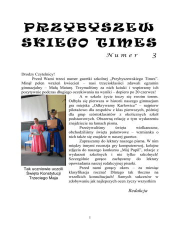 PRZYBYSZEW SKIEGO TIMES Nume r 3 Drodzy Czytelnicy! Przed Wami trzeci numer gazetki szkolnej „Przybyszewskiego Times”. Minął pełen wrażeń kwiecień – nasi trzecioklasiści zdawali egzamin gimnazjalny – Małą Maturę. Trzymaliśmy za nich kciuki i wspieramy ich pozytywnie podczas długiego oczekiwania na wyniki – dopiero po 20 czerwca! A w szkole życie toczy się swoim torem. Odbyła się pierwsza w historii naszego gimnazjum gra miejska „Odkrywamy Karłowice” – najpierw pilotażowo dla zespołów z klas pierwszych, później dla grup szóstoklasistów z okolicznych szkół podstawowych. Obszerną relację o tym wydarzeniu znajdziecie na łamach pisma. Przeżywaliśmy święta wielkanocne, obchodziliśmy święta państwowe – wzmianka o nich także się znajdzie w naszej gazetce. Zapraszamy do lektury naszego pisma. W nim między innymi recenzja gry komputerowej, kolejne zdjęcia do naszego konkursu „Mój Pupil”, relacje z wydarzeń szkolnych i nie tylko szkolnych! Szczególnie gorąco zachęcamy do lektury opowiadania naszej redakcyjnej pisarki. Przed nami gorący okres – za miesiąc Tak uczniowie uczcili klasyfikacja roczna! Dlatego tak tłoczno na Święto Konstytucji wszelkich konsultacjach! Samych sukcesów w Trzeciego Maja zdobywaniu jak najlepszych ocen życzy wszystkim Redakcja 1 Drogi trzecioklasisto! Niedawno spróbowaliśmy swoich sił na egzaminie gimnazjalnym. Jest to najważniejsze wydarzenie całego cyklu nauki w gimnazjum. Z niecierpliwością i pewną obawą czekamy na wyniki, które pojawią się dopiero w drugiej połowie czerwca! Koleżanki i koledzy! Bez wątpienia wydarzenia mijających tygodni bardzo Was zmęczyły, jednak przed Wami jeszcze miesiąc wytężonej pracy. Już niedługo nauczyciele zwieńczą wasze starania ocenami. Życzymy Wam wytrwałości i ambicji w dążeniu do sukcesu ! Redakcja gazetki Oto wskazówki, które mogą pomóc naszym następcom w dobrym przygotowaniu się do tego egzaminu: Drogi drugoklasisto! 1. przed egzaminem należy się wyspać a przed wyjściem z domu zjeść śniadanie :) 2. na egzamin nie wolno się spóźnić – trzeba stawić się w szkole punktualnie o 8.00 3. na egzamin należy przynieść ważną legitymację szkolną 4. potrzebne będą podstawowe przybory szkolne: 2 czarne długopisy lub pióra, ołówek, gumka, linijka, ekierka, kątomierz, cyrkiel 5. na salę egzaminacyjną nie wolno wnieść telefonu komórkowego, kalkulatora oraz innych pomocy naukowych lub sprzętu elektronicznego 6. na salę egzaminacyjną nie wnosimy jedzenia 7. podczas egzaminu nie wolno zakłócać porządku i przerywać pracy innym; jeśli masz problem natury organizacyjnej, podnieś rękę i zaczekaj, aż ktoś z komisji egzaminacyjnej do Ciebie podejdzie; na pytania dotyczące treści zadań członkowie komisji nie mogą odpowiadać, więc nie ma sensu takich pytań zadawać 8. ściąganie podczas egzaminu może doprowadzić do unieważnienia pracy wszystkich uczniów 9. na salę egzaminacyjną uczniowie wchodzą bez toreb, piórników i innego bagażu podręcznego Ola Kozłowska 2 ŚWIĘTA, TRADYCJE, ZWYCZAJE Wielkanoc nazywana jest Świętami Zmartwychwstania Pańskiego. Chrześcijanie obchodzą ją na pamiątkę zmartwychwstania Chrystusa, który pokonał śmierd i powrócił do żyjących. Wierzą, że ofiarował on swoje życie, żeby odkupid ludzkie winy. Typowym zwierzęciem ofiarnym przez wiele tysięcy lat był BARANEK. Po zmartwychwstaniu Chrystusa to miłe zwierzę zostało symbolem Jego ofiary. W czasach, kiedy nie wiedziano jeszcze, że żywnośd można zamrażad, co roku na wiosnę biedniejszym ludziom brakowało jedzenia. Plonów jeszcze nie było, a zapasów, które zgromadzono jesienią, często wiosną już brakowało. Całe szczęście, że KURY niosły jajka! Pozwalało to jakoś przetrwad nieprzyjemny okres. Z czasem zaczęto jaja święcid, traktowad jako symbol rodzącego się życia. Już na początku Wielkiego Postu gospodynie malowały i wyklejały pisanki oraz kraszanki – niezbędny element świąt Wielkanocy. Jajka zdobiono, spożywano. Miały one wielkie znaczenie – jajko z wielkanocnego stołu pastuch wynosił na pole, kiedy po raz pierwszy wypędzał bydło po zimie. Skorupki ze świątecznych jajek gospodyni wynosiła na pole – na szczęście (pierwszej niedzieli po Wielkanocy, po zachodzie słooca). ZAJĄCE – rozmnażają się często i mają sporo potomstwa, dlatego były uważane za symbol płodności, dostatku. Około XIX wieku zaczęto łączyd to zwierzę z Wielkanocą. Wierzono, że to zając przynosi świąteczne jajka. W Polsce zająca zaakceptowano dopiero w XX wieku. Dzisiaj uważa się, że przynosi on dzieciom prezenty. Radosnym symbolem zbliżających się świąt Wielkiej Nocy jest Niedziela Palmowa. Tego dnia w kościołach świecone są palmy, na pamiątkę liści palmowych, którymi witano Chrystusa wjeżdżającego do Jerozolimy. Stary zwyczaj każe zachowad palmę w domu. W czasie burzy palmy miały strzec domu przed piorunami. Poświęcone witki wierzbowe zostawiano dawniej w polu, żeby zapewniały dobry plon i chroniły przed szkodnikami i suszą. Symbolem świąt Wielkiej Nocy są pisanki, które święci się w Wielką Sobotę. Malowanie jajek to tradycja sięgająca starożytności. Wykorzystywanie zdobionych jajek w obrzędach znane było nawet w starożytnym Egipcie. Jaja miały tez duże znaczenie w symbolice pogaoskiej. Uważano je za znak odradzającego się życia. W Polsce jaja zaczęto wkładad do koszyczka ze święconką dopiero w XII wieku. Do farbowania jaj używano niegdyś łupin cebuli, liści szpinaku lub kory drzew. Na Opolszczyźnie wydrapywano wzory na uprzednio ufarbowanej skorupce, na Kurpiach oklejano skorupkę sitowiem. W święconce, którą niesie się do kościoła w Wielką Sobotę, oprócz jajek powinny znaleźd się też: baranek (symbolizuje Chrystusa, który ocali tych, co w niego wierzą), chleb (symbol ciała Ch
