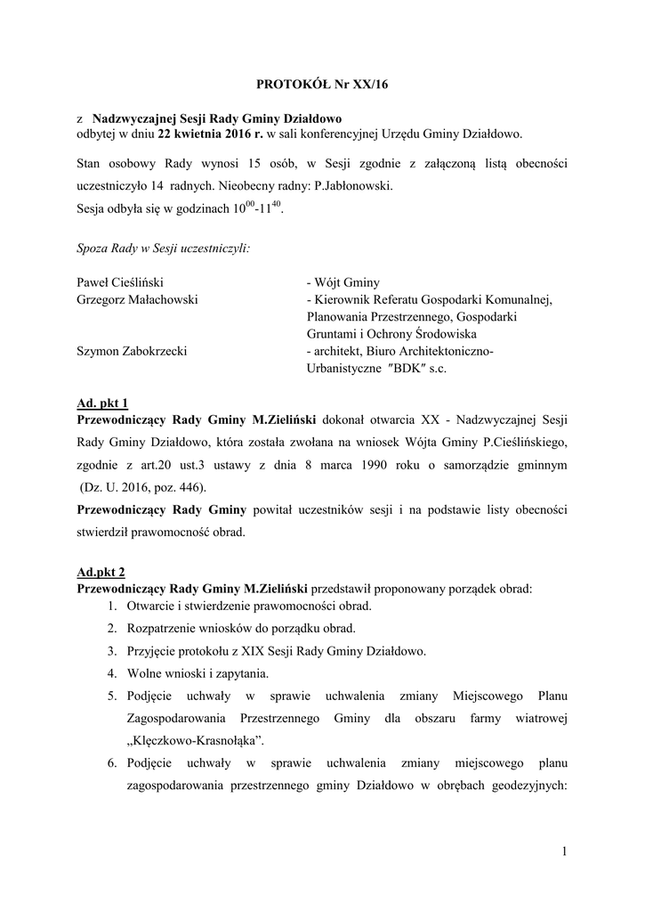 PROTOKÓŁ Nr XX/16 z Nadzwyczajnej Sesji Rady Gminy Działdowo odbytej w dniu 22 kwietnia 2016 r. w sali konferencyjnej Urzędu Gminy Działdowo. Stan osobowy Rady wynosi 15 osób, w Sesji zgodnie z załączoną listą obecności uczestniczyło 14 radnych. Nieobecny radny: P.Jabłonowski. Sesja odbyła się w godzinach 1000-1140. Spoza Rady w Sesji uczestniczyli: Paweł Cieśliński Grzegorz Małachowski - Wójt Gminy - Kierownik Referatu Gospodarki Komunalnej, Planowania Przestrzennego, Gospodarki Gruntami i Ochrony Środowiska - architekt, Biuro ArchitektonicznoUrbanistyczne ″BDK″ s.c. Szymon Zabokrzecki Ad. pkt 1 Przewodniczący Rady Gminy M.Zieliński dokonał otwarcia XX - Nadzwyczajnej Sesji Rady Gminy Działdowo, która została zwołana na wniosek Wójta Gminy P.Cieślińskiego, zgodnie z art.20 ust.3 ustawy z dnia 8 marca 1990 roku o samorządzie gminnym (Dz. U. 2016, poz. 446). Przewodniczący Rady Gminy powitał uczestników sesji i na podstawie listy obecności stwierdził prawomocność obrad. Ad.pkt 2 Przewodniczący Rady Gminy M.Zieliński przedstawił proponowany porządek obrad: 1. Otwarcie i stwierdzenie prawomocności obrad. 2. Rozpatrzenie wniosków do porządku obrad. 3. Przyjęcie protokołu z XIX Sesji Rady Gminy Działdowo. 4. Wolne wnioski i zapytania. 5. Podjęcie uchwały Zagospodarowania w sprawie Przestrzennego uchwalenia Gminy zmiany dla Miejscowego obszaru farmy Planu wiatrowej „Klęczkowo-Krasnołąka”. 6. Podjęcie uchwały w sprawie uchwalenia zmiany miejscowego planu zagospodarowania przestrzennego gminy Działdowo w obrębach geodezyjnych: 1 Petrykozy, Klęczkowo, Krasnołąka, Turza Wielka, Niestoja, Ruszkowo, Sławkowo, Pierławki, Burkat. 7. Sprawy bieżące. 8. Zamknięcie obrad. Nie zgłoszono uwag do porządku obrad. Ad. pkt 3 Protokół z XIX Sesji został przyjęty jednogłośnie bez odczytania. Ad. pkt 4 Nikt nie zabrał głosu. Ad. pkt 5 Wójt Gminy omówił projekt uchwały. Plan został opracowany na rejon Krasnołąka –Klęczkowo. W załączniku oznaczono pięć lokalizacji turbin wiatrowych. Występuje zbieżność dwóch planów, które w części nakładają się. Nawiązują do kolejnego planu. Lokalizacja turbin wiatrowych na niektórych obszarach w gminie, blokuje budowę dużych ferm drobiu. Mamy nadzieję, że plany wejdą w życie. Nie wiemy w jakim zakresie będą realizowane. Na dzień dzisiejszy firmy wstrzymały się całkowicie z inwestycjami, nie wiedzą co robić, jaka będzie skala podatku, jakie będą możliwości lokowania farm wiatrowych. Radny P.Stańczak: co się wydarzyło, że ten plan jest przyjmowany na sesji nadzwyczajnej. Wójt Gminy: z uwagi na czas. Decyzja o sesji nadzwyczajnej zapadła po 18 kwietnia, czyli po tym jak nie wpłynęły wnioski do miejscowego planu. Może plan wiatrakowy nie jest takim pilnym planem. Ważniejszy jest ten drugi plan. Im szybciej zostanie przyjęty tym lepiej. Radny P.Stańczak: biorąc pod uwagę odległość wiatraków od planowanych ferm, czy w jakiś sposób zablokują fermę (jeśli plan zostanie zatwierdzony). Wójt Gminy: w tym przypadku tak. Strefa oddziaływania planowanej lokalizacji dwóch turbin obejmuje działkę objętą zamiarem budowy fermy drobiu. Rada gminy większością głosów /13 głosów „za”, 1 głos „wstrzymujący się”, 0 głosów „przeciw”/ podjęła Uchwałę Nr XX/147/16 w sprawie uchwalenia zmiany Miejscowego Planu Zagospodarowania Przestrzennego Gminy Działdowo dla obszaru farmy wiatrowej „Klęczkowo-Krasnołąka” . Uchwała stanowi załącznik Nr 2 do niniejszego protokołu. Ad. pkt 6 Wójt Gminy przedstawił projekt uchwały. 2 Temat szeroko omawiany. Dotyczy wyłączenia obszarów z lokalizacji ferm drobiu. Nie jest to obligatoryjne, że uda nam się w ogóle zablokować lokalizację ferm drobiu. Ktoś w innym obszarze może wykupić ziemię i je ulokować. Od czegoś trzeba jednak zacząć, przynajmniej zablokować to o czym rozmawialiśmy na komisjach. Wskazaliśmy obszary najbardziej zagrożone, sprzyjające lokalizacji ferm, co wynikało z naszej opinii, opinii mieszkańców ale i sygnałów, że ktoś interesuje się terenem pod kątem takich inwestycji, czyli terenów znacznie oddalonych od miejscowości, w kompleksach leśnych, osłaniających dany obszar, gospodarstwach wielkoobszarowych. Nie chcemy jednak zakazać całkowicie budowy tylko ograniczyć skalę tego typu obiektów. Radna E.Zielska zapytała czy pan Wójt posiada informacje na temat budowy kurników za granicą gminy (za Petrykozami). Wójt Gminy: dopóki nie wpłyną oficjalne zawiadomienia tego nie wiemy. Jeżeli jest lokowana przy granicy i są zmiany w planie dotyczące przygranicznych terenów zawsze gmina sąsiednia jest powiadamiana. Dopiero wtedy możemy wystąpić, aby być stroną, jeżeli odległość będzie bliska i jest zagrożenie. Przewodniczący Rady Gminy M.Zieliński poprosił o pytania. Radny P Stańczak skierował kilka pytań do arch. Sz.Zabokrzeckiego. - W §8 ust.1 pkt 5 (RU) jest zapis „ Ustala się maksymalną obsadę budynku inwentarskiego: a) dla hodowli indyków – 240 DJP, b) dla hodowli gęsi – 80 DJP, c) dla pozostałych rodzajów zwierząt – 40 DJP.” dlaczego są takie różnice w zakresie DJP. Pan Sz. Zabokrzecki: w zależności od rodzaju wielkość jest różna np. w przypadku: indyków 240 DJP przekłada się na 10 000 w obsadzie; w przypadku gęsi 80 DJP przekłada się na około 100 000; w przypadku kur 40 DJP przekłada się na 10 000. Należy wziąć pod uwagę również inne zapisy. W pkt 3 jest zapis mówiący o możliwości budowy dwóch budynków gospodarskich lub inwentarskich. Maksymalną powierzchnię zabudowy budynku inwentarskiego przyjęto w wielkości 2000 m2. Przy takim DJP przeciętny kurnik mieściłby około 17 000. Biorąc pod uwagę możliwość budowy dwóch obiektów inwentarskich, których powierzchnia jest nie większa niż 2000 m2 będą się mieściły tylko dwa kurniki, w k