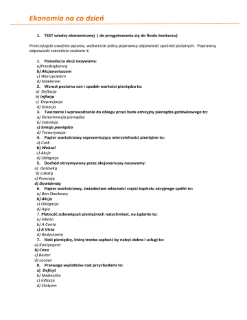 Ekonomia na co dzień 1. TEST wiedzy ekonomicznej ( do przygotowania się do finału konkursu) Przeczytajcie uważnie pytania, wybierzcie jedną poprawną odpowiedź spośród podanych. Poprawną odpowiedź zakreślcie znakiem X. 1. Posiadacza akcji nazywamy: a)Przedsiębiorcą b) Akcjonariuszem c) Wierzycielem d) Maklerem 2. Wzrost poziomu cen i spadek wartości pieniądza to: a) Deflacja b) Inflacja c) Deprecjacja d) Dotacja 3. Tworzenie i wprowadzanie do obiegu przez bank emisyjny pieniądza gotówkowego to: a) Denominacja pieniądza b) Submisja c) Emisja pieniądza d) Tezauryzacja 4. Papier wartościowy reprezentujący wierzytelności pieniężne to: a) Czek b) Weksel c) Akcje d) Obligacje 5. Dochód otrzymywany przez akcjonariuszy nazywamy: a) Gotówką b) Lokatą c) Prowizją d) Dywidendą 6. Papier wartościowy, świadectwo własności części kapitału akcyjnego spółki to: a) Bon Skarbowy b) Akcja c) Obligacja d) Agio 7. Płatność zobowiązań pieniężnych natychmiast, na żądanie to: a) Inkaso b) A Conto c) A Vista d) Redyskonto 7. Ilość pieniędzy, którą trzeba zapłacić by nabyć dobra i usługi to: a) Kontyngent b) Cena c) Barter d) Locaut 8. Przewaga wydatków nad przychodami to: a) Deficyt b) Nadwyżka c) Inflacja d) Etatyzm Ekonomia na co dzień 9. Wywóz za granicę towarów, usług nazywamy: a) Importem b) Eksportem c) Spedycją d) Embargiem 10. Wzrost kursu papierów wartościowych lub cen towarów notowanych na giełdach to: a) Hossa b) Bessa c) Akcyza d) Boom 11. Przywóz z zagranicy towarów, usług, kapitałów nazywamy: a) Importem b) Eksportem c) Spedycją d) Transportem 12. Dobro, z którego rezygnujemy, by nabyć inne dobro to: a) Dobro komplementarne b) Koszt alternatywny c) Dobro substytucyjne d) Koszt całkowity 16. Proces, w którym uczestnicy rynku próbują przedstawić oferty korzystniejsze od innych to: a) Konkurencja b) Negocjacje c) Mediacje d) Konsumpcja 17. Działania dotyczące badań rynku, planowania produkcji, reklamy, sprzedaży, dystrybucji to: a) Sponsoring b) Marketing c) Holding d) Dumping 18. Wytwórnia monet, często także medali, orderów, pieczęci, stempli to: a) Drukarnia b) Mennica c) Metalografia d) Narodowy Bank Polski 19. Kwota, o którą wpływy do budżetu przewyższają wydatki to: a) Premia b) Nadwyżka c) Zysk d) Waloryzacja 20. Rodzaj papieru wartościowego, rodzaj długu zaciągniętego przez emitenta to: a) Weksel b) Patent c) Obligacja d) Czek 21. Pełni funkcję środka wymiany dóbr i usług ? a) Pieniądz b) Umowa c) Podaż Ekonomia na co dzień d) Barter 22. Obniżenie ceny przyjętej w cenniku to: a) Rabat b) Promocja c) Prowizja d) Deputat 24. Określony w umowie związek dwóch lub więcej osób mający służyć osiągnięciu wspólnego celu to: a) Spółka b) Franchising c) Koncern d) Konglomerat 25. Ilość produktów, którą producenci są gotowi dostarczyć na rynek przy różnych poziomach cen to: a) Popyt b) Zapotrzebowanie c) Podaż d) Dystrybucja 26. Ilość dobra lub usługi, którą konsumenci chcą i mogą kupić w danym czasie, przy różnych poziomach cen to: a) Podaż b) Popyt c) Marketing d) Konsumpcja 27. Akt kupna-sprzedaży to: a) Transakcja b) Arbitraż c) Audyt d) Fuzja 28. Wymiana bezpośrednia- towar za towar bez udziału pieniądza to: a) Kartel b) Nadwyżka c) Barter d) Popyt 29. Przywracanie wartości zdeprecjonowanym wierzytelnościom pieniężnym to: a) Waloryzacja b) Denominacja c) Kapitalizacja d) Kumulacja 30. Nadwyżka przychodów nad kosztami ich uzyskania to…? a) Zasoby b) Zysk c) Aktywa d) Pasywa