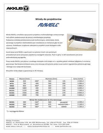 Windy do projektorów Winda RAVELL umożliwia opuszczenie projektora multimedialnego umieszczonego nad sufitem podwieszanym do pozycji umożliwiającej projekcję. Podwyższa estetykę pomieszczenia (sala konferencyjna, szkoleniowa, dom), sprawiając iż projektor multimedialny jest niewidoczny w momencie gdy nie jest używany. Dodatkowo urządzenie zabezpiecza projektor przed dostępem osób niepowołanych. Konstrukcja wind RAVELL oparta jest na systemie trzech ram poziomych prowadzonych przez precyzyjny pojedynczy wysięgnik nożycowy. Ruch w górę i w dół wywoływany jest przez wolnoobrotową wyciągarkę. Praca windy RAVELL jest płynna i przebiega niezwykle cicho dzięki m.in. wysokiej jakości silnikowi (objętemu 5-cio letnią gwarancją). Nad bezpieczeństwem pracy oraz precyzją zatrzymania windy czuwa system regulatorów położenia górnego i dolnego oraz wyłączniki krańcowe. Wszystkie windy objęte są gwarancją na 36 miesięcy. Nazwa W450 W751 W850 W1000 W1151 W1501 W2000 Wysuw [mm] 450 750 850 1000 1150 1500 2000 400* 400 400* 400 400 400 700 Wymiary [mm] 560 560 560 500 560 560 560 135 200 170 220 235 270 260 Cena [netto] 4 590 zł 5 090 zł 5 890 zł 6 690 zł 7 290 zł 8 890 zł 9 890 zł Windy Slim dedykowane do kina domowego WS391 WS392 WS393 300 300 300 560* 560* 580* 560 625 705 GRUBOŚĆ PROJEKTORA + 30MM 4 590 zł 5 190 zł 5 190 zł *) + wyciągarka 83mm Skl ep y f ir mo w e : AK K US, u l . R ze źn i cka 1 2 H , 8 4 -2 00 W ejh er o wo, T el . 0 5 8 6 77 9 19 2 Fa x. 0 58 67 7 40 36 AK K US – f il ia w War sz a wi e, u l. An i el e wi cza 4 5/ 88, T e l. k o m. 51 3 -3 93 - 6 46 w w w.a kku s. co m.p l .. :.. w w w. lou d sp ea ke r sh op . eu .. :.. w ww .p at h au d io .eu