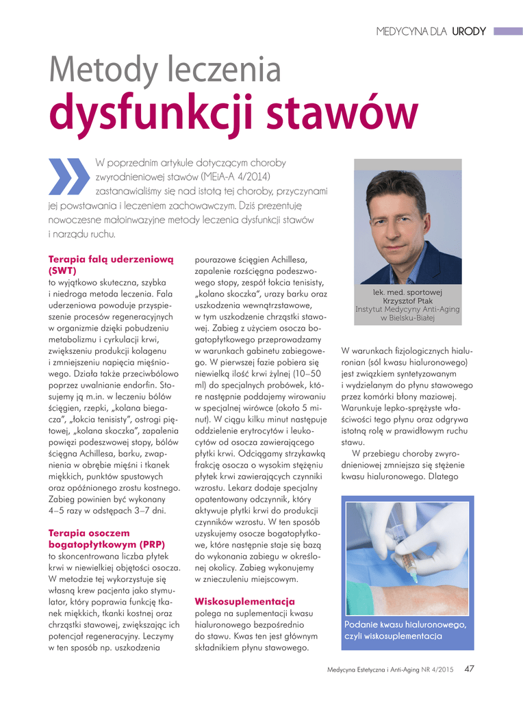 MEDYCYNA DLA URODY Metody leczenia dysfunkcji stawów W poprzednim artykule dotyczącym choroby zwyrodnieniowej stawów (MEiA-A 4/2014) zastanawialiśmy się nad istotą tej choroby, przyczynami jej powstawania i leczeniem zachowawczym. Dziś prezentuję nowoczesne małoinwazyjne metody leczenia dysfunkcji stawów i narządu ruchu. Terapia falą uderzeniową (SWT) to wyjątkowo skuteczna, szybka i niedroga metoda leczenia. Fala uderzeniowa powoduje przyspieszenie procesów regeneracyjnych w organizmie dzięki pobudzeniu metabolizmu i cyrkulacji krwi, zwiększeniu produkcji kolagenu i zmniejszeniu napięcia mięśniowego. Działa także przeciwbólowo poprzez uwalnianie endorfin. Stosujemy ją m.in. w leczeniu bólów ścięgien, rzepki, „kolana biegacza”, „łokcia tenisisty”, ostrogi piętowej, „kolana skoczka”, zapalenia powięzi podeszwowej stopy, bólów ścięgna Achillesa, barku, zwapnienia w obrębie mięśni i tkanek miękkich, punktów spustowych oraz opóźnionego zrostu kostnego. Zabieg powinien być wykonany 4–5 razy w odstępach 3–7 dni. Terapia osoczem bogatopłytkowym (PRP) to skoncentrowana liczba płytek krwi w niewielkiej objętości osocza. W metodzie tej wykorzystuje się własną krew pacjenta jako stymulator, który poprawia funkcję tkanek miękkich, tkanki kostnej oraz chrząstki stawowej, zwiększając ich potencjał regeneracyjny. Leczymy w ten sposób np. uszkodzenia pourazowe ścięgien Achillesa, zapalenie rozścięgna podeszwowego stopy, zespół łokcia tenisisty, „kolano skoczka“, urazy barku oraz uszkodzenia wewnątrzstawowe, w tym uszkodzenie chrząstki stawowej. Zabieg z użyciem osocza bogatopłytkowego przeprowadzamy w warunkach gabinetu zabiegowego. W pierwszej fazie pobiera się niewielką ilość krwi żylnej (10–50 ml) do specjalnych probówek, które następnie poddajemy wirowaniu w specjalnej wirówce (około 5 minut). W ciągu kilku minut następuje oddzielenie erytrocytów i leukocytów od osocza zawierającego płytki krwi. Odciągamy strzykawką frakcję osocza o wysokim stężęniu płytek krwi zawierających czynniki wzrostu. Lekarz dodaje specjalny opatentowany odczynnik, który aktywuje płytki krwi do produkcji czynników wzrostu. W ten sposób uzyskujemy osocze bogatopłytkowe, które następnie staje się bazą do wykonania zabiegu w określonej okolicy. Zabieg wykonujemy w znieczuleniu miejscowym. lek. med. sportowej Krzysztof Ptak Instytut Medycyny Anti-Aging w Bielsku-Białej W warunkach fizjologicznych hialuronian (sól kwasu hialuronowego) jest związkiem syntetyzowanym i wydzielanym do płynu stawowego przez komórki błony maziowej. Warunkuje lepko-sprężyste właściwości tego płynu oraz odgrywa istotną rolę w prawidłowym ruchu stawu. W przebiegu choroby zwyrodnieniowej zmniejsza się stężenie kwasu hialuronowego. Dlatego Wiskosuplementacja polega na suplementacji kwasu hialuronowego bezpośrednio do stawu. Kwas ten jest głównym składnikiem płynu stawowego. Podanie kwasu hialuronowego, czyli wiskosuplementacja Medycyna Estetyczna i Anti-Aging NR 4/2015 47 MEDYCYNA DLA URODY uzupełnia się go poprzez iniekcje głównie u osób w przedziale 40–60 lat. Wiskosuplementacja powoduje wzrost lepkości i elastyczności płynu stawowego, poprawia odżywienie chrząstki stawowej oraz biomechanizm stawu. Iniekcje wykonujemy 3–5 razy w odstępach 1–2 tygodni. Zaletą zabiegu jest prawie całkowity brak efektów ubocznych. Fizykoterapia to część procesu rehabilitacji polegająca na oddziaływaniu na ludzki organizm za pomocą bodźców fizycznych w celu wywołania reakcji leczniczej i regeneracyjnej tkanek. W ramach leczenia fizykalnego stosuje się m.in. biostymulacje laserowe, elektroterapię (Tens Trauberta, IF, Kotza, jonoforeza), światłolecznictwo (Solux), ciepłolecznictwo (okłady borowinowe, Leczenie fizykalne kompresy), – elektroterapia krioterapię miejscową, magnetoterapię, diatermię krótkofalową, ultradźwięki. Zabiegi fizykoterapii dobiera się indywidualnie do pacjenta w zależności od Leczenie fizykalne – użycie światła lasera 48 Medycyna Estetyczna i Anti-Aging NR 4/2015 jego stanu zdrowia, przebytych schorzeń, aktualnych dolegliwości. Fizykoterapia ma kluczowe znaczenie we wczesnej interwencji rehabilitacyjnej po urazach i operacjach. Stanowi również wstęp do dalszych usprawnień z wykorzystaniem terapii ruchu (kinezyterapia). Terapia manualna wencji ograniczeniem ruchomości w stawach. Może być stosowana zarówno w ostrych, jak i przewlekłych stanach zapalnych. Największą korzyścią terapii jest przywrócenie równowagi mięśniowej i funkjonalności stawów. Kinesiology taping to metoda teraupetyczna wspierato jedna z koncepcji leczenia jąca proces samoleczenia organidysfunkcji narządu ruchu, w szczezmu mająca szerokie zastosowanie gólności stawów kończyn górnych w rehabilitacji, odnowie biologiczi dolnych oraz kręgosłupa. Kluczonej i sporcie. Polega na specyficzwym elemennym aplikowaniu tem terapii jest elastycznego określenie dysplastra o właścifunkcji stawu. wościach ludzFizjoterapeuta, kiej skóry, który używając swow zależności ich rąk, stosuje od zastosowanej specjalne techtechniki powoniki manualne duje: zmniejszezwane mobilinie dolegliwości Stosowanie bodźców fizycznych zującymi i mabólowych mięśni – terapia manualna nipulacyjnymi. i stawów, obniEfektem końcożenie napięcia wym zabiegów jest przywrócenie mięśniowego, ochronę mięśni właściwej biomechaniki stawów po urazach z przeciążenia, wspo(odblokowanie), co prowadzi do: maga pracę mięśni, poprawia zmniejszenia dolegliwości bólowej, mikrokrążenie, pobudza system zwiększenia zakresu ruchomości, limfatyczny (likwiduje obrzęk). zmniejszenia odczynu zapalnego Plastry stosuje się przez 24 godziny tkanek, jak i odzyskania funkcjona dobę. Użytkuje 4–10 dni. Jest nalności stawów w organizmie. to bezpieczna forma profilaktyki i terapii. Terap