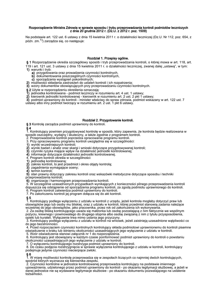 Rozporządzenie Ministra Zdrowia w sprawie sposobu i trybu przeprowadzania kontroli podmiotów leczniczych z dnia 20 grudnia 2012 r. (Dz.U. z 2012 r. poz. 1509) Na podstawie art. 122 ust. 6 ustawy z dnia 15 kwietnia 2011 r. o działalności leczniczej (Dz.U. Nr 112, poz. 654, z późn. zm.1)) zarządza się, co następuje: Rozdział 1. Przepisy ogólne. § 1 Rozporządzenie określa szczegółowy sposób i tryb przeprowadzania kontroli, o której mowa w art. 118, art. 119 i art. 121 ust. 3 ustawy z dnia 15 kwietnia 2011 r. o działalności leczniczej, zwanej dalej „ustawą”, w tym: 1) warunki i tryb: a) przygotowania oraz prowadzenia czynności kontrolnych, b) dokumentowania poszczególnych czynności kontrolnych, c) sporządzania wystąpień pokontrolnych; 2) możliwości składania zastrzeżeń do ustaleń kontroli i ich rozpatrzenia; 3) wzory dokumentów obowiązujących przy przeprowadzaniu czynności kontrolnych. § 2 Użyte w rozporządzeniu określenia oznaczają: 1) jednostka kontrolowana - podmiot leczniczy w rozumieniu art. 4 ust. 1 ustawy; 2) kierownik jednostki kontrolowanej - kierownik w rozumieniu art. 2 ust. 2 pkt 1 ustawy; 3) podmiot uprawniony do kontroli - minister właściwy do spraw zdrowia, podmiot wskazany w art. 122 ust. 7 ustawy albo inny podmiot tworzący w rozumieniu art. 2 ust. 1 pkt 6 ustawy. Rozdział 2. Przygotowanie kontroli. § 3 Kontrolę zarządza podmiot uprawniony do kontroli. §4 1. Kontrolujący powinien przygotowywać kontrolę w sposób, który zapewnia, że kontrola będzie realizowana w sposób oszczędny, wydajny i skuteczny, a także zgodnie z programem kontroli. 2. Przeprowadzenie kontroli poprzedza opracowanie programu kontroli. 3. Przy opracowywaniu programu kontroli uwzględnia się w szczególności: 1) wyniki wcześniejszych kontroli; 2) wyniki badań i analiz oraz skargi i wnioski dotyczące przygotowywanej kontroli; 3) czynniki ryzyka mające wpływ na działalność jednostki kontrolowanej; 4) informacje dotyczące działalności jednostki kontrolowanej. 4. Program kontroli określa w szczególności: 1) jednostkę kontrolowaną; 2) zakres kontroli, to jest przedmiot i okres objęty kontrolą; 3) zagadnienia wymagające oceny; 4) termin kontroli; 5) stan prawny dotyczący zakresu kontroli oraz wskazówki metodyczne dotyczące sposobu i techniki przeprowadzenia kontroli; 6) organizację i harmonogram przeprowadzenia kontroli. 5. W szczególnie uzasadnionych przypadkach wynikających z konieczności pilnego przeprowadzenia kontroli dopuszcza się odstąpienie od sporządzenia programu kontroli, za zgodą podmiotu uprawnionego do kontroli. 6. Program kontroli zatwierdza podmiot uprawniony do kontroli. 7. Po zakończeniu kontroli jej program dołącza się do akt kontroli. §5 1. Kontrolujący podlega wyłączeniu z udziału w kontroli z urzędu, jeżeli kontrola mogłaby dotyczyć praw lub obowiązków jego lub osoby mu bliskiej, oraz z udziału w kontroli, której przedmiot stanowią zadania należące wcześniej do jego obowiązków, jako pracownika, przez rok od zakończenia ich wykonywania. 2. Za osobę bliską kontrolującego uważa się małżonka lub osobę pozostającą z nim faktycznie we wspólnym pożyciu, krewnego i powinowatego do drugiego stopnia albo osobę związaną z nim z tytułu przysposobienia, opieki lub kurateli. Wyłączenie trwa mimo ustania jego przyczyny. 3. Kontrolujący podlega wyłączeniu z udziału w kontroli na wniosek, jeżeli zaistnieją uzasadnione wątpliwości co do jego bezstronności. 4. Przed rozpoczęciem czynności kontrolnych kontrolujący składa podmiotowi uprawnionemu do kontroli pisemne oświadczenie o braku lub istnieniu okoliczności uzasadniających jego wyłączenie z udziału w kontroli. 5. Wzór oświadczenia stanowi załącznik nr 1 do rozporządzenia. 6. Kontrolujący jest obowiązany w każdym czasie poinformować podmiot uprawniony do kontroli o powstaniu okoliczności uzasadniających jego wyłączenie z udziału w kontroli. 7. O wyłączeniu kontrolującego rozstrzyga podmiot uprawniony do kontroli. 8. Do czasu podjęcia rozstrzygnięcia w sprawie wyłączenia kontrolującego z udziału w kontroli, kontrolujący podejmuje jedynie czynności niecierpiące zwłoki. §6 1. W miarę możliwości kontrolę przeprowadza się w zespołach liczących co najmniej dwóch kontrolujących, spośród których wyznacza się kierownika zespołu. 2. Czynności kontrolne w jednostce kontrolowanej przeprowadza kontrolujący na podstawie imiennego upoważnienia, udzielonego przez podmiot uprawniony do kontroli - po okazaniu legitymacji służbowej, a jeżeli w danej jednostce nie są wydawane legitymacje służbowe - po okazaniu dokumentu pozwalającego na ustalenie tożsamości. 3. Upoważnienie do przeprowadzenia kontroli zawiera: 1) oznaczenie wydającego upoważnienie oraz numer, datę i miejsce wystawienia; 2) wskazanie podstawy prawnej; 3) imię i nazwisko kontrolującego oraz numer jego legitymacji służbowej lub numer dokumentu pozwalającego na ustalenie tożsamości; 4) nazwę i adres jednostki kontrolowanej; 5) określenie zakresu kontroli; 6) wskazanie daty rozpoczęcia i przewidywanego terminu zakończenia kontroli (okres ważności upoważnienia); 7) podpis osoby udzielającej upoważnienia z podaniem zajmowanego stanowiska lub funkcji; 8) pouczenie o prawach i obowiązkach jednostki kontrolowanej. 4. Wzór upoważnienia stanowi załącznik nr 2 do rozporządzenia. 5. W przypadku gdy w trakcie przeprowadzania kontroli zaistnieje konieczność wydłużenia czasu trwania czynności kontrolnych lub rozszerzenia zakresu kontroli, podmiot uprawniony do kontroli przedłuża okres ważności upoważnienia, przez uczynienie na nim stosownej wzmianki, lub wydaje nowe upoważnienie do przeprowadzenia kontroli. §7 1. Kontrolujący, po otrzymaniu upoważnienia, o którym mowa w § 6 ust. 2, zawiadamia kierownika jednostki kontrolowanej o zakresie kontroli oraz przewidywanym czasie trwania c
