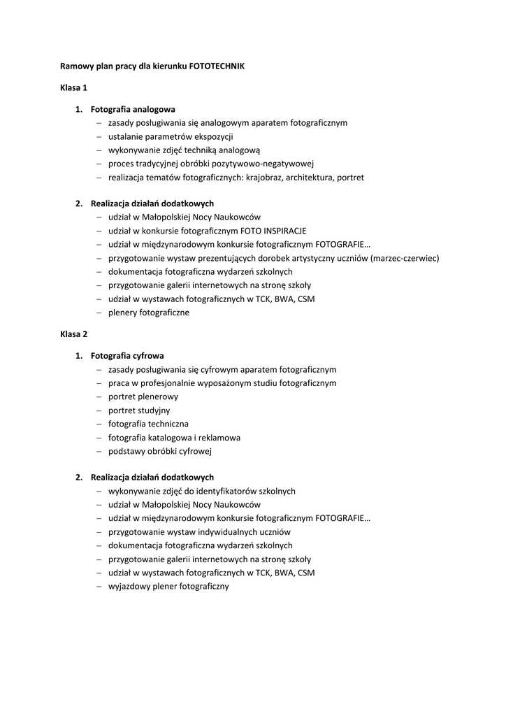 Ramowy plan pracy dla kierunku FOTOTECHNIK Klasa 1 1. Fotografia analogowa − zasady posługiwania się analogowym aparatem fotograficznym − ustalanie parametrów ekspozycji − wykonywanie zdjęć techniką analogową − proces tradycyjnej obróbki pozytywowo-negatywowej − realizacja tematów fotograficznych: krajobraz, architektura, portret 2. Realizacja działań dodatkowych − udział w Małopolskiej Nocy Naukowców − udział w konkursie fotograficznym FOTO INSPIRACJE − udział w międzynarodowym konkursie fotograficznym FOTOGRAFIE… − przygotowanie wystaw prezentujących dorobek artystyczny uczniów (marzec-czerwiec) − dokumentacja fotograficzna wydarzeń szkolnych − przygotowanie galerii internetowych na stronę szkoły − udział w wystawach fotograficznych w TCK, BWA, CSM − plenery fotograficzne Klasa 2 1. Fotografia cyfrowa − zasady posługiwania się cyfrowym aparatem fotograficznym − praca w profesjonalnie wyposażonym studiu fotograficznym − portret plenerowy − portret studyjny − fotografia techniczna − fotografia katalogowa i reklamowa − podstawy obróbki cyfrowej 2. Realizacja działań dodatkowych − wykonywanie zdjęć do identyfikatorów szkolnych − udział w Małopolskiej Nocy Naukowców − udział w międzynarodowym konkursie fotograficznym FOTOGRAFIE… − przygotowanie wystaw indywidualnych uczniów − dokumentacja fotograficzna wydarzeń szkolnych − przygotowanie galerii internetowych na stronę szkoły − udział w wystawach fotograficznych w TCK, BWA, CSM − wyjazdowy plener fotograficzny Klasa 3 1. Fotografia cyfrowa i analogowa − doskonalenie warsztatu pracy w fotografii analogowej − doskonalenie warsztatu pracy w fotografii cyfrowej − wykonywanie projektów graficznych – pakiet Adobe Photoshop, Corel Draw Graphics Suite − realizacja projektów multimedialnych 2. Realizacja działań dodatkowych − wykonywanie zdjęć klasowych − udział w Małopolskiej Nocy Naukowców − udział w międzynarodowym konkursie fotograficznym FOTOGRAFIE… − foto wieczory autorskie Szkoły Szczepanika (marzec – maj) − dokumentacja fotograficzna wydarzeń szkolnych − przygotowanie galerii internetowych na stronę szkoły − udział w wystawach fotograficznych w TCK, BWA, CSM − wyjazdowy plener fotograficzny Klasa 4 1. Multimedia − obróbka materiałów cyfrowych − przygotowanie grafiki na potrzeby projektów multimedialnych − elementy animacji komputerowej − wykonywanie prezentacji multimedialnych − tworzenie i publikowanie internetowych projektów multimedialnych 2. Realizacja działań dodatkowych − udział w Małopolskiej Nocy Naukowców − dokumentacja fotograficzna wydarzeń szkolnych − przygotowanie galerii internetowych na stronę szkoły − udział w wystawach fotograficznych w TCK, BWA, CSM − analiza dorobku artystycznego i osiągnięć uczniów