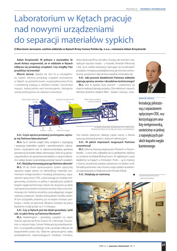 PREZENTACJE TECHNIKA I TECHNOLOGIA Laboratorium w Kętach pracuje nad nowymi urządzeniami do separacji materiałów sypkich Z Marcinem Jaroszem, szefem oddziału w Kętach firmy Comex Polska Sp. z o.o., rozmawia Adam Krzyżowski Adam Krzyżowski: W jednym z wywiadów dr Jacek Kołacz wspomniał, że w oddziale w Kętach odbywa się produkcja urządzeń. Czy mógłby Pan przybliżyć tę kwestię? Marcin Jarosz: Zgadza się. Jest to w szczególności nadzór. Główną produkcję urządzeń prowadzimy w Kętach za pośrednictwem wyspecjalizowanej firmy z wieloletnią tradycją w obróbce metalu i konstrukcji maszyn. Jednocześnie sami konstruujemy i testujemy wersje prototypowe we własnym warsztacie. układ analizy optycznej która obejmuje firmy nie tylko z Europy, ale również z najdalszych rejonów świata – z Australii, Ameryki Północnej i Azji. Są to wielkie korporacje zajmujące się recyklingiem proszków, mniejsze przedsiębiorstwa, jak również cementownie, producenci diamentów, kopalnie minerałów itp. A.K.: Jaki procent działalności Państwa oddziału zajmują sprawy serwisu i doradztwa technicznego? M.J.: Jest to bardzo duży procent – uzależniony od stopnia realizacji danego projektu. Dla niektórych naszych klientów jesteśmy działem R&D – badań i rozwoju. Jeste- analizator rentgenowski układ rozprowadzający materiał wsadowy odpady węgiel układ odrzucający A.K.: Czym oprócz produkcji prototypów zajmuje się Państwa laboratorium? M.J.: Są to szeroko pojęte testy związane z segregacją i separacją materiałów sypkich i sproszkowanych. Laboratorium wyposażone jest w najnowocześniejszą aparaturę pomiarową do badań składu ziarnowego. Testy te są zazwyczaj preludium do zacieśnienia kontaktów z naszymi klientami z całego świata i poprzedzają sprzedaż naszych urządzeń. A.K.: Nad jaką innowacją pracują Państwo obecnie? M.J.: W tej chwili opracowujemy system optycznej separacji węgla oparty na identyfikacji materiału promieniami rentgenowskimi. Instalację pilotażową z separatorem optycznym CRX, wykorzystującym analizę rentgenowską, umieścimy w jednej z największych polskich kopalni węgla kamiennego. Nasze siły skupione są także nad opracowywaniem nowej konstrukcji młyna strumieniowego do mielenia proszków, pozwalającego osiągać większą wydajność i bardzo dobrą jakość kształtu ziaren. W tym przypadku jesteśmy już na etapie montażu prototypu i myślę, że pierwsze oficjalne rezultaty tej pracy będziemy mogli podać za 2–3 miesiące. A.K.: Czy w Kętach jest też dział sprzedaży i jeśli tak, to jakie firmy są Państwa klientami? M.J.: Marketingiem i sprzedażą urządzeń na całym świecie zajmuje się firma Comex AS z Norwegii. Oczywiście, w naszym kraju Comex Polska jest jej przedstawicielem i w przypadku polskiego rynku sprzedaż odbywa się bezpośrednio przez nas. Obecnie opracowujemy siatkę przedsiębiorstw wykorzystujących instalacje Comeksu, SCHEMAT DZIAŁANIA SEPARATORA OPTYCZNEGO CRX PRZEZNACZONEGO DO SEGREGACJI WĘGLA KAMIENNEGO śmy bardzo elastyczni, dlatego częste wizyty u klienta owocują doświadczeniem i dobrymi referencjami. A.K.: W jakich imprezach targowych Państwo uczestniczą? M.J.: Główną imprezą targową jest Powtech w Norymberdze – w tym roku odbędzie się w październiku. Byliśmy w Londynie na Global Mining Forum. W najbliższym czasie będziemy na tragach w Antwerpii i Porto – są to imprezy z branży proszkowej bardziej nastawione na lokalne rynki. Ponadto pod koniec roku chcemy wziąć udział w konferencji organizowanej w Krakowie przez Powder & Bulk. A.K.: Dziękuję za rozmowę. MARCIN JAROSZ: Instalację pilotażową z separatorem optycznym CRX, wykorzystującym analizę rentgenowską, umieścimy w jednej z największych polskich kopalni węgla kamiennego LABORATORIUM W KĘTACH – sekcja proszków P&B nr 2 marzec-kwiecień 2011 37