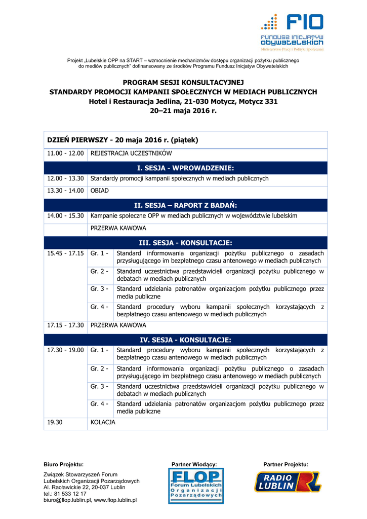 Projekt „Lubelskie OPP na START – wzmocnienie mechanizmów dostępu organizacji pożytku publicznego do mediów publicznych” dofinansowany ze środków Programu Fundusz Inicjatyw Obywatelskich PROGRAM SESJI KONSULTACYJNEJ STANDARDY PROMOCJI KAMPANII SPOŁECZNYCH W MEDIACH PUBLICZNYCH Hotel i Restauracja Jedlina, 21-030 Motycz, Motycz 331 20–21 maja 2016 r. DZIEŃ PIERWSZY - 20 maja 2016 r. (piątek) 11.00 - 12.00 REJESTRACJA UCZESTNIKÓW I. SESJA - WPROWADZENIE: 12.00 - 13.30 Standardy promocji kampanii społecznych w mediach publicznych 13.30 - 14.00 OBIAD II. SESJA – RAPORT Z BADAŃ: 14.00 - 15.30 Kampanie społeczne OPP w mediach publicznych w województwie lubelskim PRZERWA KAWOWA III. SESJA - KONSULTACJE: 15.45 - 17.15 17.15 - 17.30 Gr. 1 - Standard informowania organizacji pożytku publicznego o zasadach przysługującego im bezpłatnego czasu antenowego w mediach publicznych Gr. 2 - Standard uczestnictwa przedstawicieli organizacji pożytku publicznego w debatach w mediach publicznych Gr. 3 - Standard udzielania patronatów organizacjom pożytku publicznego przez media publiczne Gr. 4 - Standard procedury wyboru kampanii społecznych korzystających z bezpłatnego czasu antenowego w mediach publicznych PRZERWA KAWOWA IV. SESJA - KONSULTACJE: 17.30 - 19.00 19.30 Gr. 1 - Standard procedury wyboru kampanii społecznych korzystających z bezpłatnego czasu antenowego w mediach publicznych Gr. 2 - Standard informowania organizacji pożytku publicznego o zasadach przysługującego im bezpłatnego czasu antenowego w mediach publicznych Gr. 3 - Standard uczestnictwa przedstawicieli organizacji pożytku publicznego w debatach w mediach publicznych Gr. 4 - Standard udzielania patronatów organizacjom pożytku publicznego przez media publiczne KOLACJA Biuro Projektu: Związek Stowarzyszeń Forum Lubelskich Organizacji Pozarządowych Al. Racławickie 22, 20-037 Lublin tel.: 81 533 12 17 [email protected], www.flop.lublin.pl Partner Wiodący: Partner Projektu: Projekt „Lubelskie OPP na START – wzmocnienie mechanizmów dostępu organizacji pożytku publicznego do mediów publicznych” dofinansowany ze środków Programu Fundusz Inicjatyw Obywatelskich DZIEŃ DRUGI - 21 MAJA 2016 R. (SOBOTA) 07.30 - 8.30 ŚNIADANIE V. SESJA - KONSULTACJE: 08.30 - 10.00 10.00 - 10.15 Gr. 1 - Standard udzielania patronatów organizacjom pożytku publicznego przez media publiczne Gr. 2 - Standard procedury wyboru kampanii społecznych korzystających z bezpłatnego czasu antenowego w mediach publicznych Gr. 3 - Standard informowania organizacji pożytku publicznego o zasadach przysługującego im bezpłatnego czasu antenowego w mediach publicznych Gr. 4 - Standard uczestnictwa przedstawicieli organizacji pożytku publicznego w debatach w mediach publicznych PRZERWA KAWOWA VI. SESJA - KONSULTACJE: 10.15 - 11.45 11.45 - 12.00 Gr. 1 - Standard uczestnictwa przedstawicieli organizacji pożytku publicznego w debatach w mediach publicznych Gr. 2 - Standard udzielania patronatów organizacjom pożytku publicznego przez media publiczne Gr. 3 - Standard procedury wyboru kampanii społecznych korzystających z bezpłatnego czasu antenowego w mediach publicznych Gr. 4 - Standard informowania organizacji pożytku publicznego o zasadach przysługującego im bezpłatnego czasu antenowego w mediach publicznych PRZERWA KAWOWA VII. SESJA – KONSULTACJE: 12.00 - 13.30 Standard działania regionalnego partnerstwa na rzecz bezpłatnego informowania o nieodpłatnej działalności organizacji pożytku publicznego w mediach publicznych 13.30 - 14.00 OBIAD VIII. SESJA – PODSUMOWANIE: 14.00 - 15.30 Konsultacji standardów ukierunkowanych na wzmocnienie procesu efektywności i oddziaływania promocji kampanii społecznych w mediach publicznych Biuro Projektu: Związek Stowarzyszeń Forum Lubelskich Organizacji Pozarządowych Al. Racławickie 22, 20-037 Lublin tel.: 81 533 12 17 [email protected], www.flop.lublin.pl Partner Wiodący: Partner Projektu: