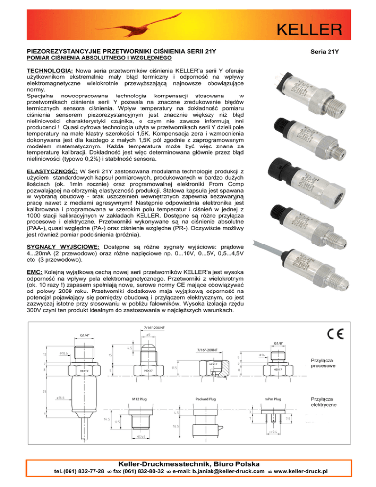 PIEZOREZYSTANCYJNE PRZETWORNIKI CIŚNIENIA SERII 21Y POMIAR CIŚNIENIA ABSOLUTNEGO I WZGLĘDNEGO Seria 21Y TECHNOLOGIA: Nowa seria przetworników ciśnienia KELLER’a serii Y oferuje użytkownikom ekstremalnie mały błąd termiczny i odporność na wpływy elektromagnetyczne wielokrotnie przewyższającą najnowsze obowiązujące normy. Specjalna nowoopracowana technologia kompensacji stosowana w przetwornikach ciśnienia serii Y pozwala na znaczne zredukowanie błędów termicznych sensora ciśnienia. Wpływ temperatury na dokładność pomiaru ciśnienia sensorem piezorezystancyjnym jest znacznie większy niż błąd nieliniowości charakterystyki czujnika, o czym nie zawsze informują inni producenci ! Quasi cyfrowa technologia użyta w przetwornikach serii Y dzieli pole temperatury na małe klastry szerokości 1,5K. Kompensacja zera i wzmocnienia dokonywana jest dla każdego z małych 1,5K pól zgodnie z zaprogramowanym modelem matematycznym. Każda temperatura może być więc znana za temperaturę kalibracji. Dokładność jest więc determinowana głównie przez błąd nieliniowości (typowo 0,2%) i stabilność sensora. ELASTYCZNOŚĆ: W Serii 21Y zastosowana modularna technologie produkcji z użyciem standardowych kapsuł pomiarowych, produkowanych w bardzo dużych ilościach (ok. 1mln rocznie) oraz programowalnej elektroniki Prom Comp pozwalającej na olbrzymią elastyczność produkcji. Stalowa kapsuła jest spawana w wybraną obudowę - brak uszczelnień wewnętrznych zapewnia bezawaryjną pracę nawet z mediami agresywnymi! Następnie odpowiednia elektronika jest kalibrowana i programowana w szerokim polu temperatur i ciśnień w jednej z 1000 stacji kalibracyjnych w zakładach KELLER. Dostępne są różne przyłącza procesowe i elektryczne. Przetworniki wykonywane są na ciśnienie absolutne (PAA-), quasi względne (PA-) oraz ciśnienie względne (PR-). Oczywiście możliwy jest również pomiar podciśnienia (próżnia). SYGNAŁY WYJŚCIOWE: Dostępne są różne sygnały wyjściowe: prądowe 4...20mA (2 przewodowo) oraz różne napięciowe np. 0...10V, 0...5V, 0,5...4,5V etc (3 przewodowo). EMC: Kolejną wyjątkową cechą nowej serii przetworników KELLER'a jest wysoka odporność na wpływy pola elektromagnetycznego. Przetworniki z wielokrotnym (ok. 10 razy !) zapasem spełniają nowe, surowe normy CE mające obowiązywać od połowy 2009 roku. Przetworniki dodatkowo maja wyjątkową odporność na potencjał pojawiający się pomiędzy obudową i przyłączem elektrycznym, co jest zazwyczaj istotne przy stosowaniu w pobliżu falowników. Wysoka izolacja rzędu 300V czyni ten produkt idealnym do zastosowania w najcięższych warunkach. Przyłącza elektryczne Keller-Druckmesstechnik, Biuro Polska tel. (061) 832-77-28 • fax (061) 832-80-32 • e-mail: [email protected] • www.keller-druck.pl DANE TECHNICZNE ZAKRESY CIŚNIENIOWE (FS) - wszelkie zakresy pośrednie możliwe, również mieszane np.: -0,5...2 bar PR-21Y PAA-21Y / PA-21Y Przeciążenie (-1) 0...2 do 0...20 bar (ciśnienie względne) 0...2 do 0...1000 bar (ciśnienie absolutne) / (ciśnienie quasi względne) 2 x zakres (inne na życzenie), maks. 1100 bar PAA: ciśnienie absolutne - zero w próżni, PA: ciśnienie quasi względne (sealed gauge)- zero przy 1 bar abs, PR: ciśnienie względne - zero przy ciśnieniu atmosferycznym DOKŁADNOŚĆ Liniowość (bfsl)* ±0,25% FS typ. ±0,5% FS max Całkowite Pole Błędu** ±1,0% FS max ±1,5% FS max 0...50°C -10...80°C * Obejmuje liniowość, histerezę, powtarzalność, ** Błąd całkowity obejmuje liniowość, histerezę, powtarzalność, nastawy zero/zakres i wpływ temperatury Temperatura pracy / przechowywania -40...100°C (inne na życzenie) Stabilność ±0,5% FS max ±0,3% FS max PRPAA-/PA- Typ 2 przewodowo 3 przewodowo 3 przewodowo Wyjście 4...20 mA 0...10V (0...5V i inne) 0,5...4,5V Ograniczenia 3,2...22,3 mA -1,2...11,2V 0,1...4,9V Zasilanie 8...32VDC 13...32VDC 8...32VDC Rezystancja obciążenia < (U-8V0/ 0,025A > 5kΩ > 5kΩ Częstotliwość pracy 2 kHz 2 kHz 2 kHz Max 5 mA Max 4 mA Prąd Przyłącze elektryczne - wtyczka: M12 (4 piny), Packard, mPm - kabel Przyłącze procesowe G1/4" męski, G1/8” męski, 7/16”-20UNF męskie i żeńskie, inne na życzenie Czas załączenia (0...99%) < 5ms Izolacja > 10MΩ przy 300VDC EMC EN 61000-6-2: 2005 / EN 61000-6-3: 2007 / EN 61326-2-3: 2006 Objętość martwa <0,1mm3 Materiały w kontakcie z medium - stal 316L (1.4404/1.4435) - Viton (uszczelka zewnętrzna, brak uszczelnień wewnętrznych) Stopień ochrony M12 / Packard mPm kabel IP67 (z odpowiednią wtyczką) IP65 (z odpowiednią wtyczką) IP54 Waga ok. 38 g (G1/8”) ok. 50 g (G1/4”) Wytrzymałość > 10 mln cykli 0...100% FS @ 25°C Opcje: inne zakresy temperatury (max -40...120°C), inne wypełnienia olejowe (zgodny z O2,, olej z oliwek, niskotemperaturowy etc), inne przyłącza procesowe Keller-Druckmesstechnik, Biuro Polska tel. (061) 832-77-28 • fax (061) 832-80-32 • e-mail: [email protected] • www.keller-druck.pl