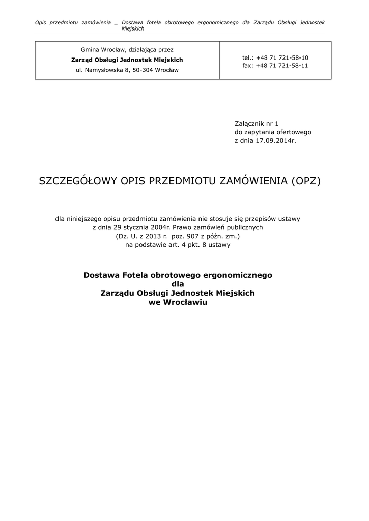 Opis przedmiotu zamówienia _ Dostawa fotela obrotowego ergonomicznego dla Zarządu Obsługi Jednostek Miejskich Gmina Wrocław, działająca przez Zarząd Obsługi Jednostek Miejskich ul. Namysłowska 8, 50-304 Wrocław tel.: +48 71 721-58-10 fax: +48 71 721-58-11 Załącznik nr 1 do zapytania ofertowego z dnia 17.09.2014r. SZCZEGÓŁOWY OPIS PRZEDMIOTU ZAMÓWIENIA (OPZ) dla niniejszego opisu przedmiotu zamówienia nie stosuje się przepisów ustawy z dnia 29 stycznia 2004r. Prawo zamówień publicznych (Dz. U. z 2013 r. poz. 907 z późn. zm.) na podstawie art. 4 pkt. 8 ustawy Dostawa Fotela obrotowego ergonomicznego dla Zarządu Obsługi Jednostek Miejskich we Wrocławiu Opis przedmiotu zamówienia _ Dostawa fotela obrotowego ergonomicznego dla Zarządu Obsługi Jednostek Miejskich 1. Informacje Podstawowe 1) Zamawiający Gmina Wrocław, działająca przez: Zarząd Obsługi Jednostek Miejskich ul. Namysłowska 8, 50-304 Wrocław. 2) Miejsce realizacji Zamówienia Zarządu Obsługi Jednostek Miejskich; ul. Namysłowska 8, 50-304 Wrocław. 3) Definicje Przedmiot zamówienia – oznacza dostawę fotela obrotowego ergonomicznego. Umowa – oznacza umowę zawartą pomiędzy Zamawiającym a Wykonawcom; KC – oznacza ustawę z dnia 23 kwietnia 1964 r. Kodeks cywilny (Dz. U. Nr 16, poz. 93 z późn. zm.). 2. Opis Przedmiotu Zamówienia 1) Opis przedmiotu zamówienia obejmuje dostawę fotela obrotowego ergonomicznego; Wymiary: wys. siedziska 40 do 52 cm, głęb. siedziska 41 cm, szer. siedziska 46 cm, ogólna wysokość 118 do 134 cm, ogólna głębokość 68 cm, ogólna szerokość 68 cm. Opis: Fotel być wyposażony w mechanizm regulacji wysokości siedziska LIFTMATIC w zakresie min. 12 cm, gwarantujący komfort oraz mechanizm synchro-dynamiczny z możliwością ustawienia kąta nachylenia siedziska i oparcia w czterech pozycjach i regulację siły nacisku w stosunku do ciężaru ciała co umożliwia jednoczesną (synchroniczną) zmianę kąta nachylenia oparcia i siedziska. Siedzisko wykonane z tworzywa z tapicerowaną poduszką. Poduszka siedziska posiada zaokrąglenie krawędzi przedniej w celu zmniejszenia ucisku na mięśnie ud i zapobiegania drętwieniu kończyn dolnych podczas utrzymywania pochylonej do przodu pozycji ciała (np. podczas pisania). Oparcie wykonane z wyprofilowanego tworzywa, z tapicerowaną poduszką, z regulacją wysokości w zakresie 60 mm z możliwością ustawienia w 7 pozycjach, pozwalającą na odpowiednie dopasowanie do naturalnego wygięcia kręgosłupa. Nośnik oparcia wykonany z tworzywa w kolorze czarnym z charakterystycznym elementem łączącym umiejscowionym w połowie wysokości oparcia. Wymiary siedziska i oparcia mają zapewniać korzystną pozycję ciała i swobodę ruchów. Poduszki oparcia i siedziska wykonane z wysokiej jakości pianki poliuretanowej odpornej na odkształcenia, pokryte specjalnymi tapicerkami przeznaczonymi do użytku w obiektach biurowych. Oparcie Opis przedmiotu zamówienia _ Dostawa fotela obrotowego ergonomicznego dla Zarządu Obsługi Jednostek Miejskich wyposażone w zagłówek z wahadłową regulacją kąta nachylenia. Zagłówek wykonany z wysokoplastycznej pianki poliestrowej ze zdolnością do odzyskiwania pierwotnego kształtu i przepuszczalnością powietrza dzięki otwarto porowatej strukturze komórkowej, w pełni tapicerowany, oparty na nośnikach z aluminium polerowanego. Fotel wyposażony w podłokietniki o szerokości min. 95 mm, zawieszone na szkielecie krzesła, z regulacją wysokości oraz szerokości w stosunku do siedziska, zgodnie z potrzebą dopasowania ułożenia przedramion w zależności do wykonywanych czynności. Podstawa fotela to pięcioramienny krzyżak wykonany z aluminium malowanego proszkowo na kolor antracyt o średnicy 680 mm, dający pełną stabilność, wyposażony w podwójne rolki samohamowne o średnicy 60 m, do różnego rodzaju podłoży – wykładziny dywanowe lub podłogi twarde co pozwala na zabezpieczenie przed przypadkowym odsunięciem w czasie siadania i wstawania ale jednocześnie umożliwiające swobodne przemieszczanie się w czasie pracy. Tapicerka – o wytrzymałości na ścieranie 70 000 cykli Martindale i odporność na światło: 5 ( zgodnie z normą ISO 105 – B02), Odporność na zapalenie: zgodnie z normą BS EN 1021 – 1 (tlący papieros) 2 (zapałka), skład: warstwa zewnętrzna: 100% Poliester, 35% w kolorze ciemno szary. Krzesło musi posiadać: atest wytrzymałościowy oraz ocenę ergonomiczną wystawioną przez Instytut Medycyny Pracy potwierdzającą zgodność krzesła z Rozporządzeniem Ministra Pracy i Polityki Socjalnej z 1 grudnia 1998 r., atest na trudnopalność i ścieralność tapicerki. 2) Zamawiający wymaga, by dostarczony Fotel obrotowy ergonomiczny był nowy (tzn. wyprodukowane nie dawniej, niż na 6 miesięcy przed jego dostarczeniem) oraz by był nieużywany. Na poświadczenie powyższego Wykonawca dostarczy stosowne potwierdzenie daty produkcji lub wskaże miejsce w którym producent zamieścił datę produkcji.