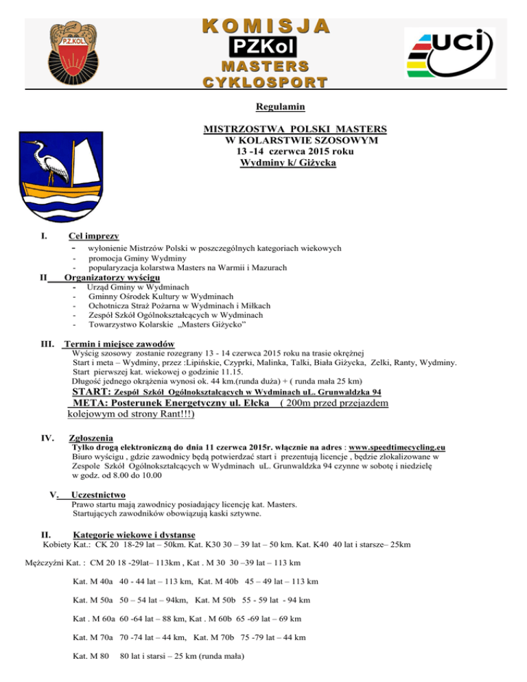 Regulamin MISTRZOSTWA POLSKI MASTERS W KOLARSTWIE SZOSOWYM 13 -14 czerwca 2015 roku Wydminy k/ Giżycka I. Cel imprezy - wyłonienie Mistrzów Polski w poszczególnych kategoriach wiekowych promocja Gminy Wydminy popularyzacja kolarstwa Masters na Warmii i Mazurach Organizatorzy wyścigu II - Urząd Gminy w Wydminach Gminny Ośrodek Kultury w Wydminach Ochotnicza Straż Pożarna w Wydminach i Miłkach Zespół Szkół Ogólnokształcących w Wydminach Towarzystwo Kolarskie „Masters Giżycko” III. Termin i miejsce zawodów Wyścig szosowy zostanie rozegrany 13 - 14 czerwca 2015 roku na trasie okrężnej Start i meta – Wydminy, przez :Lipińskie, Czyprki, Malinka, Talki, Biała Giżycka, Zelki, Ranty, Wydminy. Start pierwszej kat. wiekowej o godzinie 11.15. Długość jednego okrążenia wynosi ok. 44 km.(runda duża) + ( runda mała 25 km) START: Zespół Szkół Ogólnokształcących w Wydminach uL. Grunwaldzka 94 META: Posterunek Energetyczny ul. Ełcka kolejowym od strony Rant!!!) IV. ( 200m przed przejazdem Zgłoszenia Tylko drogą elektroniczną do dnia 11 czerwca 2015r. włącznie na adres : www.speedtimecycling.eu Biuro wyścigu , gdzie zawodnicy będą potwierdzać start i prezentują licencje , będzie zlokalizowane w Zespole Szkół Ogólnokształcących w Wydminach uL. Grunwaldzka 94 czynne w sobotę i niedzielę w godz. od 8.00 do 10.00 V. Uczestnictwo Prawo startu mają zawodnicy posiadający licencję kat. Masters. Startujących zawodników obowiązują kaski sztywne. II. Kategorie wiekowe i dystanse Kobiety Kat.: CK 20 18-29 lat – 50km. Kat. K30 30 – 39 lat – 50 km. Kat. K40 40 lat i starsze– 25km Mężczyźni Kat. : CM 20 18 -29lat– 113km , Kat . M 30 30 –39 lat – 113 km Kat. M 40a 40 - 44 lat – 113 km, Kat. M 40b 45 – 49 lat – 113 km Kat. M 50a 50 – 54 lat – 94km, Kat. M 50b 55 - 59 lat - 94 km Kat . M 60a 60 -64 lat – 88 km, Kat . M 60b 65 -69 lat – 69 km Kat. M 70a 70 -74 lat – 44 km, Kat. M 70b 75 -79 lat – 44 km Kat. M 80 80 lat i starsi – 25 km (runda mała) VII. Sposób przeprowadzenia wyścigu Wyścigi rozegrane zostaną zgodnie z przepisami PZKol i niniejszym regulaminem. 13 czerwca 2015r. (sobota) Program minutowy : 8.00-10.00 weryfikacja zawodników i pobieranie pakietów startowych . 11.00 otwarcie Mistrzostw Polski (plac szkolny). 11.15 start kat. M 50a – 94 km (2x25km + 44km) 11.20 start kat. M 50b - 94 km (2x25km + 44km) 11.25 start kat. CK 20 – 50km. (2x25km) 11.30 start kat. K30 – 50 km. (2x25km) 11.35 start kat.. K40 – 25km 11.37 start kat. M80 – 25 km Ok. godziny 15.15 dekoracja. 14 czerwca 2015r. (niedziela) Program minutowy : 8.00-10.00 weryfikacja zawodników i pobieranie pakietów startowych. 11.00 otwarcie zawodów (plac szkolny) 11.15 start kat. CM 20 – 113km (25km + 2x44km) 11.20 start kat. . M 30 - 113 km (25km + 2x44km) 11.25 start kat. M 40a – 113 km (25km + 2x44km) 11.30 start kat. M 40b – 113 km (25km + 2x44km) 11.35 start kat. M 60b – 69 km (25 km + 44km) 12.25 start kat. M 60a - 60 -64 lat – 88 km (2x44km) 12.30 start kat. M 70a – 44 km (runda duża) 12.35 start kat. M 70b – 44 km (runda duża) Ok. godziny 16.00 dekoracja i zamknięcie Mistrzostw Polski Masters. VIII. Nagrody I - miejsce w każdej kategorii wiekowej : tytuł i koszulka Mistrza Polski oraz medal. II – III miejsce: medale. IX. Opłata startowego Wysokość opłaty startowej wynosi 40 zł dla kat. CK20,CM 20 do M60 i 20 zł. dla kat. M70-M80, do dnia 10 czerwca 2015r. włącznie na konto: B.G.Ż o/w Giżycku 13 2030 0045 1110 0000 0334 5110 Towarzystwo Kolarskie „MASTERS GIŻYCKO” ul. Warszawska 28, 11-500 Giżycko, z dopiskiem „startowe MP i podać kategorię wiekową!!! W wyjątkowych przypadkach organizator dopuszcza możliwość opłaty startowej w godzinach pracy biura. X. Kontrola antydopingowa zgodnie z przepisami UCI i PZKOL XI. Postanowienia końcowe . Wyścigi odbędą się na trasie okrężnej przy „częściowo ograniczonym ruchu drogowym” dla zasadniczej grupy . Pozostali kolarze zobowiązani są do przestrzegania przepisów ruchu drogowego Obowiązuje uczestników ruch tylko i wyłącznie prawostronny - . Każdy zawodnik ubezpiecza się od następstw nieszczęśliwych wypadków we własnym zakresie / OC i NW/ i uczestniczy w wyścigu na własną odpowiedzialność. Organizator nie odpowiada za szkody wyrządzone przez lub na rzecz uczestników wyścigów i osób towarzyszących . Komisję Sędziowską zaprasza organizator, wytypowaną przez Warmińsko-Mazurski Związek Kolarski w Olsztynie . Organizator zastrzega sobie prawo do interpretacji niniejszego regulaminu w porozumieniu Sędzią Głównym wyścigu . Odpowiedzialnym za przebieg i bezpieczeństwo imprezy z ramienia organizatora jest Jerzy Gawarecki – Prezes Towarzystwa Kolarskiego „ Masters Giżycko” tel. 0 – 502 84 10 33, e – mail : masters7@ wp.pl Adres szpitala : Samodzielny Publiczny Zakład Opieki Zdrowotnej w Giżycku ul.Warszawska 41 tel. centrali : 0 – 87 428 52 71 IMPREZA FINANSOWANA ZE ŚRODKÓW BUDŻETOWYCH URZĘDU GMINY W WYDMINACH I STAROSTWA POWIATOWEGO W GIŻYCKU. T O W A R Z Y S T W O K O L A R S K I E “ M A S T E R S G I Ż Y C K O ” ul. Warszawska 28 11 – 500 Giżycko tel. 0 – 502- 841-033 e – mail: [email protected] G IŻ Y C K O Baza noclegowa dostępna na terenie Gminy Wydminy Rodzaj, atrakcje, charakter Pensjonat Rybak Pensjonat nad jeziorem Pecjonat Victoria Pensjonat z restauracją, nad jeziorem, domki letniskowe Pensjonat ze stołówką Pensjonat Skorpion Pensjonat „Szostak” Pensjonat „Sielanka” Pensjonat „Placówka” Pensjonat ze stołówką, nad jeziorem Pensjonat ze stołówką, nad jeziorem, przy wyciągu narciarskim Pensjonat Kontakt tel. (87) 421 02 95 www.pensjonat-rybak.com Chmielewska Alicja Krzyczewska Janina tel. 502 515 410, 513 078 778 Wydminy, ul. Suwalska 11a tel. 87 421 02 95, 87 516 050 096 Garbowska Jadwiga tel. 87 42 12 162 www.gosciniecszostak.republika.pl