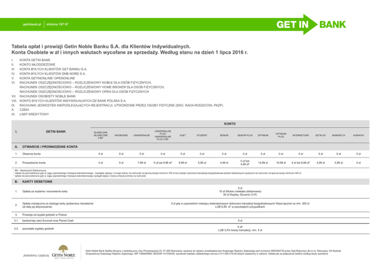 getinbank.pl infolinia 197 97 Tabela opłat i prowizji Getin Noble Banku S.A. dla Klientów Indywidualnych. Konta Osobiste w zł i innych walutach wycofane ze sprzedaży. Według stanu na dzień 1 lipca 2016 r. I. II. III. IV. V. VI. KONTA GETIN BANK KONTO MŁODZIEŻOWE KONTA BYŁYCH KLIENTÓW GET BANKU S.A. KONTA BYŁYCH KLIENTÓW DNB NORD S.A. KONTA GETINONLINE/ OPENONLINE RACHUNEK OSZCZĘDNOŚCIOWO – ROZLICZENIOWY NOBLE DLA OSÓB FIZYCZNYCH, RACHUNEK OSZCZĘDNOŚCIOWO – ROZLICZENIOWY HOME BROKER DLA OSÓB FIZYCZNYCH, RACHUNEK OSZCZĘDNOŚCIOWO – ROZLICZENIOWY OPEN DLA OSÓB FIZYCZNYCH VII. RACHUNEK OSOBISTY NOBLE BANK VIII. KONTO BYŁYCH KLIENTÓW INDYWIDUALNYCH DZ BANK POLSKA S.A. IX. RACHUNKI JEDNOSTEK NIEPODLEGAJĄCYCH REJESTRACJI, UTWORZONE PRZEZ OSOBY FIZYCZNE (SKO, RADA RODZICÓW, PKZP) X. CZEKI XI. LIMIT KREDYTOWY KONTO I. 1 2 3 GETIN BANK SŁONECZNE /SŁONECZNE Z BE1 SWOBODNE UNIWERSALNE UNIWERSALNE PLUS/ UNIWERSALNE PLUS Z BE1 DUET STUDENT SENIOR SENIOR PLUS OPTIMUM OPTIMUM PLUS INTERNETOWE GETIN 241 BANKIER 24 AGRAFKA A. OTWARCIE I PROWADZENIE KONTA 1. Otwarcie konta 0 zł 0 zł 0 zł 0 zł 0 zł 0 zł 0 zł 0 zł 0 zł 0 zł 0 zł 0 zł 0 zł 0 zł 2. Prowadzenie konta 0 zł 0 zł 7,99 zł 0 zł lub 9,99 zł2 9,99 zł 5,99 zł 4,99 zł 0 zł lub 4,99 zł3 14,99 zł 19,99 zł 0 zł lub 9,99 zł2 4,99 zł 4,99 zł 0 zł BE – Bankowość Elektroniczna opłata nie jest pobierana gdy w ciągu poprzedniego miesiąca kalendarzowego: wystąpiły wpływy z innego banku na rachunek na łączną kwotę minimum 750 zł lub zostały rozliczone transakcje bezgotówkowe kartami debetowymi wydanymi do rachunku na łączną kwotę minimum 400 zł opłata nie jest pobierana gdy w ciągu poprzedniego miesiąca kalendarzowego wystąpił wpływ z tytułu emerytury/renty na rachunek B. KARTY DEBETOWE 1. Opłata za wydanie i wznowienie karty 2. Opłata miesięczna za obsługę karty (pobierana niezależnie od daty jej aktywowania) 3. Prowizja od wypłat gotówki w Polsce: 3.1. bankomaty sieci Euronet oraz Planet Cash 3.2. pozostałe wypłaty gotówki Jesteśmy częścią 0 zł 10 zł Sticker (naklejka zbliżeniowa) 50 zł Display, Dynamic CVC 0 zł gdy w poprzednim miesiącu kalendarzowym dokonano transakcji bezgotówkowych/ iKasa łącznie na min. 300 zł LUB 6,99 zł1 w pozostałych przypadkach 0 zł 0 zł2 LUB 3,5% kwoty transakcji, min. 5 zł Getin Noble Bank Spółka Akcyjna z siedzibą przy ulicy Przyokopowej 33, 01-208 Warszawa, wpisana do rejestru przedsiębiorców Krajowego Rejestru Sądowego pod numerem 0000304735 przez Sąd Rejonowy dla m.st. Warszawy, XII Wydział Gospodarczy Krajowego Rejestru Sądowego, NIP 1080004850, REGON 141334039, wysokość kapitału zakładowego wynosi 2.411.630.419,38 złotych (wpłacony w całości). Opłata jak za połączenie lokalne według taryfy operatora. 4. Prowizja od wypłat gotówki za granicą 4,5% kwoty transakcji, min. 10 zł 5. Prowizja od wpłat gotówki we wpłatomatach poza placówką Banku 0,6 % od kwoty wpłaty min. 1 zł 6. Opłata za sprawdzenie dostępnych środków w bankomacie 7. Opłata za przesłanie karty kurierem 0,99 zł 30 zł Opłata nie jest pobierana od Klientów, którzy nie ukończyli 28 roku życia oraz od kart: NFC, HCE, Opaska Kibica, Sticker, Student (legitymacja studencka). 2 W przypadku spełnienia następujących warunków w danym miesiącu kalendarzowym: wpływ w formie przelewu przychodzącego na Konto Osobiste z innych banków lub z rachunków firmowych prowadzonych przez Bank w łącznej kwocie minimum 1000 zł oraz dokonania transakcji bezgotówkowych/ iKasa na kwotę min. 300 zł i wyrażenia wszystkich zgód marketingowych dla Banku (w tym adres e-mail oraz numer telefonu komórkowego) na ostatni dzień roboczy miesiąca. 1 C. PŁATNOŚCI W ZŁ DO BANKÓW KRAJOWYCH 1.1. Przelew wewnętrzny na rachunek w Banku dokonany w placówce Banku 0 zł 7,99 zł 0 zł 0 zł 0 zł 0 zł 0 zł 0 zł 0 zł 0 zł 0 zł 0 zł 0 zł 0 zł 1.2. Przelew wewnętrzny na rachunek w Banku przez Bankowość Telefoniczną 0 zł 4,99 zł 0 zł 0 zł 0 zł 0 zł 0 zł 0 zł 0 zł 0 zł 0 zł 0 zł 0 zł 0 zł 2. Przelew zewnętrzny na rachunek w innym banku: 5,99 zł 7,99 zł 5,99 zł 5,99 zł 5,99 zł 5,99 zł 5,99 zł 5,99 zł 0 zł 0 zł 5,99 zł 6,99 zł 6,99 zł 4,99 zł 2.1. przelew w placówce Banku 2.2. przelew przez Bankowość Internetową 0 zł 0 zł 1,49 zł 0 zł 1,49 zł 1,49 zł 1,49 zł 1,49 zł 0 zł 0 zł 0 zł 0 zł 0 zł 0 zł 2.3. przelew przez Bankowość Telefoniczną 2,49 zł 4,99 zł 2,49 zł 2,49 zł 2,49 zł 2,49 zł 2,49 zł 2,49 zł 0 zł 0 zł 2,49 zł 1,99 zł 1,99 zł 1,99 zł 2.4. SMS Serwis 0 zł nie dotyczy 1,49 zł 0 zł 1,49 zł 1,49 zł 1,49 zł 1,49 zł 0 zł 0 zł 0 zł 0 zł 0 zł nie dotyczy 3.1. Przelew SORBNET w kwocie od 1 mln zł 5,99 zł 5,99 zł 5,99 zł 5,99 zł 5,99 zł 5,99 zł 5,99 zł 5,99 zł 5,99 zł 5,99 zł 5,99 zł 5,99 zł 5,99 zł 5,99 zł 3.2. Przelew SORBNET w kwocie do 1 mln zł 20 zł 20 zł 20 zł 20 zł 20 zł 20 zł 20 zł 20 zł 20 zł 20 zł 20 zł 20 zł 20 zł 20 zł 4. Dodatkowe potwierdzenie przelewu w formie papierowej wydawane w placówce Banku 4 zł 4 zł 4 zł 4 zł 4 zł 4 zł 4 zł 4 zł 4 zł 4 zł 4 zł 4 zł 4 zł 4 zł D. WPŁATY/ WYPŁATY GOTÓWKOWE 1. Wpłata/wypłata gotówkowa na rachunek/ z rachunku 0 zł 0 zł 0 zł 0 zł 0 zł 0 zł 0 zł 0 zł 0 zł 0 zł 0 zł 0 zł 0 zł 0 zł 2. Wpłaty gotówkowe na rachunek w innym banku 3. Niezrealizowanie wypłaty gotówkowej podlegającej awizacji w uzgodnionym terminie 4. Wpłata w bilonie w walutach obcych CHF, EUR (opłata nie dotyczy spłat rat kredytów/pożyczek) E. POLECENIE ZAPŁATY, ZLECENIA STAŁE 1. Uruchomienie/ realizacja/ odwołanie polecenia zapłaty 0 zł 0 zł 0 zł 0 zł 0 zł 0 zł 0 zł 0 zł 0 zł 0 zł 0 zł 0 zł 0 zł 0 zł 2. Uruchomienie/ realizacja/ odwołanie zlecenia stałego o jednolitej kwocie 0 zł 0 zł 0 zł 0 zł 0 zł 0 zł 0 zł 0 zł 0 zł 0 zł 0 zł 0 zł 0 z