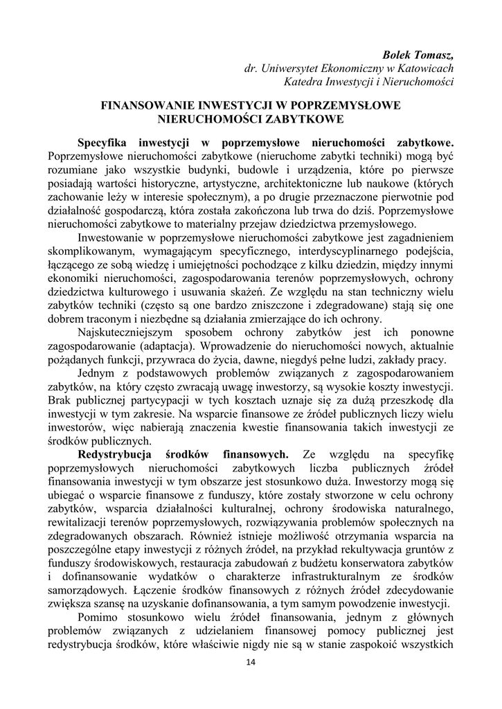Bolek Tomasz, dr. Uniwersytet Ekonomiczny w Katowicach Katedra Inwestycji i Nieruchomości FINANSOWANIE INWESTYCJI W POPRZEMYSŁOWE NIERUCHOMOŚCI ZABYTKOWE Specyfika inwestycji w poprzemysłowe nieruchomości zabytkowe. Poprzemysłowe nieruchomości zabytkowe (nieruchome zabytki techniki) mogą być rozumiane jako wszystkie budynki, budowle i urządzenia, które po pierwsze posiadają wartości historyczne, artystyczne, architektoniczne lub naukowe (których zachowanie leży w interesie społecznym), a po drugie przeznaczone pierwotnie pod działalność gospodarczą, która została zakończona lub trwa do dziś. Poprzemysłowe nieruchomości zabytkowe to materialny przejaw dziedzictwa przemysłowego. Inwestowanie w poprzemysłowe nieruchomości zabytkowe jest zagadnieniem skomplikowanym, wymagającym specyficznego, interdyscyplinarnego podejścia, łączącego ze sobą wiedzę i umiejętności pochodzące z kilku dziedzin, między innymi ekonomiki nieruchomości, zagospodarowania terenów poprzemysłowych, ochrony dziedzictwa kulturowego i usuwania skażeń. Ze względu na stan techniczny wielu zabytków techniki (często są one bardzo zniszczone i zdegradowane) stają się one dobrem traconym i niezbędne są działania zmierzające do ich ochrony. Najskuteczniejszym sposobem ochrony zabytków jest ich ponowne zagospodarowanie (adaptacja). Wprowadzenie do nieruchomości nowych, aktualnie pożądanych funkcji, przywraca do życia, dawne, niegdyś pełne ludzi, zakłady pracy. Jednym z podstawowych problemów związanych z zagospodarowaniem zabytków, na który często zwracają uwagę inwestorzy, są wysokie koszty inwestycji. Brak publicznej partycypacji w tych kosztach uznaje się za dużą przeszkodę dla inwestycji w tym zakresie. Na wsparcie finansowe ze źródeł publicznych liczy wielu inwestorów, więc nabierają znaczenia kwestie finansowania takich inwestycji ze środków publicznych. Redystrybucja środków finansowych. Ze względu na specyfikę poprzemysłowych nieruchomości zabytkowych liczba publicznych źródeł finansowania inwestycji w tym obszarze jest stosunkowo duża. Inwestorzy mogą się ubiegać o wsparcie finansowe z funduszy, które zostały stworzone w celu ochrony zabytków, wsparcia działalności kulturalnej, ochrony środowiska naturalnego, rewitalizacji terenów poprzemysłowych, rozwiązywania problemów społecznych na zdegradowanych obszarach. Również istnieje możliwość otrzymania wsparcia na poszczególne etapy inwestycji z różnych źródeł, na przykład rekultywacja gruntów z funduszy środowiskowych, restauracja zabudowań z budżetu konserwatora zabytków i dofinansowanie wydatków o charakterze infrastrukturalnym ze środków samorządowych. Łączenie środków finansowych z różnych źródeł zdecydowanie zwiększa szansę na uzyskanie dofinansowania, a tym samym powodzenie inwestycji. Pomimo stosunkowo wielu źródeł finansowania, jednym z głównych problemów związanych z udzielaniem finansowej pomocy publicznej jest redystrybucja środków, które właściwie nigdy nie są w stanie zaspokoić wszystkich 14 aktualnych potrzeb. Przydział tych środków, dokonywany przez właściwe publiczne instytucje, pomiędzy różne podmioty może być dokonywany według wielu kryteriów, jednym z nich jest na przykład ekonomiczny potencjał nieruchomości. Jest to koncepcja stworzona przez CABERNET (Concerted Action on Brownfield and Economic Regeneration Network, Europejska Sieć Zrównoważonej Odnowy Terenów Poprzemysłowych – www.cabernet.org.uk) i z powodzeniem jest wykorzystywana przez jednostki samorządu terytorialnego do strategicznego zarządzania zasobami terenów poprzemysłowych (zaprezentowany model służy obecnie do analizowania terenów zdegradowanych, jednak z powodzeniem może być zaadaptowany do poprzemysłowych nieruchomości zabytkowych). W opisywanym modelu, nieruchomości podzielono na trzy kategorie: A, B, C, które przedstawiono w tabeli 1. Wyodrębniono je kierując się następującymi czynnikami [Tereny…, s. 73]: koszty nabycia nieruchomości; pośredni jak również bezpośredni koszt regeneracji, rekultywacji gruntów; koszty adaptacji; przewidywane dochody z nieruchomości; rodzaj finansowania i związane z nim ryzyka finansowe; państwowe i lokalne podatki i ich dostrzegalne ryzyko wahań; wszelkie porozumienia w sprawie rozwoju pomiędzy właścicielem a/lub władzami samorządowymi miasta i deweloperem; przyszła wartość nieruchomości. Tabela 1 – Kategorie ekonomiczne nieruchomości poprzemysłowych na płaszczyźnie ich rentowności Kategoria nieruchomości A B C Charakterystyka nieruchomości poprzemysłowych Są to nieruchomości bardzo rentowne ekonomicznie, a projekty rozwoju są prowadzone z funduszy prywatnych. Nieruchomości określone jako tereny na granicy opłacalności. Projekty takie są finansowane zwykle dzięki stosunkowo niewielkim funduszom zewnętrznym lub współpracy publicznoprywatnej. Nieruchomości, których zagospodarowanie jest nieopłacalne. Ciężar adaptacji, regeneracji gruntów w dużej mierze spoczywa na sektorze publicznym. Aby pobudzać adaptację tych obiektów, potrzebne są niezbędne fundusze publiczne lub konkretne instrumenty prawne (np. bodziec podatkowy). Są to nieruchomości nieatrakcyjne z punktu widzenia rynku nieruchomości i inwestorów na nim funkcjonujących. Źródło: opracowanie własne na podstawie [Tereny…, s. 74] Na rysunku przedstawiono opisywane kategorie w powiązaniu z ich obecną i przyszłą wartością. Kolumny wskazują całkowite koszty inwestycji, a przebiegająca linia opłacalności (break even value line) wskazuje na wartość nieruchomości po zakończeniu procesu adaptacji. W przypadku nieruchomości kategorii A koszty inwestycji są zdecydowanie niższe aniżeli wartość końcowa projektu, zatem projekt 15 inwestycyjny przeprowadzony na tej konkretnej poprzemysłowej nieruchomości nie wymaga zewnętrznych źródeł fi