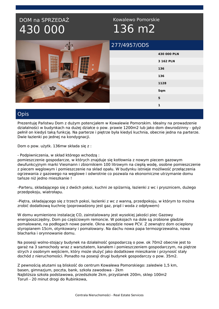 Kowalewo Pomorskie DOM na SPRZEDAŻ 136 m2 430 000 277/4957/ODS 430 000 PLN 3 162 PLN 136 136 1128 Sqm 5 1 Opis Prezentuję Państwu Dom z dużym potencjałem w Kowalewie Pomorskim. Idealny na prowadzenie działalności w budynkach na dużej działce o pow. prawie 1200m2 lub jako dom dwurodzinny - gdyż pełnił on kiedyś taką funkcję. Na parterze i piętrze była kiedyś kuchnia, obecnie jedna na parterze. Dwie łazienki po jednej na kondygnacji. Dom o pow. użytk. 136mw składa się z : - Podpiwniczenia, w skład którego wchodzą : pomieszczenie gospodarcze, w których znajduje się kotłownia z nowym piecem gazowym dwufunkcyjnym marki Viesmann i zbiornikiem 100 litrowym na ciepłą wodę, osobne pomieszczenie z piecem węglowym i pomieszczenie na skład opału. W budynku istnieje możliwość przełączenia ogrzewania z gazowego na węglowe i odwrotnie co pozwala na ekonomiczne utrzymanie domu tańsze niż jedno mieszkanie ! -Parteru, składającego się z dwóch pokoi, kuchni ze spiżarnią, łazienki z wc i prysznicem, dużego przedpokoju, wiatrołapu. -Piętra, składającego się z trzech pokoi, łazienki z wc z wanną, przedpokoju, w którym to można zrobić dodatkową kuchnię (poprowadzony jest gaz, prąd i woda z odpływem) W domu wymieniono instalację CO, zainstalowany jest wysokiej jakości piec Gazowy energooszczędny, Dom po częściowym remoncie. W pokojach na dole są zrobione gładzie pomalowane, na podłogach nowe panele. Okna wszędzie nowe PCV. Z zewnątrz dom ocieplony styropianem 15cm, otynkowany i pomalowany. Na dachu nowa papa termozgrzewalna, nowa blacharka i orynnowanie domu. Na posesji wolno-stojący budynek na działalność gospodarczą o pow. ok 70m2 obecnie jest to garaż na 3 samochody wraz z warsztatem, kanałem i pomieszczeniem gospodarczym, na piętrze strych z osobnym wejściem, który może służyć jako dodatkowe mieszkanie i przynosić stały dochód z nieruchomości. Ponadto na posesji drugi budynek gospodarczy o pow. 35m2. Z pewnością atutami są bliskość do centrum Kowalewa Pomorskiego: zaledwie 1,5 km, basen, gimnazjum, poczta, bank, szkoła zawodowa - 2km Najbliższa szkoła podstawowa, przedszkole 2km, przystanek 200m, sklep 100m2 Toruń - 20 minut drogi do Rubinkowa, Centrala Nieruchomości - Real Estate Services Golub Dobrzyń - 12 km, Wąbrzeźno - 16km, Zachęcam do osobistego obejrzenia domu na żywo. Wyróżnia się on wyjątkowym położeniem z dala od zgiełku miasta, na spokojnych obszarach rolnych gdzie można wypocząć po ciężkim dniu pracy w ciszy i spokoju. Dookoła duża przestrzeń i wolność. Centrala Nieruchomości: ZAPEWNIAMY BEZPŁATNE I PROFESJONALNE DORADZTWO ZARÓWNO W ZAKRESIE NIERUCHOMOŚCI JAK I POZYSKIWANIU POD NIE KREDYTÓW HIPOTECZNYCH Powyższe informacje zostały sporządzone na podstawie oświadczeń właścicieli i nie są ofertą w rozumieniu przepisów Kodeksu Cywilnego. Mają one jedynie charakter informacyjny. Większość naszych klientów pochodzi z polecenia - ZAUFAJ NAM I TY I NIE CZEKAJ, AŻ KTOŚ CIĘ WYPRZEDZI! Zadzwoń i umów się na prezentację ! Nr licencji pośrednika odpowiedzialnego za wykonanie umowy pośrednictwa 14260. zobacz inne nasze oferty na www.centralanieruchomosci.pl facebook.com/Centrala.N Karol Rutkowski tel. (+48) 530 808 888 email: [email protected] Centrala Nieruchomości - Real Estate Services Powered by TCPDF (www.tcpdf.org)