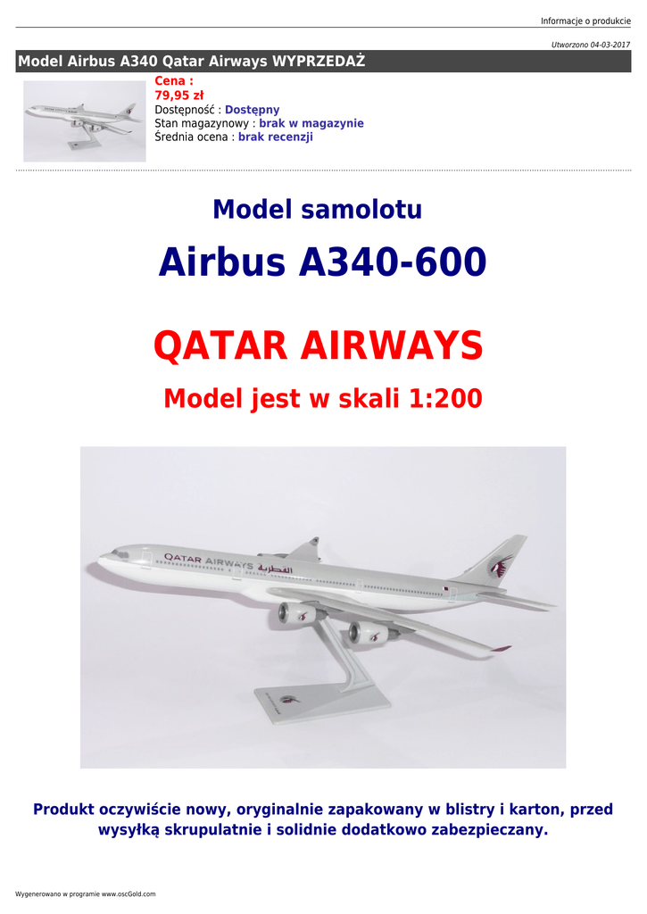 Informacje o produkcie Utworzono 04-03-2017 Model Airbus A340 Qatar Airways WYPRZEDAŻ Cena : 79,95 zł Dostępność : Dostępny Stan magazynowy : brak w magazynie Średnia ocena : brak recenzji Model samolotu Airbus A340-600 QATAR AIRWAYS Model jest w skali 1:200 Produkt oczywiście nowy, oryginalnie zapakowany w blistry i karton, przed wysyłką skrupulatnie i solidnie dodatkowo zabezpieczany. Wygenerowano w programie www.oscGold.com Wymiary modelu: - Długość 38!!! cm - Rozpiętość skrzydeł 32 cm
