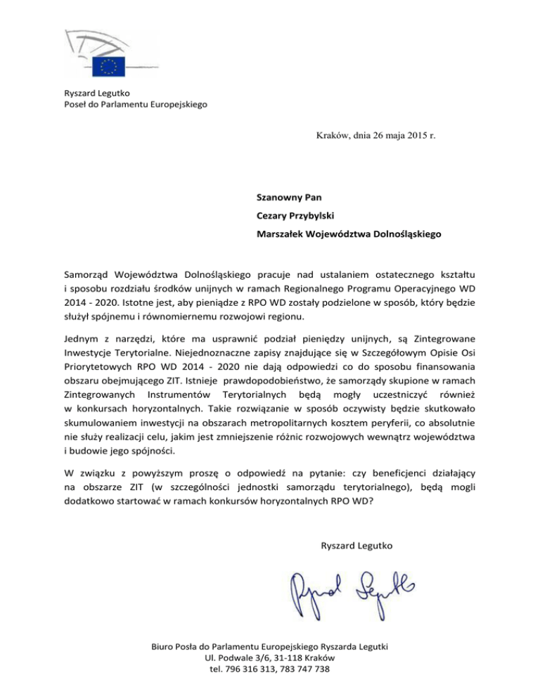 Ryszard Legutko Poseł do Parlamentu Europejskiego Kraków, dnia 26 maja 2015 r. Szanowny Pan Cezary Przybylski Marszałek Województwa Dolnośląskiego Samorząd Województwa Dolnośląskiego pracuje nad ustalaniem ostatecznego kształtu i sposobu rozdziału środków unijnych w ramach Regionalnego Programu Operacyjnego WD 2014 - 2020. Istotne jest, aby pieniądze z RPO WD zostały podzielone w sposób, który będzie służył spójnemu i równomiernemu rozwojowi regionu. Jednym z narzędzi, które ma usprawnić podział pieniędzy unijnych, są Zintegrowane Inwestycje Terytorialne. Niejednoznaczne zapisy znajdujące się w Szczegółowym Opisie Osi Priorytetowych RPO WD 2014 - 2020 nie dają odpowiedzi co do sposobu finansowania obszaru obejmującego ZIT. Istnieje prawdopodobieństwo, że samorządy skupione w ramach Zintegrowanych Instrumentów Terytorialnych będą mogły uczestniczyć również w konkursach horyzontalnych. Takie rozwiązanie w sposób oczywisty będzie skutkowało skumulowaniem inwestycji na obszarach metropolitarnych kosztem peryferii, co absolutnie nie służy realizacji celu, jakim jest zmniejszenie różnic rozwojowych wewnątrz województwa i budowie jego spójności. W związku z powyższym proszę o odpowiedź na pytanie: czy beneficjenci działający na obszarze ZIT (w szczególności jednostki samorządu terytorialnego), będą mogli dodatkowo startować w ramach konkursów horyzontalnych RPO WD? Ryszard Legutko Biuro Posła do Parlamentu Europejskiego Ryszarda Legutki Ul. Podwale 3/6, 31-118 Kraków tel. 796 316 313, 783 747 738