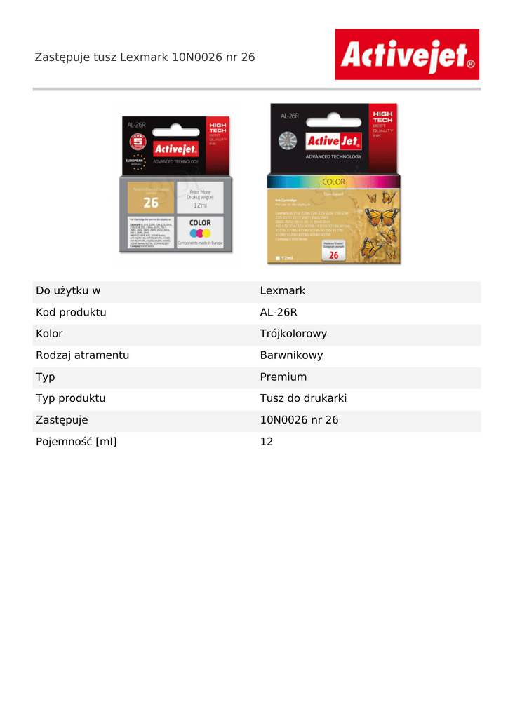 Zastępuje tusz Lexmark 10N0026 nr 26 Do użytku w Lexmark Kod produktu AL-26R Kolor Trójkolorowy Rodzaj atramentu Barwnikowy Typ Premium Typ produktu Tusz do drukarki Zastępuje 10N0026 nr 26 Pojemność [ml] 12