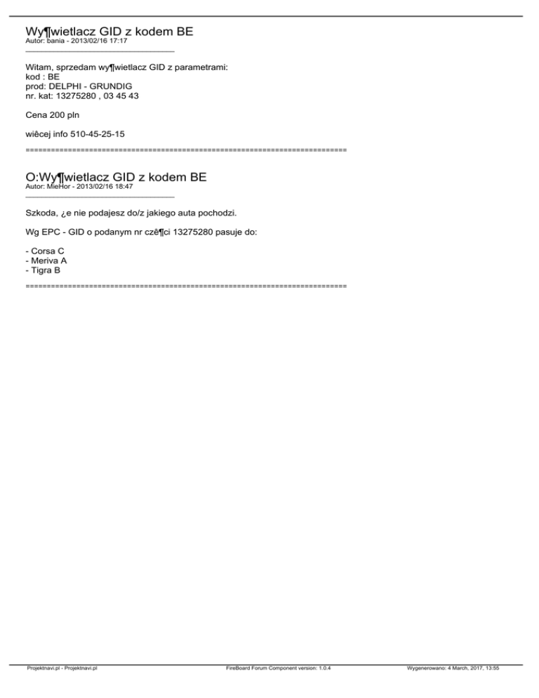 Wy¶wietlacz GID z kodem BE Autor: bania - 2013/02/16 17:17 _____________________________________ Witam, sprzedam wy¶wietlacz GID z parametrami: kod : BE prod: DELPHI - GRUNDIG nr. kat: 13275280 , 03 45 43 Cena 200 pln wiêcej info 510-45-25-15 ============================================================================ O:Wy¶wietlacz GID z kodem BE Autor: MieHor - 2013/02/16 18:47 _____________________________________ Szkoda, ¿e nie podajesz do/z jakiego auta pochodzi. Wg EPC - GID o podanym nr czê¶ci 13275280 pasuje do: - Corsa C - Meriva A - Tigra B ============================================================================ Projektnavi.pl - Projektnavi.pl FireBoard Forum Component version: 1.0.4 Wygenerowano: 4 March, 2017, 13:55
