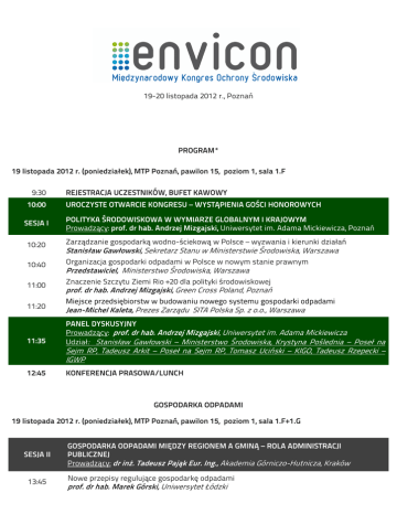 19-20 listopada 2012 r., Poznań PROGRAM* 19 listopada 2012 r. (poniedziałek), MTP Poznań, pawilon 15, poziom 1, sala 1.F 9:30 10:00 SESJA I 10:20 10:40 11:00 11:20 11:35 REJESTRACJA UCZESTNIKÓW, BUFET KAWOWY UROCZYSTE OTWARCIE KONGRESU – WYSTĄPIENIA GOŚCI HONOROWYCH POLITYKA ŚRODOWISKOWA W WYMIARZE GLOBALNYM I KRAJOWYM Prowadzący: prof. dr hab. Andrzej Mizgajski, Uniwersytet im. Adama Mickiewicza, Poznań Zarządzanie gospodarką wodno-ściekową w Polsce – wyzwania i kierunki działań Stanisław Gawłowski, Sekretarz Stanu w Ministerstwie Środowiska, Warszawa Organizacja gospodarki odpadami w Polsce w nowym stanie prawnym Przedstawiciel, Ministerstwo Środowiska, Warszawa Znaczenie Szczytu Ziemi Rio +20 dla polityki środowiskowej prof. dr hab. Andrzej Mizgajski, Green Cross Poland, Poznań Miejsce przedsiębiorstw w budowaniu nowego systemu gospodarki odpadami Jean-Michel Kaleta, Prezes Zarządu SITA Polska Sp. z o.o., Warszawa PANEL DYSKUSYJNY Prowadzący: prof. dr hab. Andrzej Mizgajski, Uniwersytet im. Adama Mickiewicza Udział: Stanisław Gawłowski – Ministerstwo Środowiska, Krystyna Poślednia – Poseł na Sejm RP, Tadeusz Arkit – Poseł na Sejm RP, Tomasz Uciński – KIGO, Tadeusz Rzepecki – IGWP 12:45 KONFERENCJA PRASOWA/LUNCH GOSPODARKA ODPADAMI 19 listopada 2012 r. (poniedziałek), MTP Poznań, pawilon 15, poziom 1, sala 1.F+1.G SESJA II 13:45 GOSPODARKA ODPADAMI MIĘDZY REGIONEM A GMINĄ – ROLA ADMINISTRACJI PUBLICZNEJ Prowadzący: dr inż. Tadeusz Pająk Eur. Ing., Akademia Górniczo-Hutnicza, Kraków Nowe przepisy regulujące gospodarkę odpadami prof. dr hab. Marek Górski, Uniwersytet Łódzki 14:00 14:10 14:25 14:40 Bank jako instytucja wspierająca rozwój rynku gospodarki odpadami Krzysztof Telega, Wiceprezes Zarządu Banku Ochrony Środowiska S.A. Partnerstwo samorządu województwa i gmin w budowaniu wojewódzkich planów gospodarki odpadami Anna Grapatyn-Korzeniowska, z-ca Dyrektora Departamentu Środowiska i Rolnictwa, Urząd Marszałkowski Województwa Pomorskiego, Gdańsk Rola dużych miast w budowie regionalnych systemów gospodarki odpadami Bożena Przewoźna, Dyrektor Wydziału Gospodarki Komunalnej i Mieszkaniowej, Urząd Miasta Poznania Przetarg na odbiór odpadów jako element systemu gospodarowania odpadami Katarzyna Kuźma, Domański Zakrzewski Palinka sp.k., Warszawa 14:55 PODSUMOWANIE SESJI 15:20 BUFET KAWOWY SESJA III POLSKI RYNEK GOSPODARKI ODPADAMI Prowadzący: prof. dr hab. Marek Górski, Uniwersytet Łódzki 15:50 Pozycja MBP w systemach gospodarki odpadami 16:05 Rozwój spalarni w Polsce, szansa czy porażka? 16:20 Zagospodarowanie odpadów tworzyw sztucznych w Polsce - gdzie jesteśmy, dokąd zmierzamy prof. dr hab. inż. Andrzej Jędrczak, Uniwersytet Zielonogórski dr inż. Tadeusz Pająk Eur. Ing., Akademia Górniczo-Hutnicza, Kraków dr inż. Kazimierz Borkowski, Dyrektor Zarządzający Fundacji PlasticsEurope Polska 16:30 16:45 Paliwa alternatywne jako sposób przekształcania odpadów dr inż. Aleksander Sobolewski, z-ca Dyrektora Instytutu Chemicznej Przeróbki Węgla, Zabrze Modele organizacji odbioru odpadów w kontekście wyboru metody przetwarzania Przedstawiciel, FB Serwis S.A., Warszawa Rynek zużytego sprzętu elektrycznego i elektronicznego – potencjał i wykorzystanie 16:55 Wojciech Konecki, Dyrektor Generalny CECED Polska, Europejskiego Stowarzyszenia Producentów AGD, Warszawa 17:10 PODSUMOWANIE DNIA 17:30 ZAKOŃCZENIE OBRAD 17:40 PRZEWÓZ AUTOKAREM OSÓB ZAKWATEROWANYCH DO HOTELU POZNAŃSKIEGO 18:45 WYJAZD AUTOKARÓW SPRZED HOTELU POZNAŃSKIEGO 19:30 UROCZYSTA GALA KONGRESU, KONCERT RAY WILSON & GENESIS CLASSIC GOSPODARKA WODNO-ŚCIEKOWA 19 listopada 2012 r. (poniedziałek), MTP Poznań, pawilon 15, poziom 1, sala 1.A SESJA II 13:45 GOSPODARKA WODNO-ŚCIEKOWA – PRAWO I FINANSOWANIE INWESTYCJI Prowadzący: prof. dr hab. inż. Ryszard Błażejewski, Uniwersytet Przyrodniczy, Poznań Finansowanie gospodarki wodno-ściekowej – problemy i rozwiązania Hanna Grunt, Prezes Wojewódzkiego Funduszu Ochrony Środowiska i Gospodarki Wodnej w Poznaniu 14:00 Podstawy nowej modyfikacji Krajowego Programu Oczyszczania Ścieków Komunalnych 14:15 System przyspieszonej koagulacji, sedymentacji KREVOX – FLOCK dla wody i ścieków 14:30 Problemy wyznaczania aglomeracji 14:45 Wdrażanie partnerstwa publiczno-prywatnego w inwestycjach wodno - kanalizacyjnych 15:00 PODSUMOWANIE SESJI 15:15 BUFET KAWOWY SESJA III prof. dr inż. Marek Gromiec, Przewodniczący Krajowej Rady Gospodarki Wodnej, Warszawa Piotr Kamola, Krevox Europejskie Centrum Ekologiczne Sp. z o.o., Warszawa dr inż. Tadeusz Rzepecki, Prezes Izby Gospodarczej Wodociągi Polskie, Bydgoszcz Marcin Krakowiak, Domański Zakrzewski Palinka sp.k., Warszawa POLSKI RYNEK GOSPODARKI WODNO-ŚCIEKOWEJ Prowadzący: dr inż. Tadeusz Rzepecki, Izba Gospodarcza Wodociągi Polskie, Bydgoszcz 15:45 Informatyczny System Osłony Kraju przed Nadzwyczajnymi Zagrożeniami w Polsce 16:00 Systemy kanalizacyjne na terenach niezurbanizowanych 16:15 Przydomowe oczyszczalnie ścieków – perspektywy rozwoju w kontekście realizacji Krajowego Programu Oczyszczania Ścieków Komunalnych Janusz Wiśniewski, p.o. Prezesa Krajowego Zarządu Gospodarki Wodnej, Warszawa prof. dr hab. inż. Janusz Łomotowski, Uniwersytet Przyrodniczy, Wrocław prof. dr hab. inż. Ryszard Błażejewski, Uniwersytet Przyrodniczy, Poznań 16:30 Zagospodarowanie osadów ściekowych w Polsce 16:45 PODSUMOWANIE DNIA 17:00 ZAKOŃCZENIE OBRAD 17:10 PRZEWÓZ AUTOKAREM OSÓB ZAKWATEROWANYCH DO HOTELU POZNAŃSKIEGO 18:45 WYJAZD AUTOKARÓW SPRZED HOTELU POZNAŃSKIEGO 19:30 UROCZYSTA GALA KONGRESU, KONCERT RAY WILSON & GENESIS CLASSIC dr inż. Jurand Bień, Politechnika Częstochowska PROGRAM DNIA ROSYJSKIEGO* 20 listopada 2012 r. (wtorek), MTP Poznań, pawilon 15, poziom 1, sala 1.G Prowadzący obrady: dr hab. I. Nikitchuk, deputowany Dumy Państwowej Federacji Rosyjskiej, zastępca przewodniczącego Komisji ds. Za