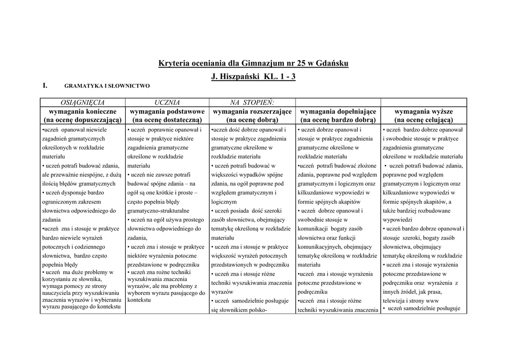Kryteria oceniania dla Gimnazjum nr 25 w Gdańsku J. Hiszpański KL. 1 - 3 I. GRAMATYKA I SŁOWNICTWO OSIĄGNIĘCIA wymagania konieczne (na ocenę dopuszczającą) UCZNIA wymagania podstawowe (na ocenę dostateczną) NA STOPIEŃ: wymagania rozszerzające (na ocenę dobrą) wymagania dopełniające (na ocenę bardzo dobrą) wymagania wyższe (na ocenę celującą) •uczeń opanował niewiele zagadnień gramatycznych określonych w rozkładzie materiału • uczeń potrafi budować zdania, ale przeważnie niespójne, z dużą ilością błędów gramatycznych • uczeń dysponuje bardzo ograniczonym zakresem słownictwa odpowiedniego do zadania •uczeń zna i stosuje w praktyce bardzo niewiele wyrażeń potocznych i codziennego słownictwa, bardzo często popełnia błędy • uczeń ma duże problemy w korzystaniu ze słownika, wymaga pomocy ze strony nauczyciela przy wyszukiwaniu znaczenia wyrazów i wybieraniu wyrazu pasującego do kontekstu • uczeń poprawnie opanował i stosuje w praktyce niektóre zagadnienia gramatyczne określone w rozkładzie materiału • uczeń nie zawsze potrafi budować spójne zdania – na ogół są one krótkie i proste – często popełnia błędy gramatyczno-strukturalne • uczeń na ogół używa prostego słownictwa odpowiedniego do zadania, • uczeń zna i stosuje w praktyce niektóre wyrażenia potoczne przedstawione w podręczniku • uczeń zna rożne techniki wyszukiwania znaczenia wyrazów, ale ma problemy z wyborem wyrazu pasującego do kontekstu •uczeń dość dobrze opanował i stosuje w praktyce zagadnienia gramatyczne określone w rozkładzie materiału • uczeń potrafi budować w większości wypadków spójne zdania, na ogół poprawne pod względem gramatycznym i logicznym • uczeń posiada dość szeroki zasób słownictwa, obejmujący tematykę określoną w rozkładzie materiału • uczeń zna i stosuje w praktyce większość wyrażeń potocznych przedstawionych w podręczniku • uczeń zna i stosuje różne techniki wyszukiwania znaczenia wyrazów • uczeń samodzielnie posługuje się słownikiem polsko- • uczeń dobrze opanował i stosuje w praktyce zagadnienia gramatyczne określone w rozkładzie materiału •uczeń potrafi budować złożone zdania, poprawne pod względem gramatycznym i logicznym oraz kilkuzdaniowe wypowiedzi w formie spójnych akapitów • uczeń dobrze opanował i swobodnie stosuje w komunikacji bogaty zasób słownictwa oraz funkcji komunikacyjnych, obejmujący tematykę określoną w rozkładzie materiału •uczeń zna i stosuje wyrażenia potoczne przedstawione w podręczniku •uczeń zna i stosuje różne techniki wyszukiwania znaczenia • uczeń bardzo dobrze opanował i swobodnie stosuje w praktyce zagadnienia gramatyczne określone w rozkładzie materiału • uczeń potrafi budować zdania, poprawne pod względem gramatycznym i logicznym oraz kilkuzdaniowe wypowiedzi w formie spójnych akapitów, a także bardziej rozbudowane wypowiedzi • uczeń bardzo dobrze opanował i stosuje szeroki, bogaty zasób słownictwa, obejmujący tematykę określoną w rozkładzie • uczeń zna i stosuje wyrażenia potoczne przedstawione w podręczniku oraz wyrażenia z innych źródeł, jak prasa, telewizja i strony www • uczeń samodzielnie posługuje hiszpańskiem i hiszpańskopolskim II. wyrazów • uczeń samodzielnie posługuje się różnego rodzaju słownikami językowymi się różnego rodzaju słownikami językowymi SŁUCHANIE OSIĄGNIĘCIA wymagania konieczne (na ocenę dopuszczającą) • rzadko potrafi zrozumieć ogólny sens różnorodnych tekstów i rozmów • potrafi zrozumieć kilka kluczowych informacji w różnorodnych tekstach i rozmowach • potrafi wydobyć niedużą część potrzebnych informacji, by stosownie do nich zareagować, np. dopasować różne elementy, uszeregować zdarzenia czy wypełnić tabelkę • potrafi czasami rozpoznać uczucia i reakcje mówiącego • potrafi rozróżnić niektóre dźwięki i głoski, ale rzadko rozpoznaje akcent wyrazowy • potrafi zrozumieć polecenia nauczyciela, ale z pomocą lub podpowiedziami UCZNIA wymagania podstawowe (na ocenę dostateczną) • potrafi czasami zrozumieć ogólny sens różnorodnych tekstów i rozmów • potrafi zrozumieć część kluczowych informacji w różnorodnych tekstach i rozmowach • potrafi wydobyć część potrzebnych informacji i stosownie do nich zareagować, np. dopasować różne elementy, uszeregować zdarzenia, czy wypełnić tabelkę • potrafi zazwyczaj rozpoznać uczucia i reakcje mówiącego • potrafi rozróżniać większość dźwięków i głosek, ale ma problemy z rozpoznaniem akcentu wyrazowego i zdaniowego • potrafi zazwyczaj zrozumieć polecenia nauczyciela NA STOPIEŃ: wymagania rozszerzające (na ocenę dobrą) • potrafi zazwyczaj zrozumieć ogólny sens różnorodnych tekstów i rozmów • potrafi zrozumieć większość kluczowych informacji w różnorodnych tekstach i rozmowach • potrafi wydobyć większość potrzebnych informacji i stosownie do nich zareagować, np. zrobić na ich podstawie krótką notatkę, uszeregować zdarzenia, czy wypełnić tabelkę • potrafi rozpoznać uczucia i reakcje mówiącego • potrafi rozróżniać dźwięki, głoski i akcent w większości wyrazów i zdań • potrafi zrozumieć polecenia nauczyciela wymagania dopełniające (na ocenę bardzo dobrą) wymagania wyższe (na ocenę celującą) • potrafi zrozumieć i wyodrębnić ogólny sens różnorodnych tekstów i rozmów opartych na materiale kursowym • potrafi zrozumieć kluczowe informacje w różnorodnych tekstach i rozmowach i wyłonić z nich błędy • potrafi wydobyć szczegółowe informacje i stosownie do nich zareagować, np. zrobić na ich podstawie notatkę, uszeregować zdarzenia, czy wypełnić tabelkę • potrafi z łatwością rozpoznać uczucia i reakcje mówiącego • potrafi streścić komunikat, używając języka hiszpańskiego i polskiego 