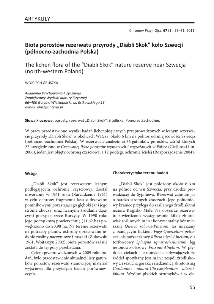 ARTYKUŁY Biota porostów rezerwatu przyrody „Diabli Skok”