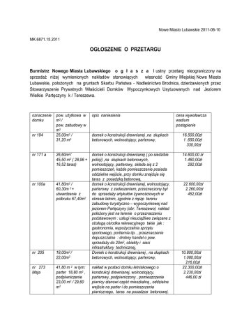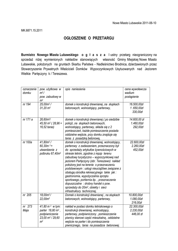 Nowe Miasto Lubawskie 2011-06-10 MK.6871.15.2011 OGŁOSZENIE O PRZETARGU Burmistrz Nowego Miasta Lubawskiego o g ł a s z a I ustny przetarg nieograniczony na sprzedaż niżej wymienionych nakładów stanowiących własność Gminy Miejskiej Nowe Miasto Lubawskie, położonych na gruntach Skarbu Państwa - Nadleśnictwo Brodnica, dzierżawionych przez Stowarzyszenie Prywatnych Właścicieli Domków Wypoczynkowych Usytuowanych nad Jeziorem Wielkie Partęczyny k / Tereszewa. oznaczenie domku nr 194 nr 171 a nr 100a nr 205 nr 273 Maja pow. użytkowa w m2 / pow. zabudowy w m2 25,00m2 / 31,20 m2 opis naniesienia domek o konstrukcji drewnianej ,na słupkach betonowych, wolnostojący, parterowy, 26,60m2/ domek o konstrukcji drewnianej ( po siedzibie 45,50 m2 ( 28,96 + policji) ,na słupkach betonowych, 16,52 taras) wolnostojący, parterowy, składa się z 2 pomieszczeń, każde pomieszczenie posiada oddzielne wejście, przy domku znajduje się taras z posadzką betonową, 2 41,80m / domek o konstrukcji drewnianej, wolnostojący, 60,30m 2 + parterowy z zadaszeniem, przeznaczony był utwardzenie z do sprzedaży artykułów żywnościowych w polbruku 67,40m2 okresie letnim, zgodnie z mpzp terenu zabudowy turystyczno – wypoczynkowej nad jeziorem Partęczyny (obr. Tereszewo) nakład położony jest na terenie o przeznaczeniu podstawowym : usługi nieuciążliwe związane z obsługą ośrodka rekreacyjnego takie jak : gastronomia, wypożyczalnia sprzętu sportowego, portiernia itp. , przeznaczenie dopuszczalne : drobny handel o pow. sprzedaży do 20m2, obiekty i sieci infrastruktury technicznej, 18,00m2 / Domek o konstrukcji drewnianej , na słupkach 22,00m2 betonowych, wolnostojący, parterowy, 41,80 m 2 w tym: parter 18,80 m2 , podpiwniczenie 23,00 m2 / 29,60 m2 nakład w postaci domku letniskowego o konstrukcji drewnianej, wolnostojący, parterowy, podpiwniczony , pomieszczenie piwnicy stanowi część mieszkalną , oddzielne wejście na parter i do pomieszczenia piwnicznego, taras na posadzce betonowej. cena wywoławcza wadium postąpienie 16.500,00zł 1 .650,00zł 330,00zł 14.600,00 zł 1.460,00zł 292,00zł 22.600,00zł 2.260,00zł 452,00zł 10.800,00zł 1.080,00zł 216,00zł 22.300,00zł 2.230,00zł 446,00 zł Przetarg na sprzedaż nakładów odbędzie się w dniu 30 czerwca 2011 r. o godzinie 1100 w sali nr 27 Urzędu Miejskiego w Nowym Mieście Lubawskim. 1.Wadium w pieniądzu stanowiące 10% ceny wywoławczej nakładów należy wpłacić do dnia 24 czerwca 2011 r. ( piątek) do kasy Urzędu Miejskiego w Nowym Mieście Lubawskim lub przelewem na rachunek bankowy Urzędu Miejskiego urządzony w PKO BP.SA. / O Nowe Miasto Lubawskie Nr 40 1020 3583 0000 3302 0011 3605 w terminie do dnia 25 czerwca 2011 r. 2. Postąpienie ustalono w wysokości 2% ceny wywoławczej . 3. Cenę osiągniętą w przetargu, po odliczeniu wadium wygrywający przetarg zobowiązany jest wpłacić najpóźniej w przeddzień zawarcia umowy notarialnej. Pozostałym uczestnikom przetargu wadium zostanie zwrócone w ciągu 3 dni po zakończeniu przetargu. 4. Uczestnik przetargu przed jego otwarciem winien przedłożyć dowód osobisty. 5.W przypadku nie przystąpienia Nabywcy nakładu bez usprawiedliwienia do zawarcia umowy notarialnej ( w miejscu i terminie podanym w zawiadomieniu) Burmistrz Nowego Miasta Lubawskiego może odstąpić od zawarcia umowy, a wpłacone wadium nie będzie podlegało zwrotowi. 6. Koszty zawarcia umowy notarialnej ponosi Nabywający. 7. Wydanie ruchomości nastąpi w dniu zawarcia umowy notarialnej. 8. Nakłady znajdują się na gruncie poddzierżawianym od Stowarzyszenia Prywatnych Właścicieli Domków Wypoczynkowych , w związku z powyższym nabywca nakładu zobowiązany będzie do zawarcia umowy poddzierżawy terenu oraz świadczenia opłat na rzecz dzierżawcy gruntu tj. Stowarzyszenia Prywatnych Właścicieli Domków Wypoczynkowych Usytuowanych Nad Jeziorem Wielkie Partęczyny k/ Tereszewa. Burmistrz Nowego Miasta Lubawskiego zastrzega sobie prawo odwołania przetargu, informując o przyczynie jego odwołania. Ogłoszenie o przetargu zamieszczone zostanie na stronie internetowej Urzędu Miejskiego pod adresem www.umnowemiasto.pl , na tablicy ogłoszeń Urzędu Miejskiego oraz w Gazecie Nowomiejskiej. MŁ/MŁ