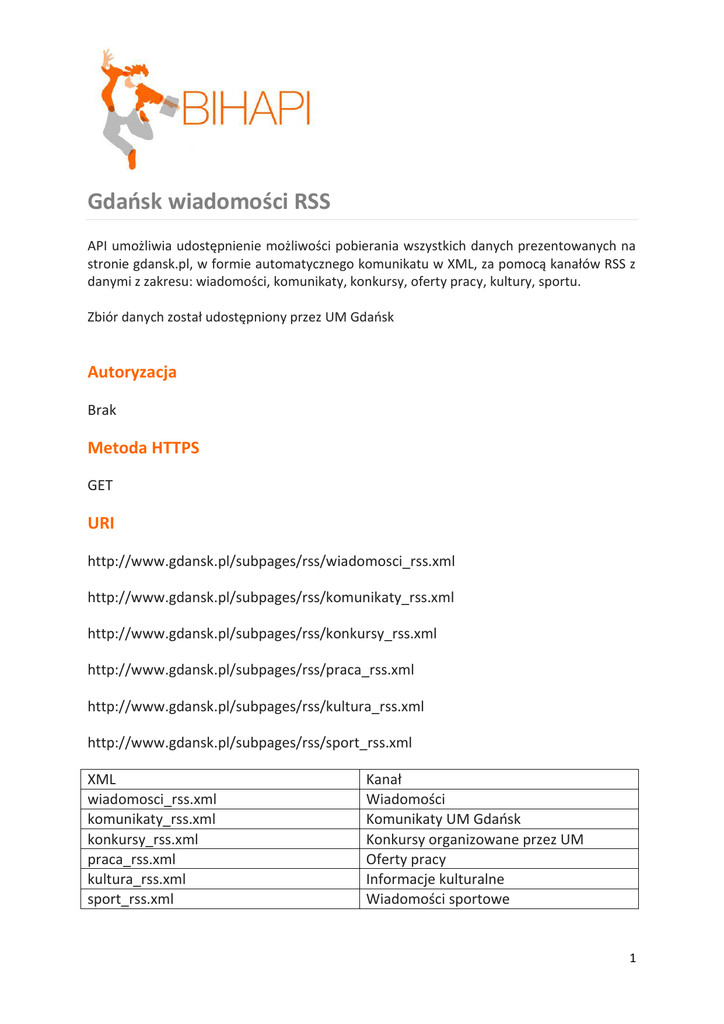 Gdańsk wiadomości RSS API umożliwia udostępnienie możliwości pobierania wszystkich danych prezentowanych na stronie gdansk.pl, w formie automatycznego komunikatu w XML, za pomocą kanałów RSS z danymi z zakresu: wiadomości, komunikaty, konkursy, oferty pracy, kultury, sportu. Zbiór danych został udostępniony przez UM Gdańsk Autoryzacja Brak Metoda HTTPS GET URI http://www.gdansk.pl/subpages/rss/wiadomosci_rss.xml http://www.gdansk.pl/subpages/rss/komunikaty_rss.xml http://www.gdansk.pl/subpages/rss/konkursy_rss.xml http://www.gdansk.pl/subpages/rss/praca_rss.xml http://www.gdansk.pl/subpages/rss/kultura_rss.xml http://www.gdansk.pl/subpages/rss/sport_rss.xml XML wiadomosci_rss.xml komunikaty_rss.xml konkursy_rss.xml praca_rss.xml kultura_rss.xml sport_rss.xml Kanał Wiadomości Komunikaty UM Gdańsk Konkursy organizowane przez UM Oferty pracy Informacje kulturalne Wiadomości sportowe 1 Parametry wywołania Brak Odpowiedź Struktura odpowiedzi jest zgodna ze standardem Really Simple Syndication (RSS 2.0): <?xml version="1.0" encoding="utf-8" ?> <rss version="2.0" xmlns:content="http://purl.org/rss/1.0/modules/content/" xmlns:wfw="http://wellformedweb.org/CommentAPI/" xmlns:dc="http://purl.org/dc/elements/1.1/" xmlns:atom="http://www.w3.org/2005/Atom" xmlns:sy="http://purl.org/rss/1.0/modules/syndication/" xmlns:slash="http://purl.org/rss/1.0/modules/slash/"> <channel> <title>tytuł kanału</title> <description>opis</description> <link>link</link> <item> …… zawartość kanału </item> </channel> </rss> Przykłady użycia Przykładowe wywołanie dla RSS wiadomości http://www.gdansk.pl/subpages/rss/wiadomosci_rss.xml 2