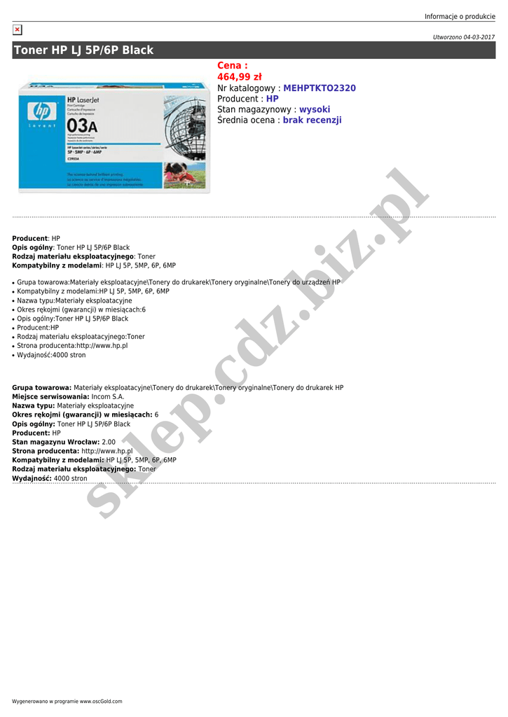 Informacje o produkcie Utworzono 04-03-2017 Toner HP LJ 5P/6P Black Cena : 464,99 zł iz .p l Nr katalogowy : MEHPTKTO2320 Producent : HP Stan magazynowy : wysoki Średnia ocena : brak recenzji Producent: HP Opis ogólny: Toner HP LJ 5P/6P Black Rodzaj materiału eksploatacyjnego: Toner Kompatybilny z modelami: HP LJ 5P, 5MP, 6P, 6MP ● ● ● ● ● ● .c ● Grupa towarowa:Materiały eksploatacyjne\Tonery do drukarek\Tonery oryginalne\Tonery do urządzeń HP Kompatybilny z modelami:HP LJ 5P, 5MP, 6P, 6MP Nazwa typu:Materiały eksploatacyjne Okres rękojmi (gwarancji) w miesiącach:6 Opis ogólny:Toner HP LJ 5P/6P Black Producent:HP Rodzaj materiału eksploatacyjnego:Toner Strona producenta:http://www.hp.pl Wydajność:4000 stron .b ● dz ● sk le p Grupa towarowa: Materiały eksploatacyjne\Tonery do drukarek\Tonery oryginalne\Tonery do drukarek HP Miejsce serwisowania: Incom S.A. Nazwa typu: Materiały eksploatacyjne Okres rękojmi (gwarancji) w miesiącach: 6 Opis ogólny: Toner HP LJ 5P/6P Black Producent: HP Stan magazynu Wrocław: 2.00 Strona producenta: http://www.hp.pl Kompatybilny z modelami: HP LJ 5P, 5MP, 6P, 6MP Rodzaj materiału eksploatacyjnego: Toner Wydajność: 4000 stron Wygenerowano w programie www.oscGold.com