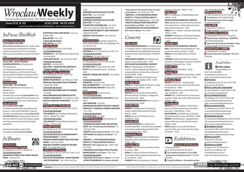 WrocławWeekly Free City Guide to Events, Music, Film, Theatre, Museum, Pubs & More Issue #132 & 133 22.02.2008 - 06.03.2008 > we are now online: www.WroclawWeekly.pl > [email protected] InFocus:ThisWeek Musica Polonica Nova 15.02.2008-22.02.2008 Musica Polonica Nova presents a wide-range of contemporary compositions by Polish artists in classical music. For more details: http://www.musicapolonicanova.pl/ (in Polish only) AudioEntropia003: Fermentation 26.02.2008 - 18:00 (Tuesday) GALERIA ENTROPIA (ul. Rzeźnicza 4) Free Admissions A fermenting installation & concert by Maciek Bączyk (a.k.a. DJ Pomnik) & Paweł Romańczuk (from Małe instrumenty). More info: http://www.entropia.art.pl/fermentacja/ intro.html Robotobibok 29.02.2008 - 18:30 (Friday) OPT (Ośrodek Postaw Twórczych / ul. Działkowa 15) Tickets: 20PLN An avant-jazz concert by Robotobibok. Its tunes evoke the sounds of of electric jazz in the 70’s and early electroacoustic experiments. Jazz nad Odrą 05.03.2008-09.03.2008 The 44th annual Wrocław jazz festival, also known as “Jazz on the Odra River” festival. This year’s special guests include Diana Krall, Brad Mehdau Trio and many others from all over the world. For more information, please visit: http://www.jnofestival.pl/ (in English and Polish) For the latest updates, please check our website: www.wroclawweekly.pl InTheatre Współczesny (Contemporary) Theatre (ul. Rzeźnicza 12, tel. 071/ 358-89-22) // 22.02.08-28.02.08 // Orkiestra TITANIC (The Titanic Orchestra) - Fri & Sat 19:15 Kartoteka (The Card Index) - Sun, Tue & Wed 19:00 Balladyna - Thu 19:15 // 29.02.08-06.03.08 // Balladyna - Fri 19:15 Polski Theatre (ul. Zapolskiej 3, tel. 071/ 316-07-80) // 22.02.08-28.02.08 // IFIGENIA Z A... (dir. Włodzimierz Staniewski) - Fri & Sat 20:30 Verklärte Nacht - Sat 19:00; Sun 18:00 // 29.02.08-06.03.08 // ELEKTRA - Fri & Sat 20:30 One (They - from Anton Chekhov’s “Three Sisters”) - Wed & Thu 19:00 Polski Theatre / Kameralna (ul. Świdnicka 28, tel. 071/ 316-07-52) // 22.02.08-28.02.08 // Śmierć podatnika - Sat 19:00; Sun 18:00 Okno na Parlament (Out of Order) - Wed & Thu 19:00 // 29.02.08-06.03.08 // Okno na Parlament (Out of Order) - Fri 19:00 Małe zbrodnie małżeńskie (Petits crimes conjugaux) - Sat 19:00; Sun 18:00 Mayday (Run for Your Wife!) - Tue-Thu 19:00 Polski Theatre / Świebodzki (pl.Orląt Lwowskich 20c,tel.071/341-29-54) // 22.02.08-28.02.08 // “Galapagos” by WrocŇāaw Pantomime Theatre - Wed & Thu 19:00 // 29.02.08-06.03.08 // “Galapagos” by WrocŇāaw Pantomime Theatre - Fri-Sun 19:00 Komedia Theatre (pl. Teatralny 4, tel. 071/ 316-07-78 thru -80) // 22.02.08-28.02.08 // Szalone Nożyczki (Scherenschnitt/ Shear Madness) - Fri 20:00 Rodzina Kerwoodów (Tom, Dick and Harry) - Sat & Sun 20:00 Unia bez tajemnic (A Rise in the Market) - Tue 20:00; Wed 17:00 Lalek (Puppet) Theatre (pl. Teatralny 4, tel. 071/ 344-76-77, 344-12-16) // 22.02.08-28.02.08 // Krzysztof Kolberger “Paper Theatre - Art of Reading” - Sat 11:00, 15:00; Sun 15:00 Zwierzęta Doktora Dolittle (Dr Dolittle) - Tue-Thu 10:00 // 29.02.08-06.03.08 // Zwierzęta Doktora Dolittle (Dr Dolittle) - Fri 10:00 Calineczka (Thumbelina) - Sat 12:00, 15:00; Sun 11:00; Tue 10:00; Wed 10:30 Piękna i Bestia (Beauty and the Beast) - Wed & Thu 10:00 Źródło (The Source) - Sat 19:00; Sun 17:00 Ad Spectatores (Chamber stage at the main railway station PKP, ul. Piłsudskiego 103, tel. 502-210-735) // 22.02.08-28.02.08 // Historia III - Fri 21:15; Sat & Sun 19:45, 21:15 // 29.02.08-06.03.08 // Historia III - Fri-Sun 19:45, 21:15 CAPITOL Musical Theatre (ul. Piłsudskiego 67, tel. 071/789-04-00) // 22.02.08-28.02.08 // My Fair Lady Fri & Sat 19:00; Sun 17:00 Spot! Teatr Zakład Krawiecki - Sat & Sun 20:00 Mdłość, Mniezłość, Miłość - Tue & Wed 20:00 // 29.02.08-06.03.08 // Operetka - Fri & Sat 19:00 Mała Księżniczka - Tue & Wed 10:30 rzecze Budda Chinaski - Wed & Thu 20:00 ARKA Theatre (ul. Mennicza 3) // 22.02.08-28.02.08 // Dziady (Forefathers’ Eve) Part II - Mon 10:00 Jak powietrze - Tue 9:00 Czarodziejski świat (Tales by Charles Perrault) / A Musical (French Version) - Thu 11:00 // 29.02.08-06.03.08 // Jak powietrze - Fri 10:00 OPERA Wrocławska (ul.Świdnicka 35) // 22.02.08-28.02.08 // “Dziadek do orzechów (The Nutcracker)” by P. Tchaikovsky [CD Playback] - Fri 11:00; Sat 19:00 “Hagith” by Karol Szymanowski - Sun 17:00 “Antygona” by Zbigniew Rudziński - Tue 11:00 “Rękopis [...] (The Saragossa Manuscript)” & “Figle szatana (Devil’s Frolics)” by R. Augustyn, etc. - Wed 11:00; Thu 19:00 “Czerwony Kapturek (The Little Red Riding Hood)” by Jiří Pauer - Thu 11:00 // 29.02.08-06.03.08 // “Cosi fan tutte” by W. A. Mozart - Fri 19:00 “Jutro (Tomorrow)” by Tadeusz Baird & Contact: Wrocław Tourist Information Center, Rynek 14, 50-101 Wrocław, tel. (+48 71) 344 31 11 “Kolonia karna (The Penal Colony)” by Joanna Bruzdowicz - Sat 19:00; Sun 17:00 “Rękopis [...] (The Saragossa Manuscript)” & “Figle szatana (Devil’s Frolics)” by R. Augustyn, etc. - Tue 11:00 “Wolny strzelec (Der Freischütz)” by Carl Maria von Weber - Wed 19:00 “Czarodziejski flet (Die Zauberflöte)” by W.A. Mozart - Thu 19:00 Concerts Friday 22nd ORATORIUM MARIANUM (pl. Uniwersytecki 1) Chamber Concert - Natanson/Zalech/Szymański/Błońska/Przybylski/Wojciechowski (Musica Polonica Nova/Classical: 15/10PLN) - 17:00 OPERA WROCŁAWSKA (ul. Świdnicka 35) Opera Concert (Opera/Aria) - 19:00 WROCŁAW PHILHARMONIC CONCERT HALL (ul. Piłsudskiego 19) Symphonic Concert - Bukowski/Augustyn/Meyer/Lutosławski (Musica Polonica Nova/Classical: 60/40/25PLN) - 20:00 ŁYKEND (ul. Podwale 37/38) Spaceman + St.City Surfers (Rockabilly: 5PLN) - 20:00 Saturday 23rd FIRLEJ (ul. Grabiszyńska 56) Roszja i Lu (HipHop/Electronica: 20PLN) - 20:00 Sunday 24th RATUSZ (Rynek) Jarosław Thiel (cello) & Wrocław Baroque Orchestra - Wagenseil/ Monn (Classical) - 18:00 ORATORIUM MARI