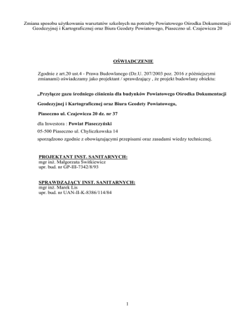 Zmiana sposobu uŜytkowania warsztatów szkolnych na potrzeby Powiatowego Ośrodka Dokumentacji Geodezyjnej i Kartograficznej oraz Biura Geodety Powiatowego, Piaseczno ul. Czajewicza 20 OŚWIADCZENIE Zgodnie z art.20 ust.4 - Prawa Budowlanego (Dz.U. 207/2003 poz. 2016 z późniejszymi zmianami) oświadczamy jako projektant / sprawdzający , Ŝe projekt budowlany obiektu: „Przyłącze gazu średniego ciśnienia dla budynków Powiatowego Ośrodka Dokumentacji Geodezyjnej i Kartograficznej oraz Biura Geodety Powiatowego, Piaseczno ul. Czajewicza 20 dz. nr 37 dla Inwestora : Powiat Piaseczyński 05-500 Piaseczno ul. Chyliczkowska 14 sporządzono zgodnie z obowiązującymi przepisami oraz zasadami wiedzy technicznej. PROJEKTANT INST. SANITARNYCH: mgr inŜ. Małgorzata Świtkiewicz upr. bud. nr GP-III-7342/8/93 SPRAWDZAJĄCY INST. SANITARNYCH: mgr inŜ. Marek Lis upr. bud. nr UAN-II-K-8386/114/84 1 Zmiana sposobu uŜytkowania warsztatów szkolnych na potrzeby Powiatowego Ośrodka Dokumentacji Geodezyjnej i Kartograficznej oraz Biura Geodety Powiatowego, Piaseczno ul. Czajewicza 20 SPIS TREŚCI PROJEKTU WYKONAWCZEGO przyłącze gazu średniego ciśnienia dla budynków Powiatowego Ośrodka Dokumentacji Geodezyjnej i Kartograficznej oraz Biura Geodety Powiatowego, Piaseczno ul. Czajewicza 20 dz. nr 37 Projekt zawiera : I. OPIS TECHNICZNY 1. Przedmiot i zakres opracowania 2. Podstawa opracowania 3. Charakterystyka kotłowni 4. Wytyczne lokalizacji przyłącza gazowego 5. Roboty ziemne 6. Roboty montaŜowe 7. Próby gazociągu II. RYSUNKI 1. Sytuacja 2. Przyłącze gazu – profil podłuŜny 3. Wypełnienie wykopu i zagęszczenie gruntu 4. Rura ochronna 2 rys. nr 1 rys. nr 2 rys. nr 3 rys. nr 4 Zmiana sposobu uŜytkowania warsztatów szkolnych na potrzeby Powiatowego Ośrodka Dokumentacji Geodezyjnej i Kartograficznej oraz Biura Geodety Powiatowego, Piaseczno ul. Czajewicza 20 I. OPIS TECHNICZNY 1. Przedmiot i zakres opracowania Przedmiotem opracowania jest projekt przyłącza gazu średniego ciśnienia dla budynków Powiatowego Ośrodka Dokumentacji Geodezyjnej i Kartograficznej oraz Biura Geodety Powiatowego, Piaseczno ul. Czajewicza 20 dz. nr 37. Zakres opracowania obejmuje przyłącze gazu dla kotłowni gazowej, bazując na sieci gazowej średniego ciśnienia φ80 stal, zlokalizowanej w ul. Czajewicza.. Kurek główny w punkcie redukcyjno-pomiarowym stanowi granicę eksploatacji. Zapotrzebowanie gazu dla kotłowni wynosi Q = 8,6 m3/h. 2. Podstawa opracowania Projekt opracowano w oparciu o: a) umowa z Inwestorem, Gminą Piaseczno nr 2/07 INW b) wypis i wyrys nr UiA 7328/M/634/06 z 29.11.2006 wydane przez UMiG w Piasecznie c) umowa nr 1004/2004 o zaopatrzenie budynków w wodę i odprowadzenie ścieków d) warunki techniczne przyłączenia budynków do sieci gazowej wydane przez MSG Warszawa-Oddział Gazownia Warszawska-Warszawa ul. Kruczkowskiego 2 e) projekt budowlany architektoniczno-konstrukcyjny remontowanych budynków f) inwentaryzacja do celów projektowych istniejących budynków g) warunki techniczne wykonania i odbioru rurociągów z tworzyw sztucznych. SGGiK W-wa h) aktualne katalogi branŜowe 3. Charakterystyka kotłowni Kotłownia gazowa zlokalizowana jest w podpiwniczeniu istniejącej części budynku Powiatowego Ośrodka Dokumentacji Geodezyjnej i Kartograficznej oraz Biura Geodety Powiatowego, Piaseczno ul. Czajewicza 20 dz. nr 37. Dla pokrycia potrzeb cieplnych centralnego ogrzewania zaprojektowano 1 kocioł stalowy, kondensacyjny, wodny typ GAS C 210-85 ECO z konsolą typ Diematic 3, o wydajności 86 kW f-my DE DIETRICH, opalany gazem ziemnym GZ 50. Kocioł wyposaŜony w palnik gazowy f-my DE DIETRICH, modulacyjny, sterowany sterownikiem, przeznaczonym do sterowania palników modulacyjnych w funkcji temperatury zewnętrznej, oraz przeznaczonymi do sterowania obiegów grzewczych z zaworami mieszającymi. *znamionowa moc cieplna– 86 kW *natęŜenie przepływu gazu - 8,60 m3/h 4. Wytyczne lokalizacji przyłącza gazowego Zgodnie z Rozporządzeniem Ministra Gospodarki, Dz. U. z 2001 r. nr 97, poz. 1055 w sprawie „Warunków technicznych, jakim powinny odpowiadać sieci gazowe” projektowane przyłącze gazowe średniego ciśnienia znajduje się na terenie naleŜącym do pierwszej klasy lokalizacji. Dla tego przyłącza gazowego wyznacza się strefę kontrolowaną, której linia środkowa pokrywa się z osią przewodu gazowego. Szerokość tej strefy wynosi 1,0m. W strefie kontrolowanej nie naleŜy wznosić budynków, urządzać stałych składów i magazynów, sadzić drzew oraz nie powinna być podejmowana Ŝadna działalność mogąca zagrozić trwałości gazociągu podczas jego eksploatacji. 3 Zmiana sposobu uŜytkowania warsztatów szkolnych na potrzeby Powiatowego Ośrodka Dokumentacji Geodezyjnej i Kartograficznej oraz Biura Geodety Powiatowego, Piaseczno ul. Czajewicza 20 5. Roboty ziemne Wykop pod przyłącze gazowe wykonać o głębokości ok.1,00 m w stosunku do istniejącej rzędnej, oczyścić z korzeni, kamieni i innych twardych przedmiotów oraz wykonać podsypkę o grubości 5 cm z piasku. Przejście przyłącza pod ul. Czajewicza wykonać metodą bezwykopową. Po zmontowaniu gazociągu wykonać równieŜ z piasku obsypkę i nadsypkę grubości 10 cm, a dalej wykop zasypać gruntem rodzimym, ubijając warstwami. Minimalne przykrycie gazociągu powinno wynosić 80 cm. 5 cm nad przewodem gazowym naleŜy ułoŜyć miedziany drut sygnalizacyjny (umoŜliwia on elektroniczne wykrywanie przebiegu trasy gazociągu). Drut identyfikacyjny powinien być łączony przez lutowanie, a złącza zaizolowane. Natomiast 40 cm nad przewodem gazowym naleŜy ułoŜyć taśmę ostrzegawczą Ŝółtą, z folii PVC o szerokości 20 cm. Przy zagęszczaniu gruntu naleŜy zwrócić szczególną uwagę na właściwe zagęszczenie np. w rejonach odgałęzień. 6. Roboty montaŜowe Przyłącze gazowe powinno być wytyczone przez uprawnionego geodetę, a po wybudowaniu zinwentaryzowane. Gazoc