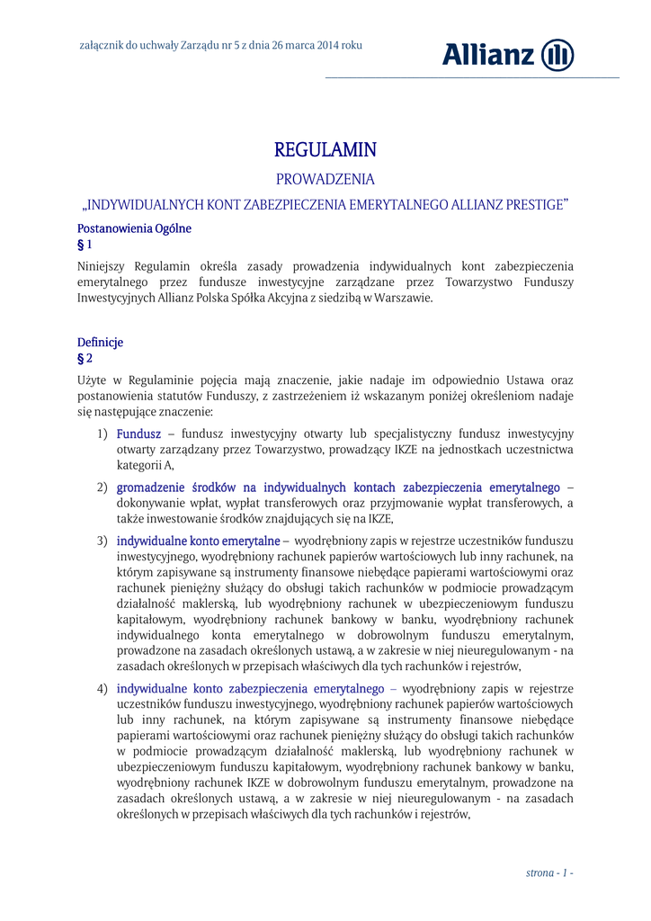 załącznik do uchwały Zarządu nr 5 z dnia 26 marca 2014 roku _______________________________________________ REGULAMIN PROWADZENIA „INDYWIDUALNYCH KONT ZABEZPIECZENIA EMERYTALNEGO ALLIANZ PRESTIGE” Postanowienia Ogólne §1 Niniejszy Regulamin określa zasady prowadzenia indywidualnych kont zabezpieczenia emerytalnego przez fundusze inwestycyjne zarządzane przez Towarzystwo Funduszy Inwestycyjnych Allianz Polska Spółka Akcyjna z siedzibą w Warszawie. Definicje §2 Użyte w Regulaminie pojęcia mają znaczenie, jakie nadaje im odpowiednio Ustawa oraz postanowienia statutów Funduszy, z zastrzeżeniem iż wskazanym poniżej określeniom nadaje się następujące znaczenie: 1) Fundusz – fundusz inwestycyjny otwarty lub specjalistyczny fundusz inwestycyjny otwarty zarządzany przez Towarzystwo, prowadzący IKZE na jednostkach uczestnictwa kategorii A, 2) gromadzenie środków na indywidualnych emerytalnego ego – indywidualnych kontach zabezpieczenia emerytaln dokonywanie wpłat, wypłat transferowych oraz przyjmowanie wypłat transferowych, a także inwestowanie środków znajdujących się na IKZE, 3) indywidualne konto emerytalne – wyodrębniony zapis w rejestrze uczestników funduszu inwestycyjnego, wyodrębniony rachunek papierów wartościowych lub inny rachunek, na którym zapisywane są instrumenty finansowe niebędące papierami wartościowymi oraz rachunek pieniężny służący do obsługi takich rachunków w podmiocie prowadzącym działalność maklerską, lub wyodrębniony rachunek w ubezpieczeniowym funduszu kapitałowym, wyodrębniony rachunek bankowy w banku, wyodrębniony rachunek indywidualnego konta emerytalnego w dobrowolnym funduszu emerytalnym, prowadzone na zasadach określonych ustawą, a w zakresie w niej nieuregulowanym - na zasadach określonych w przepisach właściwych dla tych rachunków i rejestrów, 4) indywidualne konto zabezpieczenia emerytalnego – wyodrębniony zapis w rejestrze uczestników funduszu inwestycyjnego, wyodrębniony rachunek papierów wartościowych lub inny rachunek, na którym zapisywane są instrumenty finansowe niebędące papierami wartościowymi oraz rachunek pieniężny służący do obsługi takich rachunków w podmiocie prowadzącym działalność maklerską, lub wyodrębniony rachunek w ubezpieczeniowym funduszu kapitałowym, wyodrębniony rachunek bankowy w banku, wyodrębniony rachunek IKZE w dobrowolnym funduszu emerytalnym, prowadzone na zasadach określonych ustawą, a w zakresie w niej nieuregulowanym - na zasadach określonych w przepisach właściwych dla tych rachunków i rejestrów, strona - 1 - załącznik do uchwały Zarządu nr 5 z dnia 26 marca 2014 roku _______________________________________________ 5) IKZE – indywidualne konto zabezpieczenia emerytalnego, tj. wyodrębniony zapis w rejestrze uczestników Funduszu, prowadzone przez Fundusz dla Oszczędzającego na zasadach określonych w Ustawie oraz Regulaminie, 6) instytucja finansowa – fundusz inwestycyjny, podmiot prowadzący działalność maklerską, zakład ubezpieczeń, bank, dobrowolny fundusz emerytalny, prowadzące indywidualne konta emerytalne lub indywidualne konta zabezpieczenia emerytalnego zgodnie z Ustawą, 7) konwersja – jednoczesne odkupienie jednostek uczestnictwa w Subfunduszu wydzielonym w ramach jednego Funduszu i nabycie jednostek uczestnictwa w innym Subfunduszu wydzielonym w ramach innego Funduszu zarządzanego przez Towarzystwo za środki pieniężne uzyskane z odkupienia jednostek uczestnictwa, pod warunkiem że jednostki odkupywane jak i nabywane są rejestrowane na IKZE Oszczędzającego, 8) osoby uprawnione – osoby wskazane przez Oszczędzającego, które otrzymają środki z IKZE w razie jego śmierci, a w wypadku braku wskazania - spadkobiercy Oszczędzającego, 9) Oszczędzający – osoba fizyczna, która gromadzi środki na IKZE, 10) Regulamin – niniejszy regulamin prowadzenia IKZE, 11) Subfundusz – nieposiadająca osobowości prawnej, wydzielona organizacyjnie część Funduszu, 12) Towarzystwo – Towarzystwo Funduszy Inwestycyjnych Allianz Polska Spółka Akcyjna z siedzibą w Warszawie, 13) Umowa – umowa o prowadzenie IKZE zawierana pomiędzy osobą zamierzającą gromadzić oszczędności na IKZE (Oszczędzającym) a Funduszem, 14) Ustawa – ustawa z dnia 20 kwietnia 2004 roku o indywidualnych kontach emerytalnych oraz indywidualnych kontach zabezpieczenia emerytalnego (DzU nr 116 poz. 1205 ze zm.), 15) wpłata – wpłata środków pieniężnych dokonywana przez Oszczędzającego na IKZE, 16) wypłata – wypłata jednorazowa albo wypłata w ratach środków zgromadzonych na IKZE dokonywana na rzecz Oszczędzającego, po spełnieniu warunków określonych w Regulaminie i przepisach Ustawy albo na rzecz osób uprawnionych, w razie śmierci Oszczędzającego, 17) wypłata transferowa na IKZ IKZE – przeniesienie środków na IKZE z innego indywidualnego konta emerytalnego lub indywidualnego konta zabezpieczenia emerytalnego prowadzonego dla Oszczędzającego przez inny Fundusz lub inną instytucję finansową lub z indywidualnego konta zabezpieczenia emerytalnego osoby zmarłej w przypadku Oszczędzającego będącego osobą uprawnioną w rozumieniu Ustawy, na zasadach określonych w § 6 Regulaminu, 18) wypłata transferowa z IKZ IKZE – przeniesienie środków z IKZE na inne indywidualne konto zabezpieczenia emerytalnego prowadzone dla Oszczędzającego przez inny Fundusz lub inną instytucję finansową albo na indywidualne konto zabezpieczenia emerytalnego strona - 2 - załącznik do uchwały Zarządu nr 5 z dnia 26 marca 2014 roku _______________________________________________ osoby uprawnionej w przypadku śmierci Oszczędzającego, na zasadach określonych w § 14 Regulaminu, 19) zamiana – jednoczesne odkupienie jednostek uczestnictwa w jednym Subfunduszu i nabycie jednostek uczestnictwa w innym Subfunduszu wydzielonym w ramach tego samego Funduszu za środki pieniężne uzyskane z od