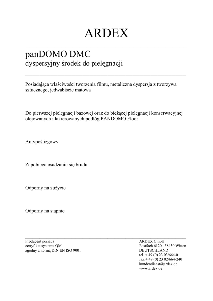 ARDEX _____________________________________________ panDOMO DMC dyspersyjny środek do pielęgnacji _____________________________________________ Posiadająca właściwości tworzenia filmu, metaliczna dyspersja z tworzywa sztucznego, jedwabiście matowa Do pierwszej pielęgnacji bazowej oraz do bieżącej pielęgnacji konserwacyjnej olejowanych i lakierowanych podłóg PANDOMO Floor Antypoślizgowy Zapobiega osadzaniu się brudu Odporny na zużycie Odporny na stąpnie _____________________________________________ Producent posiada certyfikat systemu QM zgodny z normą DIN EN ISO 9001 ARDEX GmbH Postfach 6120 . 58430 Witten DEUTSCHLAND tel. + 49 (0) 23 03/664-0 fax:+ 49 (0) 23 02/664-240 [email protected] www.ardex.de panDOMO DMC dyspersyjny środek do pielęgnacji _____________________________________________ Zakres zastosowania: Do wnętrz. PANDOMO DMC dyspersyjny środek do pielęgnacji stanowi film ochronny na podłogach PANDOMO Floor olejowanych z zastosowaniem PANDOMO SL STEINÖL. Właściwości: – antypoślizgowy – odporny na krótkotrwałe działanie płynów – odporny na stąpanie – jedwabiście matowy PANDOMO DMC dyspersyjny środek do pielęgnacji zapobiega osadzaniu się brudu i tworzy na pielęgnowanych podłogach równomierną jedwabiście matową powierzchnię. Zastosowanie: Przed zastosowaniem należy mocno wstrząsnąć pojemnik. Użycie środka powinno odbywać się zawsze na sposób świeże na świeże. Należy unikać tworzenia się warstw. Środek osiąga pełnię właściwości dopiero po stwardnieniu oleju i pielęgnacji bazowej po około 5–7 dniach (w zależności od warunków klimatycznych). Czyszczenie konserwacyjne: Do regularnego czyszczenia konserwacyjnego należy stosować PANDOMO WP pielęgnujący środek do wycierania. Najpierw oczyścić z brudu i piasku miotłą lub szczotką odkurzacza, ponieważ mogą oddziaływać jak papier ścierny. Następnie, zależnie od potrzeb, wlać do 10 l czystej wody 50 ml PANDOMO WP pielęgnującego środka do wycierania i oczyścić powierzchnię wyżętą, wilgotną ścierką do podłogi. Gruntowne czyszczenie: W przypadku uporczywych zabrudzeniach powierzchni podłóg, które nie dają się usunąć podczas regularnej pielęgnacji, zaleca się gruntowne czyszczenie. Można tu zastosować PANDOMO BC środek do gruntownego czyszczenia. Informacja o zastosowaniu, patrz dane techniczne. Informacje ogólne: Pierwsza pielęgnacja bazowa: Pierwszą pielęgnację bazową należy wykonać nie rozcieńczonym środkiem nakładając 2 warstwy, z zastosowaniem myjki z jagnięcej skóry (baranka) świeże na świeże, najwcześniej na 12 godzin od ostatniego olejowania środkiem PANDOMO SL, przy zachowaniu odpowiednich warunków schnięcia (wystarczająca wentylacja, odpowiednia temperatura). Nigdy nie dopuszczać do zalewania podłogi preparatem podczas czyszczenia. Pielęgnować zawsze lekko zwilżając! Należy przestrzegać wytycznych dot. zastosowania (zawartych na opakowaniu) PANDOMO SL. Pomiędzy nałożeniem pierwszej i drugiej warstwy, zależnie od warunków schnięcia, należy uwzględnić czas oczekiwania co najmniej około 60 minut, przy temperaturze w pomieszczeniu około +20°C oraz około 60% wilgotności powietrza. Ważne informacje: Nie mieszać PANDOMO DMC dyspersyjnego środka do pielęgnacji z innymi środkami do pielęgnacji i czyszczenia i nie stosować do regularnego czyszczenia konserwacyjnego. Nie wchodzić i nie przecierać powierzchni, na której został zastosowany PANDOMO dyspersyjny środek do pielęgnacji - tak długo, jak długo widoczny film błyszczy od wilgoci. Narzędzia należy wyczyścić wodą natychmiast po zastosowaniu. Po nałożeniu pierwszej warstwy, na powierzchniach ciemnych podłóg PANDOMO Floor, mogą pojawić się delikatne zmatowienia. Po nałożeniu kolejnej warstwy zmatowienia znikają. Im bardziej chroniona będzie powierzchnia, w pierwszych dniach od zastosowania środka do pielęgnacji na podłodze, tym dłuższa jest jej żywotność! W przypadku zastosowaniu środka do gruntownego czyszczenia PANDOMO BC musi zostać zachowany odpowiedni czas schnięcia. Warstwa szpachli, przed zastosowaniem nowej warstwy środka do pielęgnacji PANDOMO SL oraz PANDOMO DMC, musi być całkowicie sucha. Po gruntownym czyszczeniu należy nałożyć co najmniej dwie warstwy PANDOMO DMC. Podczas stosowania preparatu temperatura powietrza i podłogi powinna wynosić co najmniej 15C°. Uwaga: W przypadku kontaktu preparatu z oczami: dokładnie przemyć wodą także pod powiekami. W przypadku kontaktu ze skórą: na wszelki wypadek przemyć wodą z mydłem. W przypadku połknięcia: wypłukać usta wodą i popić dużą ilością wody. Jeśli to możliwe, nie dopuszczać do wymiotów. Jeśli to konieczne, skonsultować z lekarzem. Warunki, których należy unikać: nie wystawiać na działanie temperatury powyżej +35°C. Dane techniczne zgodne z normą jakości ARDEX: ____________________________________________ Ciężar właściwy około 1,0 kg / l Wartość pH: około 8,5 Zużycie materiału około 25 g/m² jednowarstwowo, odpowiada około 50g/m² w przypadku zalecanego zastosowania dwuwarstwowego Wskazówki w zakresie ochrony ppoż. i przeciwwybuchowej: brak specjalnych wymagań dot. środków ochrony przeciwpożarowej. Oznaczenie według GefStoffV (Rozporządzenia w sprawie materiałów niebezpiecznych) nie ma Opakowanie: kanistry po 3 l Przechowywanie: w suchych pomieszczeniach, chroniąc przed mrozem, szczelnie zamknięte około 12 miesięcy Kod produktu w zakresie sprzątania budynków GG10 Uszkodzone opakowanie dokładnie zamknąć, preparat szybko zużyć. ______________________________________ Gwarantujemy wysoką jakość naszych produktów. Nasze zalecenia dotyczące zastosowania opierają się na badaniach i praktycznym doświadczeniu, mogą być jednak tylko ogólnymi wskazówkami na temat zastosowania, ponieważ nie mamy żadnego wpływu na warunki panujące na budowie i spo
