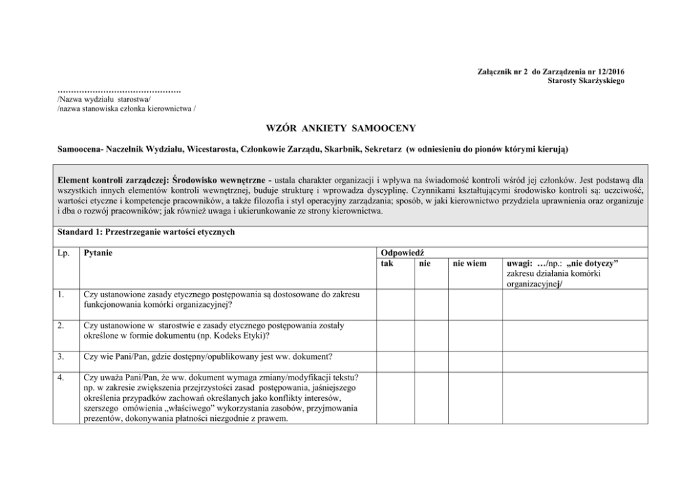 Załącznik nr 2 do Zarządzenia nr 12/2016 Starosty Skarżyskiego ………………………………………. /Nazwa wydziału starostwa/ /nazwa stanowiska członka kierownictwa / WZÓR ANKIETY SAMOOCENY Samoocena- Naczelnik Wydziału, Wicestarosta, Członkowie Zarządu, Skarbnik, Sekretarz (w odniesieniu do pionów którymi kierują) Element kontroli zarządczej: Środowisko wewnętrzne - ustala charakter organizacji i wpływa na świadomość kontroli wśród jej członków. Jest podstawą dla wszystkich innych elementów kontroli wewnętrznej, buduje strukturę i wprowadza dyscyplinę. Czynnikami kształtującymi środowisko kontroli są: uczciwość, wartości etyczne i kompetencje pracowników, a także filozofia i styl operacyjny zarządzania; sposób, w jaki kierownictwo przydziela uprawnienia oraz organizuje i dba o rozwój pracowników; jak również uwaga i ukierunkowanie ze strony kierownictwa. Standard 1: Przestrzeganie wartości etycznych Lp. Pytanie 1. Czy ustanowione zasady etycznego postępowania są dostosowane do zakresu funkcjonowania komórki organizacyjnej? 2. Czy ustanowione w starostwie e zasady etycznego postępowania zostały określone w formie dokumentu (np. Kodeks Etyki)? 3. Czy wie Pani/Pan, gdzie dostępny/opublikowany jest ww. dokument? 4. Czy uważa Pani/Pan, że ww. dokument wymaga zmiany/modyfikacji tekstu? np. w zakresie zwiększenia przejrzystości zasad postępowania, jaśniejszego określenia przypadków zachowań określanych jako konflikty interesów, szerszego omówienia „właściwego” wykorzystania zasobów, przyjmowania prezentów, dokonywania płatności niezgodnie z prawem. Odpowiedź tak nie nie wiem uwagi: …/np.: „nie dotyczy” zakresu działania komórki organizacyjnej/ 5. 6. Czy wprowadzenie ww. dokumentu przyczynia się do poprawy jakości pracy starostwa? Czy w kierowanej przez Panią/Pana komórce organizacyjnej wprowadzono tryb zgłaszania i reagowania w przypadku sygnałów o zaistnieniu nieprawidłowości oraz naruszeniu zasad etycznego postępowania? 7. Czy w kierowanej przez Panią/Pana komórce organizacyjnej wystąpił przypadek postawienia któremuś pracownikowi zarzutu działania niezgodnego z zasadami etycznego postępowania? 8. Jak ocenia Pani/Pan przestrzeganie przez pracowników komórki organizacyjnej zasad etycznego postępowania określonych w formie dokumentu (np. w Kodeksie Etyki): Praworządność 8./1 8./2 Uprzejmość i życzliwość w kontaktach z klientami 8./4 Uczciwość ,Odpowiedzialność 8./5 Godne zachowanie w miejscu pracy i poza nim 9. 9./1 źle Profesjonalizm 8./3 8./6 bardzo źle Bezstronność Jakie zdaniem Pani/Pana zasady (standardy) postępowania pracowników komórki organizacyjnej podczas wypełniania przez nich obowiązków służbowych wymagają doskonalenia / poprawy? Praworządność 9./2 Uczciwość, Odpowiedzialność 9./3 Profesjonalizm proszę zaznaczyć dobrze bardzo dobrze trudno powiedzieć 9./4 Dbałość o dobre imię starostwa i pracowników w niej zatrudnionych 9./5 Godne zachowanie w miejscu pracy i poza nim 9./6 Uprzejmość i życzliwość w kontaktach z klientami 9./7 Bezstronność 9.8. Inne ( jakie?) 10. Czy dokument określający zasady etycznego postępowania (Kodeks Etyki) jest dokumentem, z którego w różnych sytuacjach zawodowych Pani/Pan korzysta? często 11. Czy treści zawarte w dokumencie określającym zasady etycznego postępowania (Kodeksie Etyki) pogłębiły refleksję nad własnym postępowaniem w pracy? tak nie raczej często raczej rzadko trudno powiedzieć uwagi Standard 2: Kompetencje zawodowe tak 13. 14. 15. 16. Czy wszystkie podległe Pani/Panu stanowiska pracy mają określone pisemnie wymagania dotyczące zakresu wiedzy, umiejętności i doświadczenia niezbędne do ich zajmowania? Czy przegląda i aktualizuje Pani/Pan niezbędne wymagania z zakresu wiedzy, umiejętności i doświadczenia dla poszczególnych stanowisk pracy poprzez system okresowych ocen pracowników? Czy okresowo formułuje Pani /Pan zalecenia stanowiące podstawę planowania szkoleń? Czy umożliwiono Pani/Panu każdorazowo udział w procesie rekrutacji pracowników na wakaty w kierowanej przez Panią/Pana komórce organizacyjnej ? nie nie wiem uwagi rzadko trudno powiedzieć 17. Czy przebieg i wynik rekrutacji jest każdorazowo upubliczniany? Czy umożliwiono Pani/Panu rozwój kompetencji zawodowych (np. udział w konferencjach, szkoleniach)? Standard 3: Struktura organizacyjna 18. Czy struktura organizacyjna w komórce organizacyjnej jest dostosowana do jej aktualnych celów i zadań? 20. Czy kierowana przez Panią / Pana komórka organizacyjna wykonuje wyłącznie zadania wskazane w statucie lub regulaminie organizacyjnym? 21. Czy okresowo ocenia Pani/Pan strukturę organizacyjną pod kątem możliwości usprawnienia organizacji pracy? 22. Czy zdaniem Pani/Pana występuje sytuacja nieuzasadnionego nakładania się uprawnień i odpowiedzialności pomiędzy komórkami organizacyjnymi/stanowiskami pracy w starostwie? 23. Czy podlegli Pani/Panu pracownicy komórki organizacyjnej mają przypisany formalnie, aktualny zakres uprawnień, obowiązków i odpowiedzialności ? w jakiej formie? 24. Czy podlegli Pani/Panu pracownicy każdorazowo są informowani o zmianach w strukturze organizacyjnej? Standard 4: Delegowanie uprawnień 19. 25. 26. 27. 28. Czy posiada Pani/Pan potwierdzony pisemnie, precyzyjnie określony zakres uprawnień i obowiązków? ( nie dotyczy członków zarządu) Czy zakres nadanych Pani/Panu uprawnień umożliwia skuteczną realizacją zadań? Czy podlegli Pani/Panu pracownicy posiadają wystarczające uprawnienia do wykonywania działań i podejmowania decyzji o charakterze bieżącym? Czy w stosunku do podległych Pani/Panu pracowników wystąpiła konieczność cofnięcia uprawnień w związku z nienależytym ich wykorzystywaniem lub wykonywaniem? Element kontroli zarządczej: Cele i zarządzanie ryzykiem - jasne określenie misji może sprzyjać ustale