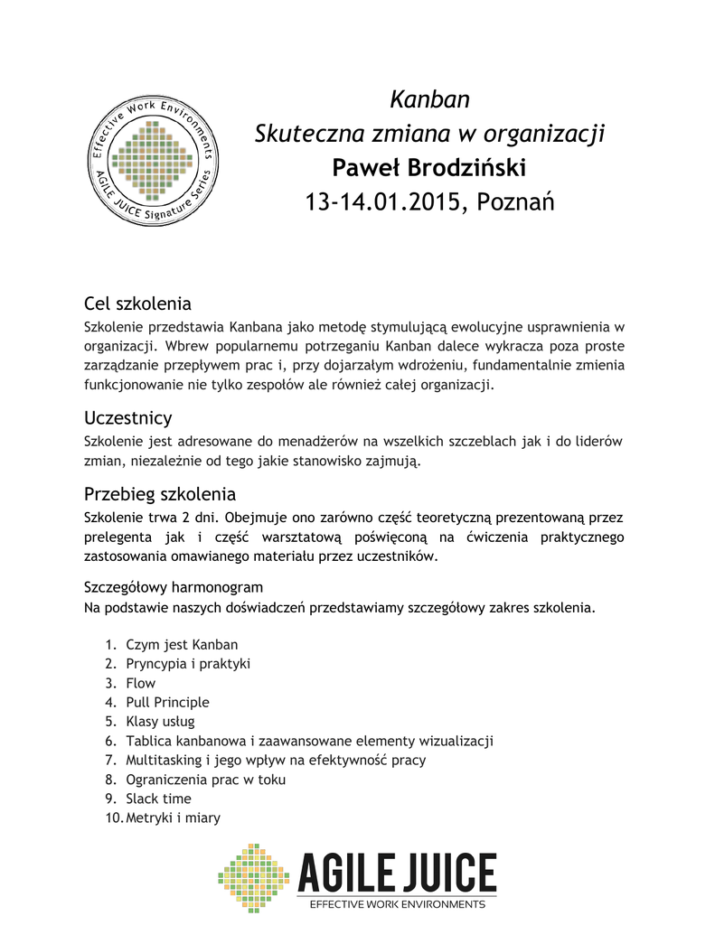 Kanban Skuteczna zmiana w organizacji Paweł Brodziński 13-14.01.2015, Poznań Cel szkolenia Szkolenie przedstawia Kanbana jako metodę stymulującą ewolucyjne usprawnienia w organizacji. Wbrew popularnemu potrzeganiu Kanban dalece wykracza poza proste zarządzanie przepływem prac i, przy dojarzałym wdrożeniu, fundamentalnie zmienia funkcjonowanie nie tylko zespołów ale również całej organizacji. Uczestnicy Szkolenie jest adresowane do menadżerów na wszelkich szczeblach jak i do liderów zmian, niezależnie od tego jakie stanowisko zajmują. Przebieg szkolenia Szkolenie trwa 2 dni. Obejmuje ono zarówno część teoretyczną prezentowaną przez prelegenta jak i część warsztatową poświęconą na ćwiczenia praktycznego zastosowania omawianego materiału przez uczestników. Szczegółowy harmonogram Na podstawie naszych doświadczeń przedstawiamy szczegółowy zakres szkolenia. 1. Czym jest Kanban 2. Pryncypia i praktyki 3. Flow 4. Pull Principle 5. Klasy usług 6. Tablica kanbanowa i zaawansowane elementy wizualizacji 7. Multitasking i jego wpływ na efektywność pracy 8. Ograniczenia prac w toku 9. Slack time 10.Metryki i miary 11.Prawo Little'a 12.Estymacja i przewidywanie 13.Kanban na wielu poziomach organizacji 14.Value stream mapping 15.Modele zmiany organizacji 16.Elementy teorii ograniczeń 17.Zarządzanie wąskimi gardłami 18.Elementy teorii kolejek O prowadzącym Szkolenie przeprowadzi Paweł Brodziński. Paweł Brodziński jest doświadczonym liderem zespołów tworzących oprogramowanie. W swojej karierze zarządzał zespołami od kilku do 150 inżynierów. Obecnie prowadzi Lunar Logic, gdzie wiele z praktyk zarządzania zespołem oraz projektami dalece wykracza poza tradycyjne standardy. Swoją rolę w firmie postrzega jako lider zmian a nie menadżer. Jest autorem pierwszego wdrożenia Kanbana w IT w Polsce, jednym z liderów światowej społeczności Lean Kanban i jedynym Polakiem z tytułem Kanban Coaching Professional. W roku 2013 był nominowany do nagrody Brickell Key Award, którą wyróżniane są osoby mające kluczowy wkład w rozwój metody i społeczności. Paweł jest popularnym prelegentem na konferencjach w kraju i za granicą. Pod adresem brodzinski.com można znaleźć jego bloga gdzie dzieli się doświadczeniami z obszaru zarządzania projektami i zespołami. Warunki organizacyjne Miejsce realizacji szkolenia Szkolenie odbywa się jednym z centrów konferencyjnych w Poznaniu Liczba uczestników maksymalnie 12 osób Terminy realizacji szkolenia 13-14.01.2015 Cena uczestnictwa Dni szkoleniowych: 2 (dwa) Cena: 2600 PLN + 23% VAT Forma rozliczenia: faktura VAT Nr rachunku bankowego 29 1140 2004 0000 3802 4069 5734 Tytuł przelewu imię i nazwisko uczestnika(ów) Cena obejmuje 2 dni szkoleniowe pełne wyżywienie Cena nie obejmuje licencji, materiałów szkoleniowych Zgłoszenie uczestnika poprzez pocztę elektroniczną Osoba do kontaktu z ramienia organizatora Piotr Trojanowski, [email protected], +48 608 580 162 Dlaczego Agile Juice? Współpracując z nami, masz gwarancję, że Twoja organizacja będzie mogła skorzystać z wieloletniego doświadczenia konsultantów a Twoi pracownicy będą mogli zdobywać nową wiedzę i pokonywać wewnętrzne ograniczenia. ● Zwiększamy efektywność zespołów i organizacji ● Diagnozujemy i pomagamy eliminować dysfynkcje ● Podnosimy odpowiedzialność pracowników i zespołów ● Rozpoznajemy i uwalniamy potencjał pracowników ● Przygotowujemy ludzi do wprowadzania realnych zmian w swoim otoczeniu Oferta Oferujemy szereg usług z zakresu wytwarzania oprogramowania, metodyk Lean & Agile oraz optymalizacji organizacji: ● wspieramy startupy podczas budowania organizacji ● transformujemy dojrzałe organizacje ● przeprowadzamy zmiany w organizacjach ● przeprowadzamy przez wdrożenia metodyk Agile, Lean & XP ● prowadzimy szkolenia i warsztaty dla kadry zarządzającej, liderów średniego szczebla ● prowadzimy szkolenia i warsztaty dla Scrum Masterów, Product Ownerów i zespołów deweloperskich ● szkolimy w zakresie administracji i konfigurowania aplikacji Atlassian - JIRA, JIRA Agile (dawniej Greenhopper) Współpracujemy z