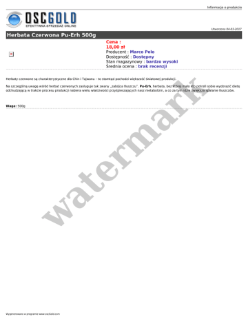 Informacje o produkcie Utworzono 04-03-2017 Herbata Czerwona Pu-Erh 500g Cena : 18,00 zł Producent : Marco Polo Dostępność : Dostępny Stan magazynowy : bardzo wysoki Średnia ocena : brak recenzji Herbaty czerwone są charakterystyczne dla Chin i Tajwanu – to stamtąd pochodzi większość światowej produkcji. er m ar k Na szczególną uwagę wśród herbat czerwonych zasługuje tak zwany „zabójca tłuszczu”. Pu-Erh, herbata, bez której mało kto potrafi sobie wyobrazić dietę odchudzającą w trakcie procesu produkcji nabiera wielu właściwości przyśpieszających nasz metabolizm, a co za tym idzie zwiększa spalanie tłuszczów. w at Waga: 500g Wygenerowano w programie www.oscGold.com