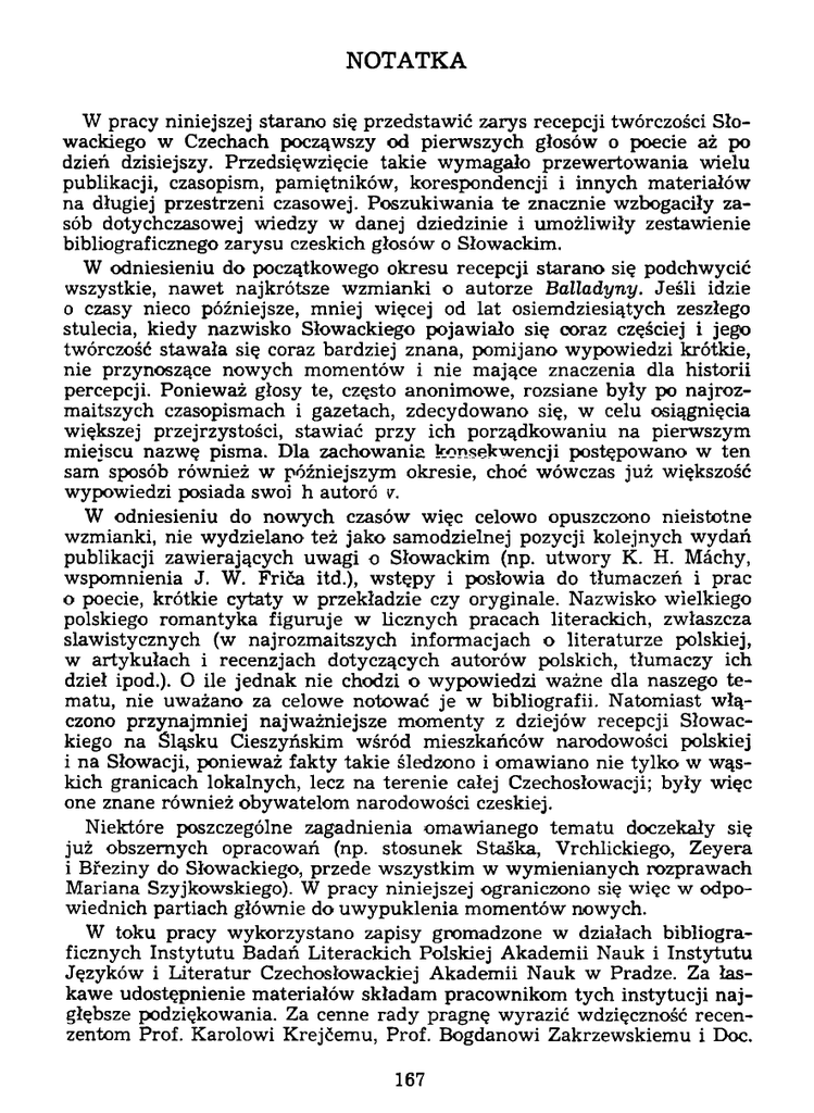 NOTATKA W pracy niniejszej starano s i ę p r z e d s t a w i ć zarys recepcji twórczości S ł o wackiego w Czechach p o c z ą w s z y od pierwszych g ł o s ó w o poecie aż po dzień dzisiejszy. P r z e d s i ę w z i ę c i e takie w y m a g a ł o przewertowania wielu publikacji, czasopism, p a m i ę t n i k ó w , korespondencji i innych m a t e r i a ł ó w na długiej przestrzeni czasowej. Poszukiwania te znacznie w z b o g a c i ł y za sób dotychczasowej wiedzy w danej dziedzinie i u m o ż l i w i ł y zestawienie bibliograficznego zarysu czeskich g ł o s ó w o S ł o w a c k i m . W odniesieniu do p o c z ą t k o w e g o okresu recepcji starano s i ę p o d c h w y c i ć wszystkie, nawet najkrótsze wzmianki o autorze Balladyny. Jeśli idzie o czasy nieco późniejsze, mniej w i ę c e j od lat o s i e m d z i e s i ą t y c h zeszłego stulecia, kiedy nazwisko S ł o w a c k i e g o p o j a w i a ł o s i ę coraz częściej i jego twórczość stawała s i ę coraz bardziej znana, pomijano wypowiedzi krótkie, nie przynoszące nowych m o m e n t ó w i nie m a j ą c e znaczenia dla historii percepcji. P o n i e w a ż g ł o s y te, często anonimowe, rozsiane b y ł y po najroz maitszych czasopismach i gazetach, zdecydowano się, w celu osiągnięcia w i ę k s z e j przejrzystości, s t a w i a ć przy ich p o r z ą d k o w a n i u na pierwszym miejscu n a z w ę pisma. Dla zachowanie konsekwencji p o s t ę p o w a n o w ten sam sposób r ó w n i e ż w p ó ź n i e j s z y m okresie, choć w ó w c z a s już w i ę k s z o ś ć wypowiedzi posiada swoi h autoró v. W odniesieniu do nowych c z a s ó w w i ę c celowo opuszczono nieistotne wzmianki, nie wydzielano t e ż jako samodzielnej pozycji kolejnych w y d a ń publikacji z a w i e r a j ą c y c h uwagi o S ł o w a c k i m (np. utwory K . H . Machy, wspomnienia J . W. Frića itd.), w s t ę p y i p o s ł o w i a do t ł u m a c z e ń i prac 0 poecie, krótkie cytaty w przekładzie czy oryginale. Nazwisko wielkiego polskiego romantyka figuruje w licznych pracach literackich, z w ł a s z c z a slawistycznych (w najrozmaitszych informacjach o literaturze polskiej, w artykułach i recenzjach d o t y c z ą c y c h a u t o r ó w polskich, t ł u m a c z y ich dzieł ipod.). O ile jednak nie chodzi o wypowiedzi w a ż n e dla naszego te matu, nie u w a ż a n o za celowe n o t o w a ć je w bibliografii. Natomiast w ł ą czono przynajmniej n a j w a ż n i e j s z e momenty z d z i e j ó w recepcji S ł o w a c kiego na Ś l ą s k u C i e s z y ń s k i m w ś r ó d m i e s z k a ń c ó w narodowości polskiej 1 na Słowacji, p o n i e w a ż fakty takie śledzono i omawiano nie tylko w w ą s kich granicach lokalnych, lecz na terenie całej Czechosłowacji; b y ł y w i ę c one znane r ó w n i e ż obywatelom narodowości czeskiej. N i e k t ó r e poszczególne zagadnienia omawianego tematu doczekały s i ę już obszernych opracowań (np. stosunek Staśka, Vrchlickiego, Zeyera i Bfeziny do S ł o w a c k i e g o , przede wszystkim w wymienianych rozprawach Mariana Szyjkowskiego). W pracy niniejszej ograniczono się w i ę c w odpo wiednich partiach g ł ó w n i e do uwypuklenia m o m e n t ó w nowych. W toku pracy wykorzystano zapisy gromadzone w działach bibliogra ficznych Instytutu Badań Literackich Polskiej Akademii Nauk i Instytutu J ę z y k ó w i Literatur Czechosłowackiej Akademii Nauk w Pradze. Za ł a s kawe u d o s t ę p n i e n i e m a t e r i a ł ó w s k ł a d a m pracownikom tych instytucji naj głębsze podziękowania. Za cenne rady pragnę w y r a z i ć w d z i ę c z n o ś ć recen zentom Prof. Karolowi K r e j ć e m u , Prof. Bogdanowi Zakrzewskiemu i Doc. 167 Jerzemu Krystynkowi, dalej Prof. W ł a d y s ł a w o w i Floryanowi, Prof. Euge niuszowi Sawrymowiczowi, Doc. S t a n i s ł a w o w i Makowskiemu, pracowni kom naszej katedry i w s p ó ł p r a c o w n i k o w i n a j b l i ż s z e m u — swojej Żonie. 168