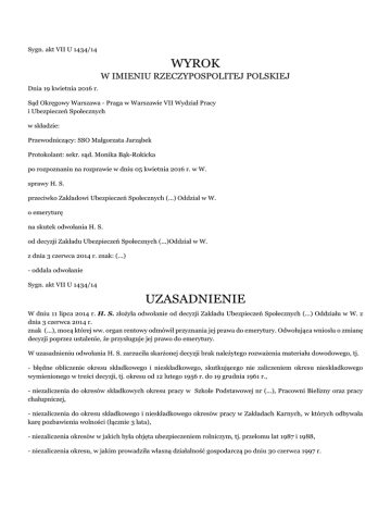 Sygn. akt VII U 1434/14 WYROK W IMIENIU RZECZYPOSPOLITEJ POLSKIEJ Dnia 19 kwietnia 2016 r. Sąd Okręgowy Warszawa - Praga w Warszawie VII Wydział Pracy i Ubezpieczeń Społecznych w składzie: Przewodniczący: SSO Małgorzata Jarząbek Protokolant: sekr. sąd. Monika Bąk-Rokicka po rozpoznaniu na rozprawie w dniu 05 kwietnia 2016 r. w W. sprawy H. S. przeciwko Zakładowi Ubezpieczeń Społecznych (...) Oddział w W. o emeryturę na skutek odwołania H. S. od decyzji Zakładu Ubezpieczeń Społecznych (...)Oddział w W. z dnia 3 czerwca 2014 r. znak: (...) - oddala odwołanie Sygn. akt VII U 1434/14 UZASADNIENIE W dniu 11 lipca 2014 r. H. S. złożyła odwołanie od decyzji Zakładu Ubezpieczeń Społecznych (...) Oddziału w W. z dnia 3 czerwca 2014 r. znak (...), mocą której ww. organ rentowy odmówił przyznania jej prawa do emerytury. Odwołująca wniosła o zmianę decyzji poprzez ustalenie, że przysługuje jej prawo do emerytury. W uzasadnieniu odwołania H. S. zarzuciła skarżonej decyzji brak należytego rozważenia materiału dowodowego, tj. - błędne obliczenie okresu składkowego i nieskładkowego, skutkującego nie zaliczeniem okresu nieskładkowego wymienionego w treści decyzji, tj. okresu od 12 lutego 1956 r. do 19 grudnia 1961 r., - niezaliczenia do okresów składkowych okresu pracy w Szkole Podstawowej nr (...), Pracowni Bielizny oraz pracy chałupniczej, - niezaliczenia do okresu składkowego i nieskładkowego okresów pracy w Zakładach Karnych, w których odbywała karę pozbawienia wolności (łącznie 3 lata), - niezaliczenia okresów w jakich była objęta ubezpieczeniem rolniczym, tj. przełomu lat 1987 i 1988, - niezaliczenia okresu, w jakim prowadziła własną działalność gospodarczą po dniu 30 czerwca 1997 r. Odwołująca zaznaczyła, że choć przepracowała w wielu zakładach pracy ponad 30 lat to ma problem z udowodnieniem tej okoliczności, gdyż większość z zakładów w których pracowała od dawna nie istnieje a dokumentacja z nich zaginęła. Odwołująca pokrótce odniosła się do wskazanych wyżej okresów, o których zaliczenie do ustalenia stażu pracy wnioskuje, podkreślając, że w powyższych okresach były odprowadzane za nią składki na ubezpieczenie społeczne. Ponadto odwołująca wniosła o przeprowadzenie dowodów z dokumentów, przesłuchanie jej w charakterze strony oraz zwrócenie się przez Sąd do wymienionych w treści odwołania zakładów pracy, archiwów i instytucji o dostarczenie jej dokumentacji osobowej, potwierdzających wykonywanie pracy w spornym okresie. W odpowiedzi na odwołanie z dnia 22 lipca 2014 r. Zakład Ubezpieczeń Społecznych (...) Oddział w W. wniósł o oddalenie odwołania H. S. na podstawie art. 47714 § 1 k.p.c. Powołując się na treść art. 27 i 28 ustawy o emeryturach i rentach z Funduszu Ubezpieczeń Społecznych pełnomocnik organu rentowego podkreślił, że H. S. nie spełniła kryterium stażu pracy, gdyż udokumentowała jedynie 3 lata, 1 miesiąc i 28 dni okresów składkowych i nieskładkowych. Organ rentowy powołał się na argumentację prezentowaną w skarżonej decyzji i wyjaśnił przyczyny nieuwzględnienia przy obliczaniu stażu pracy odwołującej spornych okresów. Sąd Okręgowy ustalił następujący stan faktyczny: W dniu 2 kwietnia 2014 r. H. S. złożyła do Zakładu Ubezpieczeń Społecznych (...) Oddziału w W. wniosek o emeryturę, do którego załączyła dokumentację potwierdzająca okresy jej zatrudnienia (wniosek o emeryturę z 02.04.2014r. wraz z załącznikami k. 1-105 a.r.). Po rozpoznaniu wniosku H. S. Zakład Ubezpieczeń Społecznych (...) Oddział w W. wydał w dniu 3 czerwca 2014 r. decyzję, znak: (...), na mocy której odmówił jej prawa do emerytury z uwagi na brak udowodnionej wymaganej przepisem art. 27 ustawy emerytalnej, alternatywnie przepisem art. 28 ustawy emerytalnej minimalnej liczby lat okresów składkowych i nieskładkowych. Organ rentowy wskazał, że na podstawie przedłożonych przez odwołującą dokumentów ustalił, że jej ogólny staż pracy wynosi 3 lata, 1 miesiąc i 28 dni okresów składkowych i nieskładkowych. Organ rentowy do stażu pracy zaliczył następujące okresy: - od 20 grudnia 1961 r. do 16 lutego 1962 r., - od 29 sierpnia 1964 r. do 14 września 1964 r., - od 9 października 1974 r. do 31 grudnia 1975 r., - od 16 lutego 1976 r. do 30 marca 1976 r., - od 1 lipca 1996 r. do 30 czerwca 1997 r., - od 12 lutego 1956 r. do 19 grudnia 1961 r. - nieskładkowy, - od 23 września 1996 r. do 30 listopada 1996 r. - nieskładkowy zawarte w okresach składkowych. Organ rentowy wskazał również, że do stażu pracy nie zaliczono zatrudnienia w charakterze chałupnika z powodu braku zaświadczenia o zatrudnieniu i zarobkach, zatrudnienia w Szkole podstawowej nr (...) w W. z powodu braku świadectwa pracy oraz zatrudnienia w Pracowni Bielizny z powodu braku dokumentów potwierdzających zatrudnienie (skarżona decyzja ZUS z 03.06.2014 r. k. 119 a.r.). Po ponownym rozpatrzeniu wniosku H. S.Ubezpieczeń Społecznych (...) Oddział w W. wydał w dniu 17 lutym 2016 r. decyzję, znak: (...), na mocy której ponownie odmówił jej prawa do emerytury, z tożsamych przyczyn, co w przypadku poprzedniej decyzji. Jednocześnie organ rentowy dokonał nowych ustaleń w zakresie ogólnego stażu pracy H. S. i wskazał, że wynosi 4 lata i 9 miesięcy okresów składkowych i nieskładkowych. W porównaniu do decyzji z 3 czerwca 2015r. organ rentowy dodatkowo zaliczył okresy: - od 14 grudnia 1971 r. do 28 czerwca 1972 r., - od 26 sierpnia 1972 r. do 6 grudnia 1972 r., - od 24 marca 1973 r. do 3 sierpnia 1973 r. (decyzja ZUS z 17.02.2016 r. k. 120 a.r.) W toku postępowania, w zakresie przedmiotu sporu, Sąd ustalił następującą historię zatrudnienia H. S.: W okresie od dnia 20 sierpnia 1958 r. do dnia 23 grudnia 1960 r. wnioskodawczyni była zatrudniona w (...) Zakładach (...) w W. na podstawie umowy o pracę chałupniczą (dokum