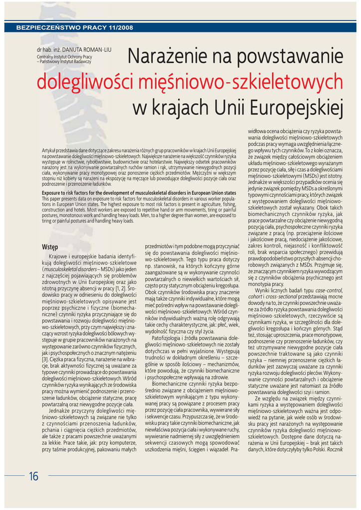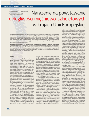 BEZPIECZESTWO PRACY 11/2008 dr hab. in¿. DANUTA ROMAN-LIU Centralny Instytut Ochrony Pracy – Pañstwowy Instytut Badawczy Artyku³ przedstawia dane dotycz¹ce zakresu nara¿enia ró¿nych grup pracowników w krajach Unii Europejskiej na powstawanie dolegliwoci miêniowo-szkieletowych. Najwiêksze nara¿enie na wiêkszoæ czynników ryzyka wystêpuje w rolnictwie, rybo³ówstwie, budownictwie oraz hotelarstwie. Najwiêkszy odsetek pracowników nara¿ony jest na wykonywanie powtarzalnych ruchów ramion i r¹k, utrzymywanie niewygodnych pozycji cia³a, wykonywanie pracy monotypowej oraz ponoszenie ciê¿kich przedmiotów. Mê¿czyni w wiêkszym stopniu ni¿ kobiety s¹ nara¿eni na ekspozycjê na mêcz¹ce lub powoduj¹ce dolegliwoci pozycje cia³a oraz podnoszenie i przenoszenie ³adunków. Exposure to risk factors for the development of musculoskeletal disorders in European Union states This paper presents data on exposure to risk factors for musculoskeletal disorders in various worker populations in European Union states. The highest exposure to most risk factors is present in agriculture, fishing, construction and hotels. Most workers are exposed to repetitive hand or arm movements, tiring or painful postures, monotonous work and handling heavy loads. Men, to a higher degree than women, are exposed to tiring or painful postures and handling heavy loads. Wstêp Krajowe i europejskie badania identyfikuj¹ dolegliwoci miêniowo-szkieletowe (musculoskeletal disorders – MSDs) jako jeden z najczêciej pojawiaj¹cych siê problemów zdrowotnych w Unii Europejskiej oraz jako istotn¹ przyczynê absencji w pracy [1, 2]. rodowisko pracy w odniesieniu do dolegliwoci miêniowo-szkieletowych opisywane jest poprzez psychiczne i fizyczne (biomechaniczne) czynniki ryzyka przyczyniaj¹ce siê do powstawania i rozwoju dolegliwoci miêniowo-szkieletowych, przy czym najwiêkszy i znacz¹cy wzrost ryzyka dolegliwoci bólowych wystêpuje w grupie pracowników nara¿onych na wystêpowanie zarówno czynników fizycznych, jak i psychospo³ecznych o znacznym natê¿eniu [3]. Ciê¿ka praca fizyczna, nara¿enie na wibracje, brak aktywnoci fizycznej s¹ uwa¿ane za typowe czynniki prowadz¹ce do powstawania dolegliwoci miêniowo-szkieletowych. Wród czynników ryzyka wynikaj¹cych ze rodowiska pracy mo¿na wymieniæ podnoszenie i przenoszenie ³adunków, obci¹¿enie statyczne, pracê powtarzaln¹ oraz niewygodne pozycje cia³a. Jednak¿e przyczyny dolegliwoci miêniowo-szkieletowych s¹ zwi¹zane nie tylko z czynnociami przenoszenia ³adunków, pchania i ci¹gniêcia ciê¿kich przedmiotów, ale tak¿e z pracami powszechnie uwa¿anymi za lekkie. Prace takie, jak: przy komputerze, przy tamie produkcyjnej, pakowaniu ma³ych 16 przedmiotów i tym podobne mog¹ przyczyniaæ siê do powstawania dolegliwoci miêniowo-szkieletowych. Tego typu praca dotyczy np. stanowisk, na których koñczyny górne zaanga¿owane s¹ w wykonywanie czynnoci powtarzalnych o niewielkich wartociach si³, czêsto przy statycznym obci¹¿eniu krêgos³upa. Obok czynników rodowiska pracy znaczenie maj¹ tak¿e czynniki indywidualne, które mog¹ mieæ poredni wp³yw na powstawanie dolegliwoci miêniowo-szkieletowych. Wród czynników indywidualnych wa¿n¹ rolê odgrywaj¹ takie cechy charakterystyczne, jak: p³eæ, wiek, wydolnoæ fizyczna czy styl ¿ycia. Patofizjologia i ród³a powstawania dolegliwoci miêniowo-szkieletowych nie zosta³y dotychczas w pe³ni wyjanione. Wystêpuj¹ trudnoci w dok³adnym okreleniu – szczególnie w sposób ilociowy – mechanizmów, które powoduj¹, ¿e czynniki biomechaniczne i psychospo³eczne wp³ywaj¹ na zdrowie. Biomechaniczne czynniki ryzyka bezporednio zwi¹zane z obci¹¿eniem miêniowoszkieletowym wynikaj¹cym z typu wykonywanej pracy s¹ powi¹zane z procesem pracy przez pozycjê cia³a pracownika, wywierane si³y i sekwencje czasu. Przypuszcza siê, ¿e w rodowisku pracy takie czynniki biomechaniczne, jak niew³aciwa pozycja cia³a i wykonywane ruchy, wywieranie nadmiernej si³y z uwzglêdnieniem sekwencji czasowych mog¹ spowodowaæ uszkodzenia miêni, ciêgien i wi¹zade³. Pra- wid³owa ocena obci¹¿enia czy ryzyka powstawania dolegliwoci miêniowo-szkieletowych podczas pracy wymaga uwzglêdnienia ³¹cznego wp³ywu tych czynników. To z kolei oznacza, ¿e zwi¹zek miêdzy ca³ociowym obci¹¿eniem uk³adu miêniowo-szkieletowego wyra¿anym przez pozycjê cia³a, si³ê i czas a dolegliwociami miêniowo-szkieletowymi (MSDs) jest istotny. Jednak¿e w wiêkszoci przypadków ocenia siê jedynie zwi¹zek pomiêdzy MSDs a okrelonymi typowymi czynnociami pracy, których zwi¹zek z wystêpowaniem dolegliwoci miêniowoszkieletowych zosta³ wykazany. Obok takich biomechanicznych czynników ryzyka, jak prace powtarzalne czy obci¹¿enie niewygodn¹ pozycj¹ cia³a, psychospo³eczne czynniki ryzyka zwi¹zane z prac¹ (np. przeci¹¿enie ilociowe i jakociowe prac¹, niedoci¹¿enie jakociowe, zakres kontroli, niejasnoæ i konfliktowoæ roli, brak wsparcia spo³ecznego) przewiduj¹ prawdopodobieñstwo przysz³ych absencji chorobowych zwi¹zanych z MSDs. Przyjmuje siê, ¿e znacz¹cym czynnikiem ryzyka wywodz¹cym siê z czynników obci¹¿enia psychicznego jest monotypia pracy. Wyniki licznych badañ typu case-control, cohort i cross-sectional przedstawiaj¹ mocne dowody na to, ¿e czynniki powszechnie uwa¿ane za ród³o ryzyka powstawania dolegliwoci miêniowo-szkieletowych, rzeczywicie s¹ czynnikami ryzyka, w szczególnoci dla dolegliwoci krêgos³upa i koñczyn górnych. St¹d te¿, stosuj¹c uproszczenia, prace monotypowe, podnoszenie czy przenoszenie ³adunków, czy te¿ utrzymywane niewygodne pozycje cia³a powszechnie traktowane s¹ jako czynniki ryzyka – niemniej przenoszenie ciê¿kich ³adunków jest zazwyczaj uwa¿ane za czynniki ryzyka rozwoju dolegliwoci pleców. Wykonywanie czynnoci powtarzalnych i obci¹¿enie statyczne uwa¿ane jest natomiast za ród³o powstawania dolegliwoci s