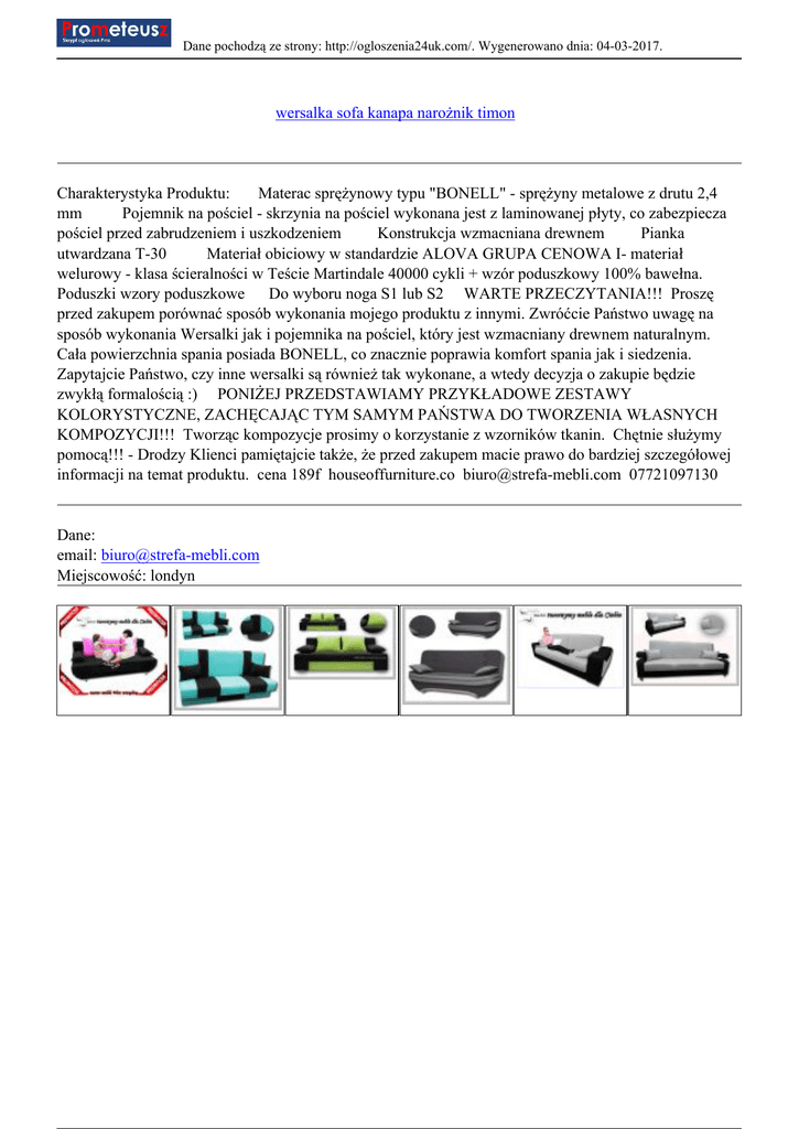 Dane pochodzą ze strony: http://ogloszenia24uk.com/. Wygenerowano dnia: 04-03-2017. wersalka sofa kanapa narożnik timon Charakterystyka Produktu: Materac sprężynowy typu "BONELL" - sprężyny metalowe z drutu 2,4 mm Pojemnik na pościel - skrzynia na pościel wykonana jest z laminowanej płyty, co zabezpiecza pościel przed zabrudzeniem i uszkodzeniem Konstrukcja wzmacniana drewnem Pianka utwardzana T-30 Materiał obiciowy w standardzie ALOVA GRUPA CENOWA I- materiał welurowy - klasa ścieralności w Teście Martindale 40000 cykli + wzór poduszkowy 100% bawełna. Poduszki wzory poduszkowe Do wyboru noga S1 lub S2 WARTE PRZECZYTANIA!!! Proszę przed zakupem porównać sposób wykonania mojego produktu z innymi. Zwróćcie Państwo uwagę na sposób wykonania Wersalki jak i pojemnika na pościel, który jest wzmacniany drewnem naturalnym. Cała powierzchnia spania posiada BONELL, co znacznie poprawia komfort spania jak i siedzenia. Zapytajcie Państwo, czy inne wersalki są również tak wykonane, a wtedy decyzja o zakupie będzie zwykłą formalością :) PONIŻEJ PRZEDSTAWIAMY PRZYKŁADOWE ZESTAWY KOLORYSTYCZNE, ZACHĘCAJĄC TYM SAMYM PAŃSTWA DO TWORZENIA WŁASNYCH KOMPOZYCJI!!! Tworząc kompozycje prosimy o korzystanie z wzorników tkanin. Chętnie służymy pomocą!!! - Drodzy Klienci pamiętajcie także, że przed zakupem macie prawo do bardziej szczegółowej informacji na temat produktu. cena 189f houseoffurniture.co [email protected] 07721097130 Dane: email: [email protected] Miejscowość: londyn
