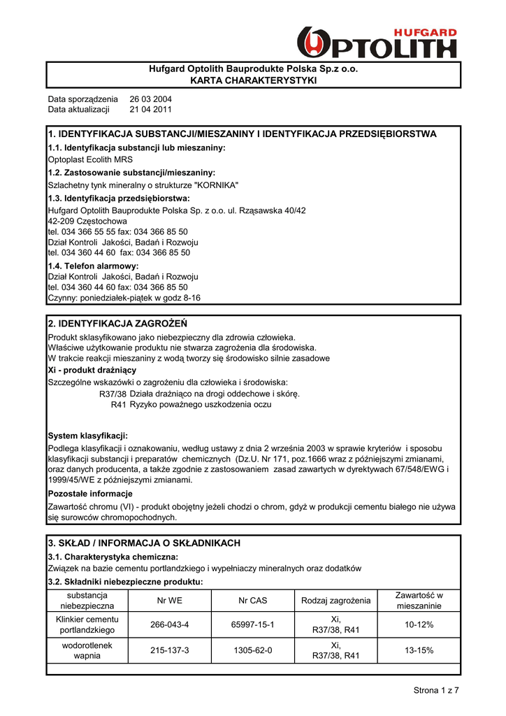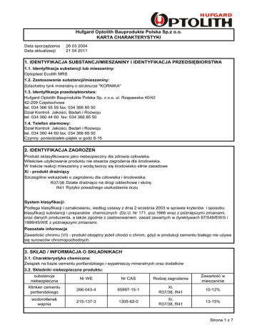 Hufgard Optolith Bauprodukte Polska Sp.z o.o. KARTA CHARAKTERYSTYKI Data sporządzenia Data aktualizacji 26 03 2004 21 04 2011 1. IDENTYFIKACJA SUBSTANCJI/MIESZANINY I IDENTYFIKACJA PRZEDSIĘBIORSTWA 1.1. Identyfikacja substancji lub mieszaniny: Optoplast Ecolith MRS 1.2. Zastosowanie substancji/mieszaniny: Szlachetny tynk mineralny o strukturze "KORNIKA" 1.3. Identyfikacja przedsiębiorstwa: Hufgard Optolith Bauprodukte Polska Sp. z o.o. ul. Rząsawska 40/42 42-209 Częstochowa tel. 034 366 55 55 fax: 034 366 85 50 Dział Kontroli Jakości, Badań i Rozwoju tel. 034 360 44 60 fax: 034 366 85 50 1.4. Telefon alarmowy: Dział Kontroli Jakości, Badań i Rozwoju tel. 034 360 44 60 fax: 034 366 85 50 Czynny: poniedziałek-piątek w godz 8-16 2. IDENTYFIKACJA ZAGROŻEŃ Produkt sklasyfikowano jako niebezpieczny dla zdrowia człowieka. Właściwe użytkowanie produktu nie stwarza zagrożenia dla środowiska. W trakcie reakcji mieszaniny z wodą tworzy się środowisko silnie zasadowe Xi - produkt drażniący Szczególne wskazówki o zagrożeniu dla człowieka i środowiska: R37/38 Działa drażniąco na drogi oddechowe i skórę. R41 Ryzyko poważnego uszkodzenia oczu System klasyfikacji: Podlega klasyfikacji i oznakowaniu, według ustawy z dnia 2 września 2003 w sprawie kryteriów i sposobu klasyfikacji substancji i preparatów chemicznych (Dz.U. Nr 171, poz.1666 wraz z późniejszymi zmianami, oraz danych producenta, a także zgodnie z zastosowaniem zasad zawartych w dyrektywach 67/548/EWG i 1999/45/WE z późniejszymi zmianami. Pozostałe informacje Zawartość chromu (VI) - produkt obojętny jeżeli chodzi o chrom, gdyż w produkcji cementu białego nie używa się surowców chromopochodnych. 3. SKŁAD / INFORMACJA O SKŁADNIKACH 3.1. Charakterystyka chemiczna: Związek na bazie cementu portlandzkiego i wypełniaczy mineralnych oraz dodatków 3.2. Składniki niebezpieczne produktu: substancja niebezpieczna Nr WE Nr CAS Rodzaj zagrożenia Zawartość w mieszaninie Klinkier cementu portlandzkiego 266-043-4 65997-15-1 Xi, R37/38, R41 10-12% wodorotlenek wapnia 215-137-3 1305-62-0 Xi, R37/38, R41 13-15% Strona 1 z 7 4. PIERWSZA POMOC Przy kontaktach z pomocą medyczną należy posiadać niniejszą KCHPN Wskazówki ogólne Należy przestrzegać uwag dotyczących bezpieczeństwa i użytkowania zamieszczonych na etykiecie. W przypadku wystąpienia jakichkolwiek niepokojących objawów wezwać lekarza lub odwieźć poszkodowanego do szpitala, pokazać opakowanie lub etykietę. Po znaczącym zanieczyszczeniu dróg oddechowych Przenieść poszkodowanego na świeże powietrze. Pył z krtani oraz dróg nosowych powinien usunąć się samoczynnie. Kontakt z lekarzem powinien nastąpić przy stałym podrażnieniu lub późniejszych objawach dyskomfortu takich jak kaszel i inne. Dostarczyć świeże powietrze lub tlen. Wezwać lekarza. Wyprowadzić ludzi z obszaru zapylonego. Kontakt ze skórą: Suchą mieszaninę usunąć i skórę spłukać obficie wodą. Mokrą mieszaninę spłukiwać obficie wodą. Zdjąć zanieczyszczoną odzież, obuwie, zegarek itp. oraz wyczyścić przed ponownym stosowaniem. Skontaktować się z lekarzem w przypadku jakichkolwiek podrażnień lub oparzeń. Kontakt z oczami: Nie trzeć oczu, bo może to spowodować dodatkowe mechaniczne uszkodzenie. Przepłukać oczy dużą ilością wody, usunąć szkła kontaktowe (jeżeli są) oraz odsunąć szeroko powieki i w dalszym ciągu płukać oczy dużą ilością czystej wody przez okres około 45 minut, w celu usunięcia wszystkich zanieczyszczeń. Jeżeli możliwe stosować wodę izotoniczną (0,9% NaCl). Skontaktować się ze specjalistą z medycyny pracy lub okulistą Spożycie: Nie wolno wywoływać wymiotów. Jeżeli poszkodowany jest przytomny wypłukać usta dużą ilością wody oraz podać wodę do picia. Niezwłocznie skontaktować się z pomocą medyczną 5. POSTĘPOWANIE W PRZYPADKU POŻARU Temperatura zapłonu Mieszanina jest niepalna i niewybuchowa oraz nie wznieci i nie będzie podtrzymywała palenia się innych materiałów. Środki gaśnicze Wszystkie typy środków gaśniczych Wyposażenie gaśnicze Mieszanina nie powoduje zagrożenia związanego z ogniem. Zalecane jest stosowanie sprzętu izolującego drogi oddechowe Specjalne wyposażenie ochronne: Dostosowane do przyczyny pożaru. Inne dane: Należy przestrzegać założeń miejscowego planu ratunkowego. 6. POSTĘPOWANIE W PRZYPADKU NIEZAMIERZONEGO UWOLNIENIA DO ŚRODOWISKA Środki ostrożności dostosowane do danej osoby: Unikać wdychania pyłu, kontaktu z oczami i skórą. Procedury awaryjne nie są wymagane. Środki ochrony środowiska: Zabezpieczyć przed dostaniem się dużych ilości mieszaniny do zbiorników, cieków wodnych, kanalizacji i ścieków. Metoda oczyszczania/ wchłaniania: Usunąć mechanicznie unikając przy tym zapylenia. Zadbać o wystarczającą wentylację. W odpowiednich pojemnikach dostarczyć do punktu utylizacji. Stwardniały pod wpływem wilgoci produkt można traktować jako gruz budowlany. Strona 2 z 7 7. POSTĘPOWANIE Z MIESZANINĄ I JEJ MAGAZYNOWANIE 7.1. Postępowanie z substancją/mieszaniną: Nie używać i nie składować w pobliżu pożywienia i picia. Nie dopuszczać dzieci do kontaktu z materiałem. Unikać rozprzestrzeniania się pyłu: - Produkt workowany stosowany w otwartych mieszalnikach: Najpierw wlać wodę, następnie stopniowo dodawać mieszaninę, nie wsypywać z dużej wysokości. Rozpoczynać mieszanie powoli. Nie zgniatać pustych worków, chyba, że są umieszczone wewnątrz czystego worka. - Usuwać suchą mieszaninę zgodnie z punktem 6. Noszenie worków z mieszaniną może powodować nadwyrężenie pleców, rąk, ramion oraz nóg. 7.2. Magazynowanie Mieszanina powinna być przechowywana w zamkniętych opakowaniach, oddzielona od gruntu, w chłodnych suchych warunkach, zabezpieczonych przed gwałtownymi ciągami powietrznymi w celu uniknięcia obniżenia jakości. Worki powinny być układane w układzie