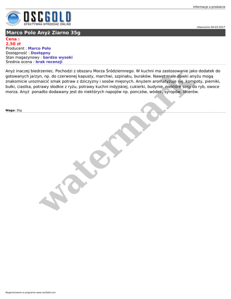 Informacje o produkcie Utworzono 04-03-2017 Marco Polo Anyż Ziarno 35g Cena : 2,50 zł Producent : Marco Polo Dostępność : Dostępny Stan magazynowy : bardzo wysoki Średnia ocena : brak recenzji er m ar k Anyż inaczej biedrzeniec. Pochodzi z obszaru Morza Śródziemnego. W kuchni ma zastosowanie jako dodatek do gotowanych jarzyn, np. do czerwonej kapusty, marchwi, szpinaku, buraków. Nawet małe dawki anyżu mogą znakomicie urozmaicić smak potraw z dziczyzny i sosów mięsnych. Anyżem aromatyzuje się kompoty, pierniki, bułki, ciastka, potrawy słodkie z ryżu, potrawy kuchni indyjskiej, cukierki, budynie, niektóre sosy do ryb, owoce morza. Anyż ponadto dodawany jest do niektórych napojów np. ponczów, wódek, syropów, likierów. w at Waga: 35g Wygenerowano w programie www.oscGold.com