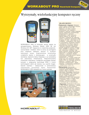 WORKABOUT PRO Hand−held Computer Wytrzymały, wielofunkcyjny komputer ręczny W£AŒCIWOŒCI WORKABOUT PRO to komputer ręczny oparty na oprogramowaniu Windows Mobile 2003 SE lub Windows CE .NET. Zapewnia on znakomitą wydajność, wytrzymałość i trwałość, które to cechy są wymagane przy mobilnym zbieraniu danych w trudnych warunkach pracy. Ergonomiczna k onstrukcja urządzenia oparta o obowiązujące w przemyśle standardy zapewnia łatwą integrację z już posiadaną lub planowaną infrastrukturą. Nieporównywalne możliwości rozbudowy i podłączeń pozwalają czerpać korzyści z połączenia technologii RFID z innymi technologiami takimi jak skanery czy czytniki imager. Szeroki wachlarz i elastyczność w personalizacji zastosowań pozwalają łatwo dopasować WORKABOUT PRO dokładnie do Twoich potrzeb. · Elastycznoœæ i integracja: Możliwość wyboru systemu operacyjnego Windows Mobile 2003 SE lub CE .NET. Najlepsza w tej klasie urządzeń funkcjonalność oraz integracja z istniejącymi systemami została osiągnięta poprzez zastosowanie standardowego oprogramowania i typowych podzespołów, a także stworzenie stabilnej platformy do dalszej jej rozbudowy. Urządzenie jest całkowicie zgodne z światowymi standardami RFID w paśmie LF (125 − 134.2 kHz) lub HF (13.56MHz). WORKABOUT PRO oparty na przemysłowym standardzie Windows i architekturze Intel XScale zapewnia bezproblemową rozbudowę aplikacji i olbrzymie możliwości integracyjne. Gniazda dodatkowej pamięci Compact Flash i SD/MMC w połączeniu z USB oraz 100−pinowym interfejsem High Speed Expansion zapewniają olbrzymią elastyczność w przypadku połączeń radiowych i z peryferiami. Moduły rozszerzenia zapewniają jeszcze większą funkcjonalność i możliwości dostosowania np. w postaci gniazd kart innego typu oraz specjalnego osprzętu. Zestaw (HDK) do rozbudowy sprzętowej połączony z zestawem (SDK) do rozbudowy oprogramowania ułatwia integrację z rozwiązaniami sprzętowymi i programowymi innych firm. ·Wytrzyma³oœæ: Wytrzymała konstrukcja WORKABOUT PRO zwiększa ogólną prędkość działania systemu nawet w ciężkich warunkach. Posiadający klasyfikację IP54 WORKABOUT PRO chroniony jest ze wszystkich stron przed kurzem i wodą. Dodatkowo, WORKABOUT PRO może wytrzymać wielokrotnie upadki na gładki beton z wysokości 1.20 m., a także wstrząsy i wibracje wynikające z mocowania go w samochodzie. · Ergonomia: WORKABOUT PRO łączy w sobie łatwość użytkowania i wygodę przenoszenia. Te cechy świadczą o jego wyjątkowej ergonomii. Czytelny, również w ciągu dnia, ekran dotykowy 1/4 VGA oraz wygodna, podświetlana klawiatura (dostępne dwa układy klawiatur) ułatwiają pracę z urządze− niem. Niewielkie rozmiary i mała waga zapewniają pełen komfort użytkowania komputera. WORKABOUT PRO Hand−held Computer Specyfikacja* WARIANTY MODELU WORKABOUT PRO WORKABOUT PRO M · Monochromatyczny ekran dotykowy · 64 MB Flash · 64 MB RAM WORKABOUT PRO · · · · WORKABOUT PRO C Kolorowy ekran dotykowy 64 MB Flash 128 MB RAM Zintegrowany Bluetooth · · · · WORKABOUT PRO S Kolorowy ekran dotykowy 64 MB Flash 128 MB RAM Zintegrowany Bluetooth PROCESOR · Intel Xscale PXA255 400MHz SYSTEM OPERACYJNY · Microsoft Windows Mobile 2003 for Pocket PC (dla wersji PRO C oraz S) *1 · Microsoft Windows CE .NET 4.2 *2 OPCJE MODUŁU RFID · moduł HF Częstotliwość: 13.56 MHz wsparcie dla tagów (etykiet): ISO 15693, Philips ICode™; TI Tag−It™; Tagsys (C210,C220, C240, C270) Zakres odczytu/zapisu do: 70 mm · moduł MIFARE Częstotliwość: 13.56 MHz wsparcie dla tagów: ISO 14443 A&B, Mifare Zakres odczytu/zapisu do: 50 mm · moduł LF Częstotliwość: 125 KHz; 134.2 KHz wsparcie dla tagów: EM 4x0x; EM 4x50; Hitag 1 & 2; ISO FDXB Zakres odczytu/zapisu do: 70 mm ŚRODOWISKO PROGRAMOWANIA WORKABOUT PRO S · HTML, XML · Psion Teklogix Mobile Devices SDK · HDK – Zestaw do rozbudowy sprzętowej dla modułów rozszerzenia innych firm. · Kompaktowa struktura · Java · Standardowy protokół (API) Windows (Windows CE .NET) KOMUNIKACJA BEZPRZEWODOWA · Opcjonalne moduły rozszerzenia dla: 802.11b (przez Compact Flash) GSM/GPRS (przez interfejs rozszerzenia) · Zintegrowany Bluetooth klasy II, wer.1.1, standard w WORKABOUT PRO C i S, zasięg do 5 m Uwaga: WAN, 802.11b i Bluetooth są dostępne równocześnie w wersji C i S OPROGRAMOWANIE · *1 Pocket Word, Pocket Excel, Inbox, MSN Messenger, Pictures, Calendar, Contacts, Tasks, Notes, Calculator, Outlook database synchronization. · *2 WordPad, Windows Messenger, przeglądarki: plików Word, Excel, Power Point, Adobe Acrobat, grafiki; Internet Explorer 6.0 dla CE; · otwarty TekTerm; ANSI, TESS emulacje terminali IBM 3270, IBM 5250, HP 2392 INTERFEJS UŻYTKOWNIKA · Monochromatyczny ekran dotykowy 3,3", 1/4VGA, LCD z trybem odblaskowo−przezroczystym, 240 × 320, wyłączane podświetlenie, regulowany kontrast. Czytelny w świetle słonecznym (do stosowania na zewnątrz) Wysoce niezawodne podświetlenie LED · Kolorowy ekran dotykowy 3,5", 1/4VGA, TFT z trybem odblaskowo−przezroczystym, 240 × 320, Kolory 16−bitowe Regulowane podświetlenie Czytelny w świetle słonecznym (do stosowania na zewnątrz) Wysoce niezawodne podświetlenie LED · Ekran dotykowy w standardzie Pasywny ołówek lub obsługa palcami Zachowywanie podpisu · Ołówek chowany w obudowie · Klawiatury Alfanumeryczna (modele M i C) Numeryczna (model S) Ergonomiczna obsługa jedną ręką, podświetlenie, bardzo wytrzymałe twarde klawisze · Wskaźniki i elementy sterowania Wewnętrzny głośnik z regulacją natężenia dźwięku; Dioda LED wskazująca stan ładowania baterii OBSŁUGA KODÓW KRESKOWYCH · Opcjonalny moduł rozszerzenia 1D Imager.* · Opcjonalny moduł rozszerzenia 2D Imager.* · Opcjonalny moduł rozszerzenia 1D SE923 laser scanner.* · Opcjonalny moduł 1D SE1223 High Performance skanera laserowego* · Opcjonalny uchwyt pistoletowy* * Uw