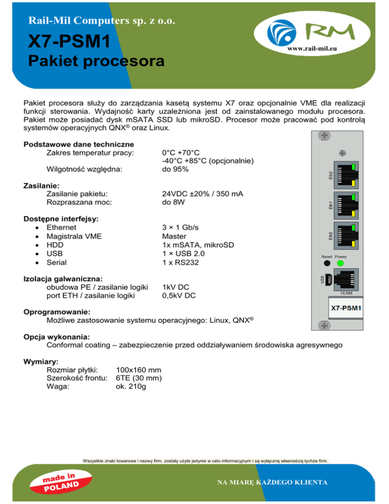 Rail-Mil Computers sp. z o.o. X7-PSM1 www.rail-mil.eu Pakiet procesora Pakiet procesora służy do zarządzania kasetą systemu X7 oraz opcjonalnie VME dla realizacji funkcji sterowania. Wydajność karty uzależniona jest od zainstalowanego modułu procesora. Pakiet może posiadać dysk mSATA SSD lub mikroSD. Procesor może pracować pod kontrolą systemów operacyjnych QNX® oraz Linux. Podstawowe dane techniczne Zakres temperatur pracy: Wilgotność względna: 0°C +70°C -40°C +85°C (opcjonalnie) do 95% Zasilanie: Zasilanie pakietu: Rozpraszana moc: 24VDC ±20% / 350 mA do 8W Dostępne interfejsy: Ethernet Magistrala VME HDD USB Serial 3 × 1 Gb/s Master 1x mSATA, mikroSD 1 × USB 2.0 1 x RS232 Izolacja galwaniczna: obudowa PE / zasilanie logiki port ETH / zasilanie logiki 1kV DC 0,5kV DC Oprogramowanie: Możliwe zastosowanie systemu operacyjnego: Linux, QNX® Opcja wykonania: Conformal coating – zabezpieczenie przed oddziaływaniem środowiska agresywnego Wymiary: Rozmiar płytki: Szerokość frontu: Waga: 100x160 mm 6TE (30 mm) ok. 210g Wszystkie znaki towarowe i nazwy firm, zostały użyte jedynie w celu informacyjnym i są wyłączną własnością tychże firm. . NA MIARĘ KAŻDEGO KLIENTA www.rail-mil.eu Widok karty Nazwa Numer katalogowy X7-PSM1 30552 Opis / Wersja SAMX6i ARM Dual 800MHz, 1GB DRAM, 4GB Flash NA MIARĘ KAŻDEGO KLIENTA Na miarę każdego klienta
