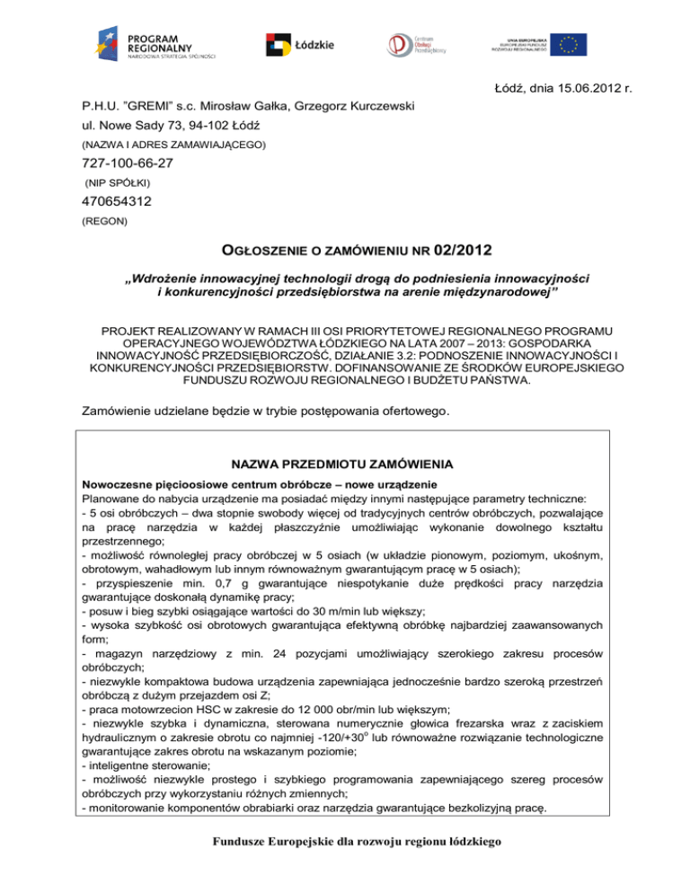Łódź, dnia 15.06.2012 r. P.H.U. ”GREMI” s.c. Mirosław Gałka, Grzegorz Kurczewski ul. Nowe Sady 73, 94-102 Łódź (NAZWA I ADRES ZAMAWIAJĄCEGO) 727-100-66-27 (NIP SPÓŁKI) 470654312 (REGON) OGŁOSZENIE O ZAMÓWIENIU NR 02/2012 „Wdrożenie innowacyjnej technologii drogą do podniesienia innowacyjności i konkurencyjności przedsiębiorstwa na arenie międzynarodowej” PROJEKT REALIZOWANY W RAMACH III OSI PRIORYTETOWEJ REGIONALNEGO PROGRAMU OPERACYJNEGO WOJEWÓDZTWA ŁÓDZKIEGO NA LATA 2007 – 2013: GOSPODARKA INNOWACYJNOŚĆ PRZEDSIĘBIORCZOŚĆ, DZIAŁANIE 3.2: PODNOSZENIE INNOWACYJNOŚCI I KONKURENCYJNOŚCI PRZEDSIĘBIORSTW. DOFINANSOWANIE ZE ŚRODKÓW EUROPEJSKIEGO FUNDUSZU ROZWOJU REGIONALNEGO I BUDŻETU PAŃSTWA. Zamówienie udzielane będzie w trybie postępowania ofertowego. NAZWA PRZEDMIOTU ZAMÓWIENIA Nowoczesne pięcioosiowe centrum obróbcze – nowe urządzenie Planowane do nabycia urządzenie ma posiadać między innymi następujące parametry techniczne: - 5 osi obróbczych – dwa stopnie swobody więcej od tradycyjnych centrów obróbczych, pozwalające na pracę narzędzia w każdej płaszczyźnie umożliwiając wykonanie dowolnego kształtu przestrzennego; - możliwość równoległej pracy obróbczej w 5 osiach (w układzie pionowym, poziomym, ukośnym, obrotowym, wahadłowym lub innym równoważnym gwarantującym pracę w 5 osiach); - przyspieszenie min. 0,7 g gwarantujące niespotykanie duże prędkości pracy narzędzia gwarantujące doskonałą dynamikę pracy; - posuw i bieg szybki osiągające wartości do 30 m/min lub większy; - wysoka szybkość osi obrotowych gwarantująca efektywną obróbkę najbardziej zaawansowanych form; - magazyn narzędziowy z min. 24 pozycjami umożliwiający szerokiego zakresu procesów obróbczych; - niezwykle kompaktowa budowa urządzenia zapewniająca jednocześnie bardzo szeroką przestrzeń obróbczą z dużym przejazdem osi Z; - praca motowrzecion HSC w zakresie do 12 000 obr/min lub większym; - niezwykle szybka i dynamiczna, sterowana numerycznie głowica frezarska wraz z zaciskiem hydraulicznym o zakresie obrotu co najmniej -120/+30o lub równoważne rozwiązanie technologiczne gwarantujące zakres obrotu na wskazanym poziomie; - inteligentne sterowanie; - możliwość niezwykle prostego i szybkiego programowania zapewniającego szereg procesów obróbczych przy wykorzystaniu różnych zmiennych; - monitorowanie komponentów obrabiarki oraz narzędzia gwarantujące bezkolizyjną pracę. Fundusze Europejskie dla rozwoju regionu łódzkiego Prosimy o przedstawienie ceny oferty w postaci tabeli: Lp Przedmiot zamówienia Jednostka miary Ilość 1 Nowoczesne pięcioosiowe centrum obróbcze szt. 1 Cena jednostkowa netto Wartość netto Stawka VAT (%) Wartość VAT Wartość brutto Razem OPIS KRYTERIÓW, KTÓRYMI FIRMA BĘDZIE SIĘ KIEROWAŁA PRZY WYBORZE OFERTY ORAZ ZNACZENIE TYCH KRYTERIÓW Maksymalna liczba punktów możliwych do uzyskania – 100 Lp. 1 Rodzaj Kryterium Cena Punktacja Sposób oceny Od 0 do 60 Oferent proponujący najniższą cenę otrzyma maksymalną liczbę punktów tj. 60. Kolejnym oferentom będą przyznawane punkty w następujący sposób: Liczba punktów badanej oferty = stosunek ceny w ofercie z najniższą ceną do ceny badanej oferty mnożony przez 60 Gwarancja 2 Od 0 do 20 (w miesiącach) Liczba punktów badanej oferty = stosunek okresu gwarancji w badanej ofercie do okresu gwarancji w ofercie z najdłuższą gwarancją mnożony przez 20 Oferent proponujący najkrótszy czas reakcji serwisowej otrzyma maksymalną liczbę punktów tj. 10. Kolejnym oferentom będą przyznawane punkty w następujący sposób: Czas reakcji serwisowej 3 Oferent proponujący najdłuższy okres gwarancji otrzyma maksymalną liczbę punktów tj. 20. Kolejnym oferentom będą przyznawane punkty w następujący sposób: Od 0 do 10 (w dniach roboczych) Liczba punktów badanej oferty = stosunek czasu reakcji serwisowej z oferty z najkrótszym czasem reakcji serwisowej do czasu reakcji serwisowej badanej oferty mnożony przez 10 Fundusze Europejskie dla rozwoju regionu łódzkiego 4 Warunki płatności (w dniach) Od 0 do 10 Oferent proponujący najkorzystniejsze warunki płatności (tj. najdłuższy termin płatności za fakturę/faktury) otrzyma maksymalną liczbę punktów tj. 10. Kolejnym oferentom będą przyznawane punkty w następujący sposób: Liczba punktów badanej oferty = stosunek warunków płatności w badanej ofercie do warunków płatności w ofercie z najkorzystniejszymi warunkami płatności mnożony przez 10 OPIS WARUNKÓW UDZIAŁU W POSTĘPOWANIU OFERTOWYM: Celem zapewnienia możliwości porównania ofert, prosimy by przesłana przez Państwa oferta zawierała Państwa dane rejestrowe oraz teleadresowe. Ponadto, prosimy o wskazanie okresu ważności oferty oraz o podanie terminu dostawy (termin dostawy należy podać w dniach roboczych od momentu zawarcia umowy na dostawę/złożenia zamówienia do dostarczenia przedmiotu zamówienia do siedziby zamawiającego) urządzenia. Dodatkowo prosimy wskazać również okres możliwej do udzielenia gwarancji, oferowanego czasu reakcji serwisowej oraz określić warunki płatności. Przedmiotem zamówienia musi być urządzenie posiadające certyfikat zgodności CE. Miejsce realizacji zamówienia: Dostawa, instalacja oraz uruchomienie urządzenia powinno nastąpić do siedziby firmy P.H.U. ”GREMI” s.c. Mirosław Gałka, Grzegorz Kurczewski, mieszczącej się pod adresem: ul. Nowe Sady 73, 94-102 Łódź Termin realizacji zamówienia: ostateczny termin dostawy, instalacji oraz uruchomienia urządzenia upływa w dniu 17.12.2012 r. Ostateczny termin składania ofert: 02.07.2012 r., godzina 15.00. Oferty wraz ze szczegółową specyfikacją należy składać osobiście lub listownie na adres: P.H.U. ”GREMI” s.c. Mirosław Gałka, Grzegorz Kurczewski ul. Nowe Sady 73, 94-102 Łódź Fundusze Europejskie dla rozwoju regionu łódzkiego Oferty składane list