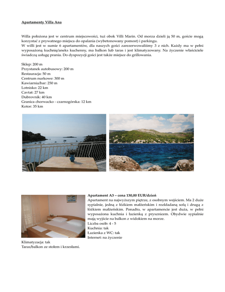 Apartamenty Villa Ana Willa położona jest w centrum miejscowości, tuż obok Villi Marin. Od morza dzieli ją 50 m, goście mogą korzystać z prywatnego miejsca do opalania (wybetonowany pomost) i parkingu. W willi jest w sumie 6 apartamentów, dla naszych gości zarezerwowaliśmy 3 z nich. Każdy ma w pełni wyposażoną kuchnię/aneks kuchenny, ma balkon lub taras i jest klimatyzowany. Na życzenie właściciele świadczą usługę prania. Do dyspozycji gości jest także miejsce do grillowania. Sklep: 200 m Przystanek autobusowy: 200 m Restauracja: 50 m Centrum nurkowe: 300 m Kawiarnia/bar: 250 m Lotnisko: 22 km Cavtat: 27 km Dubrovnik: 40 km Granica chorwacko - czarnogórska: 12 km Kotor: 35 km Apartament A3 – cena 130,00 EUR/dzień Apartament na najwyższym piętrze, z osobnym wejściem. Ma 2 duże sypialnie, jedną z łóżkiem małżeńskim i rozkładaną sofą i drugą z łóżkiem małżeńskim. Ponadto, w apartamencie jest duża, w pełni wyposażona kuchnia i łazienką z prysznicem. Obydwie sypialnie mają wyjście na balkon z widokiem na morze. Liczba osób: 4 - 5 Kuchnia: tak Łazienka z WC: tak Internet: na życzenie Klimatyzacja: tak Taras/balkon ze stołem i krzesłami. Apartament A4 + dodatkowy pokój – cena 110,00 EUR/dzień Apartament na najwyższym piętrze, z osobnym wejściem. W apartamencie jest jeden duży pokój z łóżkiem małżeńskim i rozkładaną sofą (dla 2 osób), w pełni wyposażona kuchnia, łazienka z prysznicem. Do apartamentu przylega duży, zacieniony taras. Apartament nadaje się dla rodziny lub 2 osób. Większa rodzina może wynająć ten apartament razem z dodatkowym pokojem, znajdującym się obok. Pokój także ma osobne wejście, nie ma w nim aneksu kuchennego, jest łazienka z prysznicem. Liczba osób: 4 (komfortowo w apartamencie i dodatkowym pokoju) Kuchnia: tak Łazienka z WC: tak Internet: na życzenie Klimatyzacja: tak Taras/balkon ze stołem i krzesłami. Apartament A5 – cena 90,00 EUR/dzień Apartament na najwyższym piętrze, z osobnym wejściem. W apartamencie jest jeden duży pokój z łóżkiem małżeńskim i rozkładaną sofą (dla 2 osób), w pełni wyposażona kuchnia, łazienka z prysznicem. Do apartamentu przylega duży, zacieniony taras. Apartament nadaje się dla rodziny 3-osobowej lub 2 osób. Liczba osób: 3 Kuchnia: tak Łazienka z WC: tak Internet: na życzenie Klimatyzacja: tak Taras/balkon ze stołem i krzesłami.