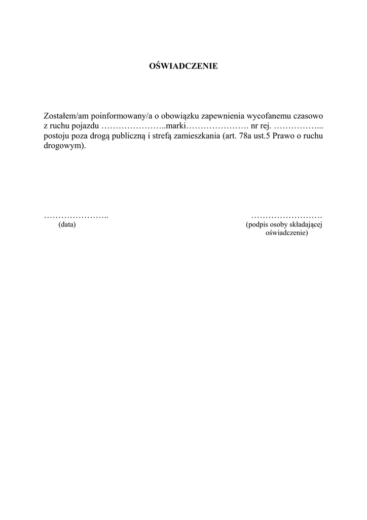 OŚWIADCZENIE Zostałem/am poinformowany/a o obowiązku zapewnienia wycofanemu czasowo z ruchu pojazdu …………………..marki…………………. nr rej. ……………... postoju poza drogą publiczną i strefą zamieszkania (art. 78a ust.5 Prawo o ruchu drogowym). ………………….. (data) ……………………. (podpis osoby składającej oświadczenie)
