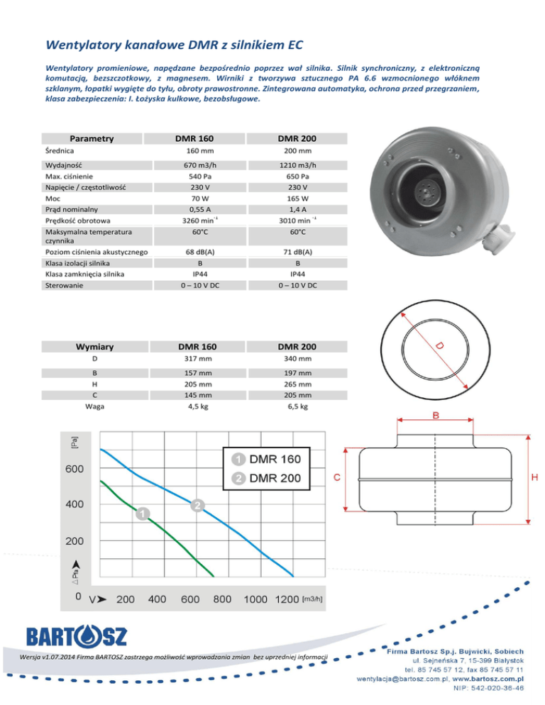 Wentylatory kanałowe DMR z silnikiem EC Wentylatory promieniowe, napędzane bezpośrednio poprzez wał silnika. Silnik synchroniczny, z elektroniczną komutacją, bezszczotkowy, z magnesem. Wirniki z tworzywa sztucznego PA 6.6 wzmocnionego włóknem szklanym, łopatki wygięte do tyłu, obroty prawostronne. Zintegrowana automatyka, ochrona przed przegrzaniem, klasa zabezpieczenia: I. Łożyska kulkowe, bezobsługowe. Parametry Średnica Wydajność Max. ciśnienie Napięcie / częstotliwość Moc Prąd nominalny Prędkość obrotowa Maksymalna temperatura czynnika Poziom ciśnienia akustycznego Klasa izolacji silnika Klasa zamknięcia silnika Sterowanie DMR 160 DMR 200 160 mm 200 mm 670 m3/h 540 Pa 230 V 70 W 0,55 A -1 3260 min 60°C 1210 m3/h 650 Pa 230 V 165 W 1,4 A -1 3010 min 60°C 68 dB(A) B IP44 0 – 10 V DC 71 dB(A) B IP44 0 – 10 V DC Wymiary DMR 160 DMR 200 D 317 mm 340 mm B H C Waga 157 mm 205 mm 145 mm 4,5 kg 197 mm 265 mm 205 mm 6,5 kg Wersja v1.07.2014 Firma BARTOSZ zastrzega możliwość wprowadzania zmian bez uprzedniej informacji