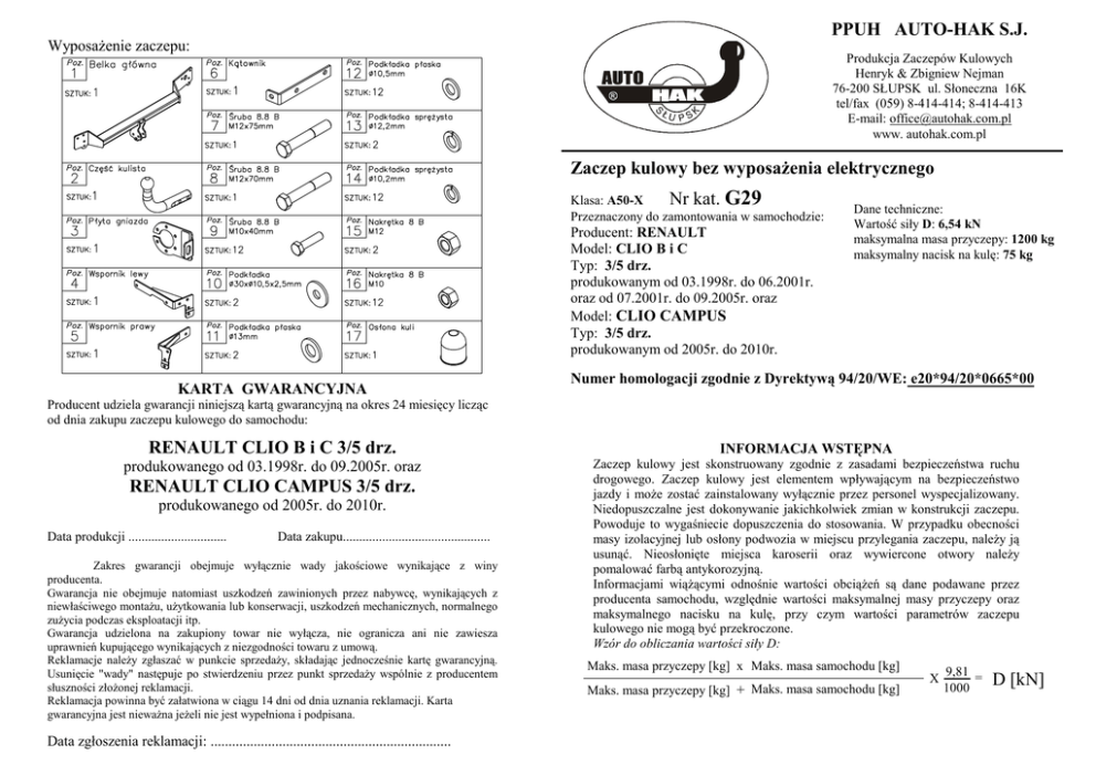 PPUH AUTO-HAK S.J. WyposaŜenie zaczepu: Produkcja Zaczepów Kulowych Henryk & Zbigniew Nejman 76-200 SŁUPSK ul. Słoneczna 16K tel/fax (059) 8-414-414; 8-414-413 E-mail: [email protected] www. autohak.com.pl Zaczep kulowy bez wyposaŜenia elektrycznego G29 Klasa: A50-X Nr kat. Przeznaczony do zamontowania w samochodzie: Producent: RENAULT Model: CLIO B i C Typ: 3/5 drz. produkowanym od 03.1998r. do 06.2001r. oraz od 07.2001r. do 09.2005r. oraz Model: CLIO CAMPUS Typ: 3/5 drz. produkowanym od 2005r. do 2010r. KARTA GWARANCYJNA Dane techniczne: Wartość siły D: 6,54 kN maksymalna masa przyczepy: 1200 kg maksymalny nacisk na kulę: 75 kg Numer homologacji zgodnie z Dyrektywą 94/20/WE: e20*94/20*0665*00 Producent udziela gwarancji niniejszą kartą gwarancyjną na okres 24 miesięcy licząc od dnia zakupu zaczepu kulowego do samochodu: RENAULT CLIO B i C 3/5 drz. INFORMACJA WSTĘPNA produkowanego od 03.1998r. do 09.2005r. oraz Zaczep kulowy jest skonstruowany zgodnie z zasadami bezpieczeństwa ruchu drogowego. Zaczep kulowy jest elementem wpływającym na bezpieczeństwo jazdy i moŜe zostać zainstalowany wyłącznie przez personel wyspecjalizowany. Niedopuszczalne jest dokonywanie jakichkolwiek zmian w konstrukcji zaczepu. Powoduje to wygaśniecie dopuszczenia do stosowania. W przypadku obecności masy izolacyjnej lub osłony podwozia w miejscu przylegania zaczepu, naleŜy ją usunąć. Nieosłonięte miejsca karoserii oraz wywiercone otwory naleŜy pomalować farbą antykorozyjną. Informacjami wiąŜącymi odnośnie wartości obciąŜeń są dane podawane przez producenta samochodu, względnie wartości maksymalnej masy przyczepy oraz maksymalnego nacisku na kulę, przy czym wartości parametrów zaczepu kulowego nie mogą być przekroczone. Wzór do obliczania wartości siły D: RENAULT CLIO CAMPUS 3/5 drz. produkowanego od 2005r. do 2010r. Data produkcji .............................. Data zakupu............................................. Zakres gwarancji obejmuje wyłącznie wady jakościowe wynikające z winy producenta. Gwarancja nie obejmuje natomiast uszkodzeń zawinionych przez nabywcę, wynikających z niewłaściwego montaŜu, uŜytkowania lub konserwacji, uszkodzeń mechanicznych, normalnego zuŜycia podczas eksploatacji itp. Gwarancja udzielona na zakupiony towar nie wyłącza, nie ogranicza ani nie zawiesza uprawnień kupującego wynikających z niezgodności towaru z umową. Reklamacje naleŜy zgłaszać w punkcie sprzedaŜy, składając jednocześnie kartę gwarancyjną. Usunięcie "wady" następuje po stwierdzeniu przez punkt sprzedaŜy wspólnie z producentem słuszności złoŜonej reklamacji. Reklamacja powinna być załatwiona w ciągu 14 dni od dnia uznania reklamacji. Karta gwarancyjna jest niewaŜna jeŜeli nie jest wypełniona i podpisana. Data zgłoszenia reklamacji: ................................................................... Maks. masa przyczepy [kg] x Maks. masa samochodu [kg] Maks. masa przyczepy [kg] + Maks. masa samochodu [kg] X 9,81 = 1000 D [kN] INSTRUKCJA MontaŜu i eksploatacji zaczepu kulowego Oznaczenie zacisku wg ISO PN 1 L 2 + 3 31 4 R 5 58R 6 54 7 58L D Łączenie przewodów Kolejność czynności przy montaŜu D 8 5 Kierunkowskazy lewe Tylne światła przeciwmgłowe Masa Kierunkowskazy prawe Światła pozycyjne prawe Światła hamowania Światła pozycyjne lewe B 6 A 9 C C 9 10 1 8 4 A 7 9 10 9 3 B 2 Zaczep kulowy przeznaczony jest do zamontowania w samochodzie: RENAULT CLIO B i C, 3/5 drz., produkowanym od 03.1998r. do 09.2005r. oraz RENAULT CLIO CAMPUS, 3/5 drz., produkowanym od 2005r. do 2010r., numer katalogowy G29 i słuŜy do ciągnięcia przyczep o masie całkowitej 1200 kg i nacisku na kulę max 75 kg. OD PRODUCENTA Dziękujemy za wybór produkowanego przez naszą firmę zaczepu kulowego. Jego niezawodność została potwierdzona licznymi testami oraz opiniami zadowolonych klientów. JednakŜe niezawodność zaczepów kulowych jest zaleŜna równieŜ od prawidłowego montaŜu oraz prawidłowej eksploatacji. Z tego powodu prosimy Państwa o staranne przeczytanie niniejszej instrukcji montaŜu oraz przestrzeganie właściwych wskazówek. Zaczep naleŜy zamontować w miejscach do tego celu przeznaczonych przez producenta samochodu. 1. Zdemontować zderzak. 2. Do podłuŜnicy z prawej strony pojazdu do fabrycznych otworów przyłoŜyć wsporniki (poz. 5 i 6): - wspornik (poz. 5) przyłoŜyć z prawej strony, - wspornik (poz. 6) przyłoŜyć z lewej strony, i skręcić śrubami M10x40mm (poz. 9) poprzez otwory (poz. D). 3. Do podłuŜnicy z lewej strony pojazdu do fabrycznych otworów przyłoŜyć wspornik lewy (poz. 4) i skręcić śrubami M10x40mm (poz. 9) poprzez otwory (poz. C). 4. Do tylnego płata pojazdu przyłoŜyć belkę główną zaczepu (poz. 1) i skręcić poprzez fabryczne otwory oraz otwory (poz. A i B) śrubami M10x40mm. 5. Zamontować zderzak. 6. Dokręcić wszystkie śruby z momentem, jak pokazano w tabeli. 7. Przykręcić część kulistą zaczepu (poz. 2) wraz z blachą pod gniazdo (poz. 3) śrubami M12x75mm (poz. 7) oraz M12x70mm (poz. 8) z wyposaŜenia. 8. Podłączyć przewody z gniazdka 7 – bieg. do instalacji elektrycznej zgodnie z instrukcją fabryczną samochodu (zaleca się wykonanie w ASO). 9. Uzupełnić ewentualne ubytki powłoki malarskiej zaczepu powstałe w trakcie montaŜu. Zalecany moment skręcający dla śrub i nakrętek 8,8: M6 - 11 Nm M8 - 25 Nm M10 - 50 Nm M12 - 87 Nm M14 - 138 Nm M16 - 210 Nm UWAGA Po zamontowaniu zaczepu kulowego naleŜy uzyskać wpis w dowodzie rejestracyjnym pojazdu na „stacji kontroli pojazdów” właściwej dla miejsca zamieszkania. Samochód powinien być wyposaŜony w : -kierunkowskazy boczne -lusterka boczne o rozstawie co najmniej szerokości przyczepy Sprawdzać śruby mocujące zaczepu kulowego po około 1 000 km przebiegu eksploatacji. Kula zaczepu musi być utrzymana w czystości i konserwowana smarem stałym