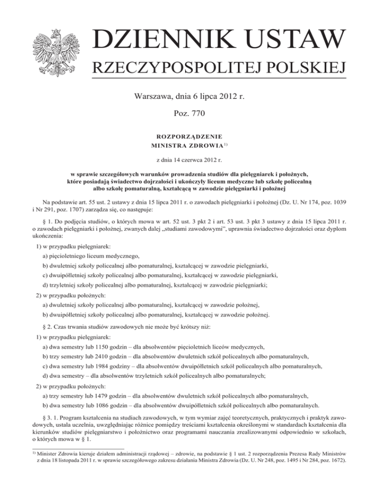 DZIENNIK USTAW RZECZYPOSPOLITEJ POLSKIEJ Warszawa, dnia 6 lipca 2012 r. Poz. 770 ROZPORZĄDZENIE MINISTRA ZDROWIA 1) z dnia 14 czerwca 2012 r. w sprawie szczegółowych warunków prowadzenia studiów dla pielęgniarek i położnych, które posiadają świadectwo dojrzałości i ukończyły liceum medyczne lub szkołę policealną albo szkołę pomaturalną, kształcącą w zawodzie pielęgniarki i położnej Na podstawie art. 55 ust. 2 ustawy z dnia 15 lipca 2011 r. o zawodach pielęgniarki i położnej (Dz. U. Nr 174, poz. 1039 i Nr 291, poz. 1707) zarządza się, co następuje: § 1. Do podjęcia studiów, o których mowa w art. 52 ust. 3 pkt 2 i art. 53 ust. 3 pkt 3 ustawy z dnia 15 lipca 2011 r. o zawodach pielęgniarki i położnej, zwanych dalej „studiami zawodowymi”, uprawnia świadectwo dojrzałości oraz dyplom ukończenia: 1) w przypadku pielęgniarek: a) pięcioletniego liceum medycznego, b) dwuletniej szkoły policealnej albo pomaturalnej, kształcącej w zawodzie pielęgniarki, c) dwuipółletniej szkoły policealnej albo pomaturalnej, kształcącej w zawodzie pielęgniarki, d) trzyletniej szkoły policealnej albo pomaturalnej, kształcącej w zawodzie pielęgniarki; 2) w przypadku położnych: a) dwuletniej szkoły policealnej albo pomaturalnej, kształcącej w zawodzie położnej, b) dwuipółletniej szkoły policealnej albo pomaturalnej, kształcącej w zawodzie położnej. § 2. Czas trwania studiów zawodowych nie może być krótszy niż: 1) w przypadku pielęgniarek: a) dwa semestry lub 1150 godzin – dla absolwentów pięcioletnich liceów medycznych, b) trzy semestry lub 2410 godzin – dla absolwentów dwuletnich szkół policealnych albo pomaturalnych, c) dwa semestry lub 1984 godziny – dla absolwentów dwuipółletnich szkół policealnych albo pomaturalnych, d) dwa semestry – dla absolwentów trzyletnich szkół policealnych albo pomaturalnych; 2) w przypadku położnych: a) trzy semestry lub 1479 godzin – dla absolwentów dwuletnich szkół policealnych albo pomaturalnych, b) dwa semestry lub 1086 godzin – dla absolwentów dwuipółletnich szkół policealnych albo pomaturalnych. § 3. 1. Program kształcenia na studiach zawodowych, w tym wymiar zajęć teoretycznych, praktycznych i praktyk zawodowych, ustala uczelnia, uwzględniając różnice pomiędzy treściami kształcenia określonymi w standardach kształcenia dla kierunków studiów pielęgniarstwo i położnictwo oraz programami nauczania zrealizowanymi odpowiednio w szkołach, o których mowa w § 1. 1) inister Zdrowia kieruje działem administracji rządowej – zdrowie, na podstawie § 1 ust. 2 rozporządzenia Prezesa Rady Ministrów M z dnia 18 listopada 2011 r. w sprawie szczegółowego zakresu działania Ministra Zdrowia (Dz. U. Nr 248, poz. 1495 i Nr 284, poz. 1672). Dziennik Ustaw –2– Poz. 770 2. Program kształcenia dla pielęgniarek, o których mowa w § 2 pkt 1 lit. a, uczelnia ustala, uwzględniając wymagania dotyczące treści kształcenia określone w załączniku do rozporządzenia. 3. Program kształcenia: 1) dla pielęgniarek, o których mowa w § 2 pkt 1 lit. a, obejmuje kształcenie teoretyczne stanowiące nie mniej niż 400 godzin programu kształcenia i kształcenie praktyczne stanowiące nie mniej niż 750 godzin tego programu; 2) dla pielęgniarek, o których mowa w § 2 pkt 1 lit. b–d, oraz położnych, o których mowa w § 2 pkt 2, obejmuje kształcenie teoretyczne stanowiące nie mniej niż 33% programu kształcenia i kształcenie praktyczne stanowiące nie mniej niż 50% tego programu. 4. Przewidziane w programie kształcenia zajęcia praktyczne i praktyki zawodowe mogą zostać zaliczone na wniosek studenta na podstawie udokumentowanego doświadczenia zawodowego, w zakresie wykonywanych czynności odpowiadających przedmiotowi zajęć praktycznych lub praktyk zawodowych, z uwzględnieniem długości stażu pracy, w przypadku: 1) pielęgniarek, o których mowa w § 2 pkt 1 lit. a, nie więcej jednak niż 30% wymiaru tych zajęć i praktyk; 2) pielęgniarek, o których mowa w § 2 pkt 1 lit. b–d, oraz położnych, o których mowa w § 2 pkt 2, nie więcej jednak niż 50% wymiaru tych zajęć i praktyk. 5. Zaliczenia zajęć praktycznych i praktyk zawodowych dokonuje kierownik podstawowej jednostki organizacyjnej uczelni prowadzącej studia zawodowe, po zasięgnięciu opinii Krajowej Rady Akredytacyjnej Szkół Pielęgniarek i Położnych. 6. Zajęcia zrealizowane w ramach programu nauczania w szkołach, o których mowa w § 1, odnotowuje w indeksie kierownik jednostki, o którym mowa w ust. 5. § 4. 1. Po zaliczeniu przewidzianych programem kształcenia na studiach zawodowych zajęć teoretycznych i praktycznych oraz praktyk zawodowych student przystępuje do teoretycznego i praktycznego egzaminu kończącego studia zawodowe. 2. Terminy i miejsce egzaminów oraz komisję egzaminacyjną wyznacza kierownik jednostki, o którym mowa w § 3 ust. 5. 3. W skład komisji egzaminacyjnej wchodzi przewodniczący komisji egzaminacyjnej i członkowie komisji egzaminacyjnej. 4. O terminach i miejscu egzaminów kierownik jednostki, o którym mowa w § 3 ust. 5, zawiadamia studenta oraz komisję egzaminacyjną, w terminie nie krótszym niż 14 dni przed dniem egzaminu. 5. Egzamin teoretyczny i praktyczny nie może być przeprowadzany w tym samym dniu. 6. Komisja egzaminacyjna ocenia łącznie wyniki egzaminu teoretycznego i praktycznego, podejmując uchwałę zwykłą większością głosów. W razie równej liczby głosów decyduje głos przewodniczącego komisji egzaminacyjnej. 7. Ocenę łączną egzaminu kończącego studia zawodowe określa się łącznym stopniem: celujący, bardzo dobry, dobry, dostateczny, niedostateczny. 8. Z przebiegu egzaminu kończącego studia zawodowe wyznaczony przez przewodniczącego komisji egzaminacyjnej członek komisji egzaminacyjnej sporządza protokół, który podpisują przewodniczący i członkowie komisji egzaminacyjnej; protok