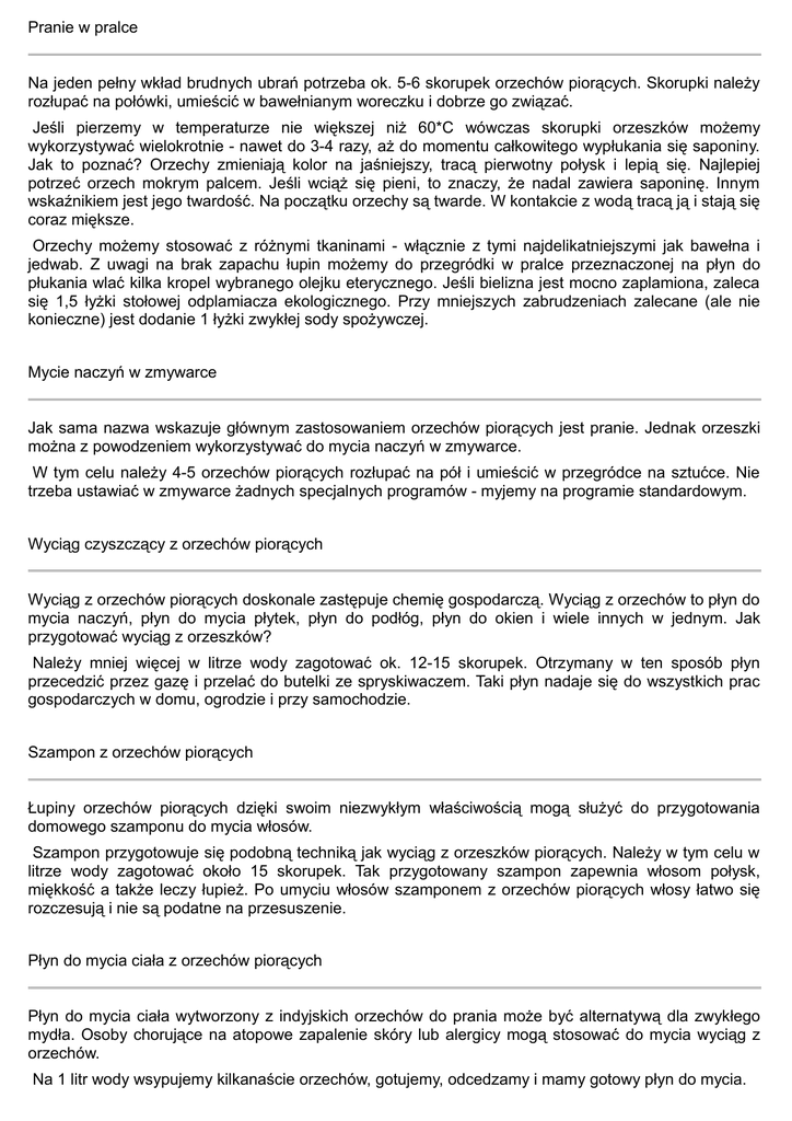 Pranie w pralce Na jeden pełny wkład brudnych ubrań potrzeba ok. 5-6 skorupek orzechów piorących. Skorupki należy rozłupać na połówki, umieścić w bawełnianym woreczku i dobrze go związać. Jeśli pierzemy w temperaturze nie większej niż 60*C wówczas skorupki orzeszków możemy wykorzystywać wielokrotnie - nawet do 3-4 razy, aż do momentu całkowitego wypłukania się saponiny. Jak to poznać? Orzechy zmieniają kolor na jaśniejszy, tracą pierwotny połysk i lepią się. Najlepiej potrzeć orzech mokrym palcem. Jeśli wciąż się pieni, to znaczy, że nadal zawiera saponinę. Innym wskaźnikiem jest jego twardość. Na początku orzechy są twarde. W kontakcie z wodą tracą ją i stają się coraz miększe. Orzechy możemy stosować z różnymi tkaninami - włącznie z tymi najdelikatniejszymi jak bawełna i jedwab. Z uwagi na brak zapachu łupin możemy do przegródki w pralce przeznaczonej na płyn do płukania wlać kilka kropel wybranego olejku eterycznego. Jeśli bielizna jest mocno zaplamiona, zaleca się 1,5 łyżki stołowej odplamiacza ekologicznego. Przy mniejszych zabrudzeniach zalecane (ale nie konieczne) jest dodanie 1 łyżki zwykłej sody spożywczej. Mycie naczyń w zmywarce Jak sama nazwa wskazuje głównym zastosowaniem orzechów piorących jest pranie. Jednak orzeszki można z powodzeniem wykorzystywać do mycia naczyń w zmywarce. W tym celu należy 4-5 orzechów piorących rozłupać na pół i umieścić w przegródce na sztućce. Nie trzeba ustawiać w zmywarce żadnych specjalnych programów - myjemy na programie standardowym. Wyciąg czyszczący z orzechów piorących Wyciąg z orzechów piorących doskonale zastępuje chemię gospodarczą. Wyciąg z orzechów to płyn do mycia naczyń, płyn do mycia płytek, płyn do podłóg, płyn do okien i wiele innych w jednym. Jak przygotować wyciąg z orzeszków? Należy mniej więcej w litrze wody zagotować ok. 12-15 skorupek. Otrzymany w ten sposób płyn przecedzić przez gazę i przelać do butelki ze spryskiwaczem. Taki płyn nadaje się do wszystkich prac gospodarczych w domu, ogrodzie i przy samochodzie. Szampon z orzechów piorących Łupiny orzechów piorących dzięki swoim niezwykłym właściwością mogą służyć do przygotowania domowego szamponu do mycia włosów. Szampon przygotowuje się podobną techniką jak wyciąg z orzeszków piorących. Należy w tym celu w litrze wody zagotować około 15 skorupek. Tak przygotowany szampon zapewnia włosom połysk, miękkość a także leczy łupież. Po umyciu włosów szamponem z orzechów piorących włosy łatwo się rozczesują i nie są podatne na przesuszenie. Płyn do mycia ciała z orzechów piorących Płyn do mycia ciała wytworzony z indyjskich orzechów do prania może być alternatywą dla zwykłego mydła. Osoby chorujące na atopowe zapalenie skóry lub alergicy mogą stosować do mycia wyciąg z orzechów. Na 1 litr wody wsypujemy kilkanaście orzechów, gotujemy, odcedzamy i mamy gotowy płyn do mycia.